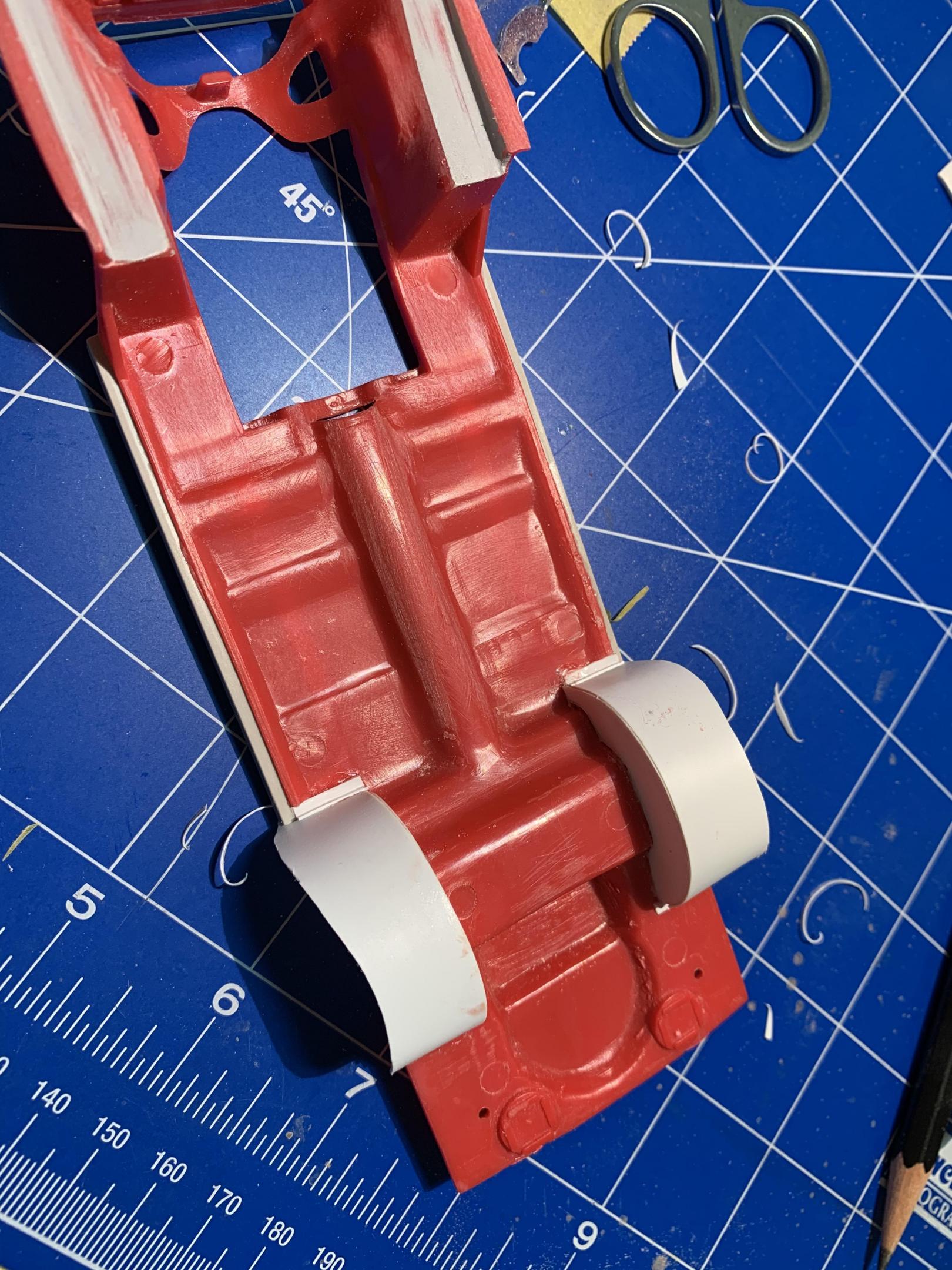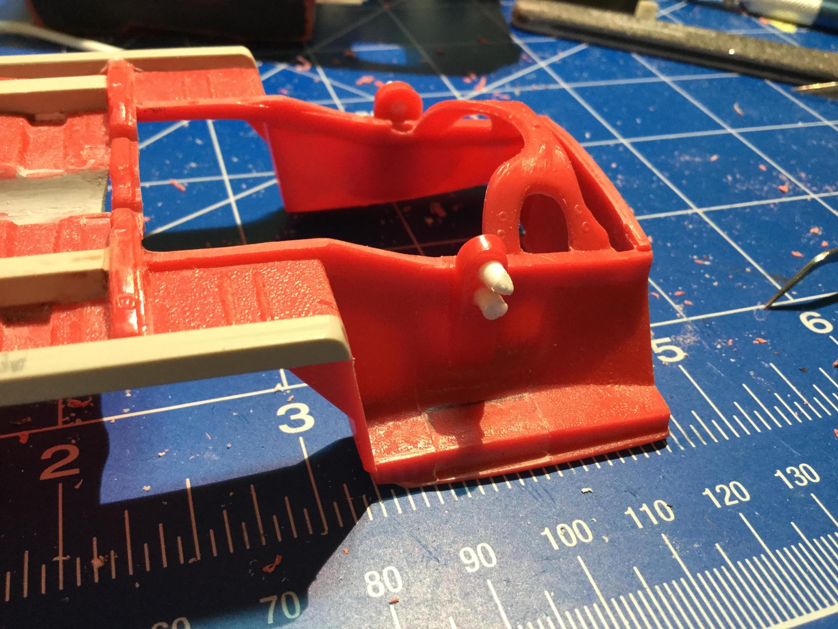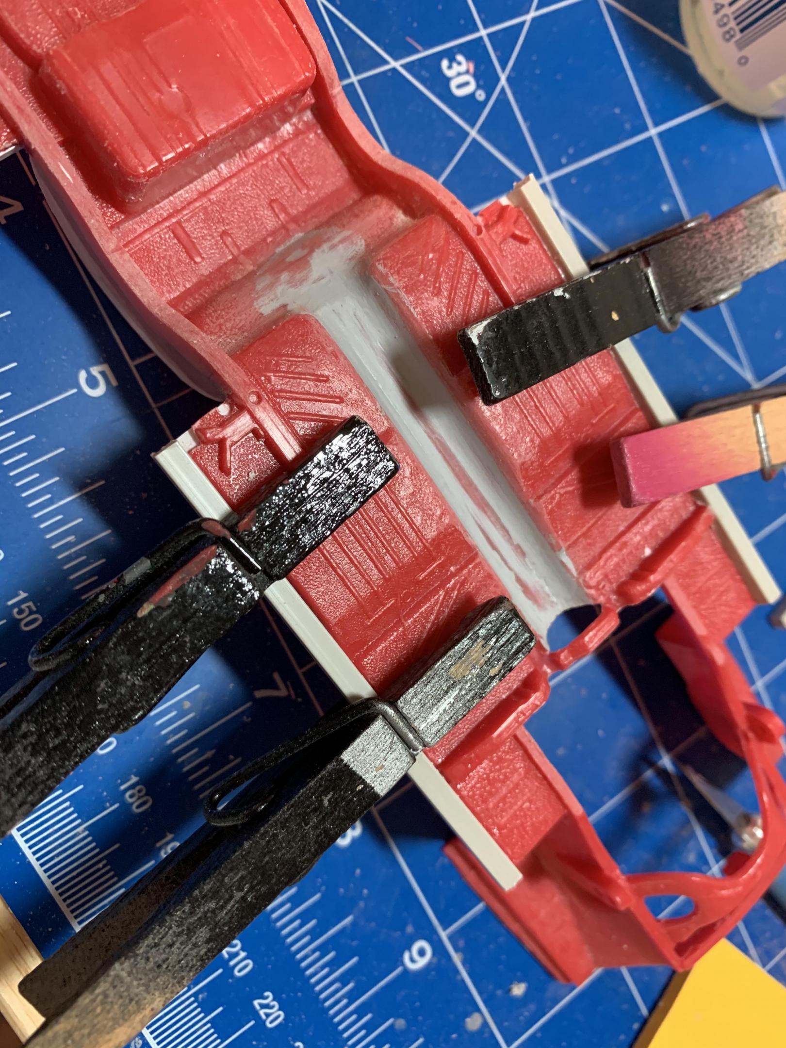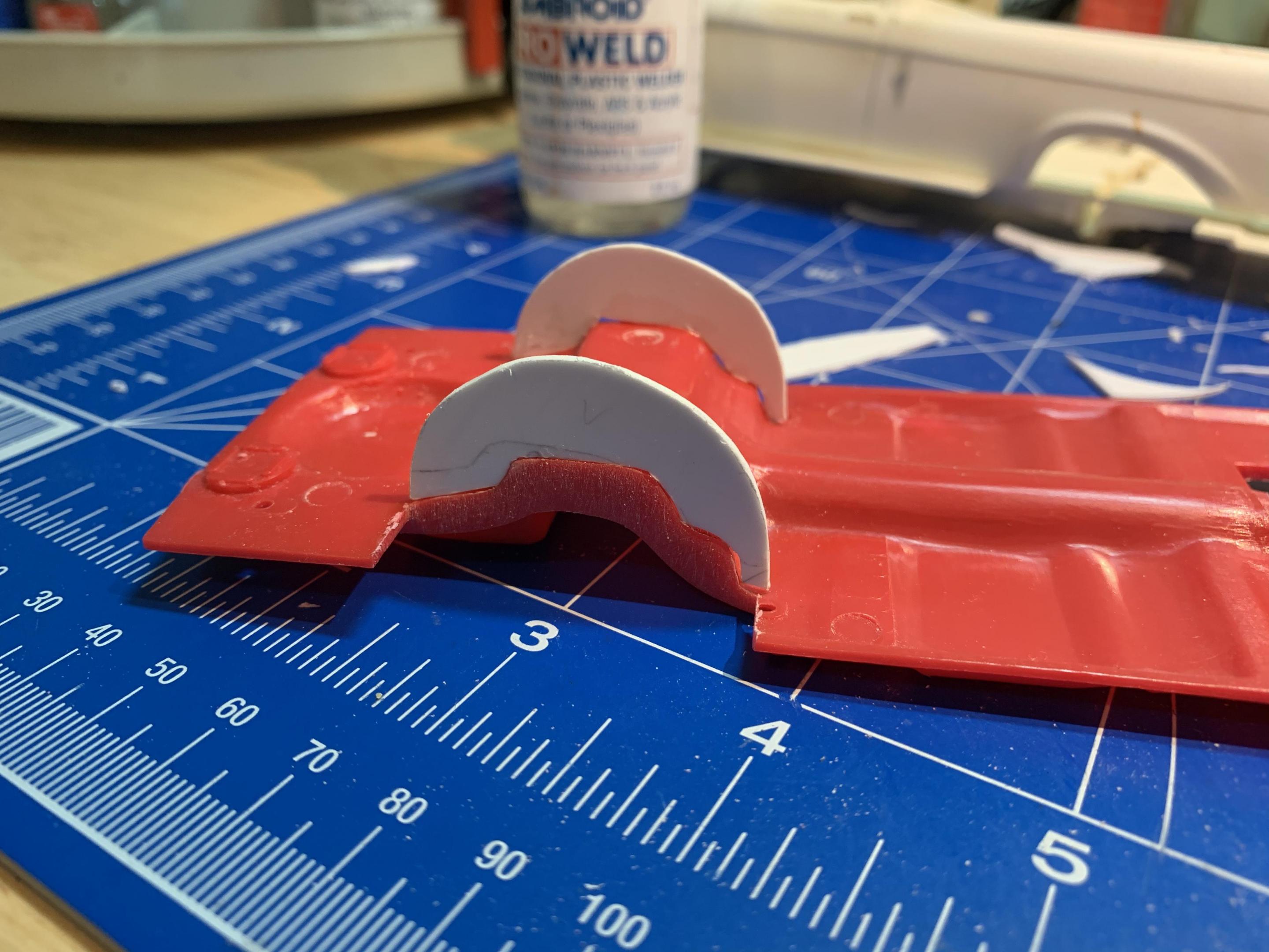 The 72 car had Cragar Trick wheels, the kit came with the 71 Fenton wheels, I struggled with this as I wanted the originality of the kit to remain intact. I only had the kits rear wheels, so I opted to go with the Tricks. I returned to getting the car to sit right and the wheel falls right between the original mount holes so I’m filling them and will drill new holes for the front wheels.