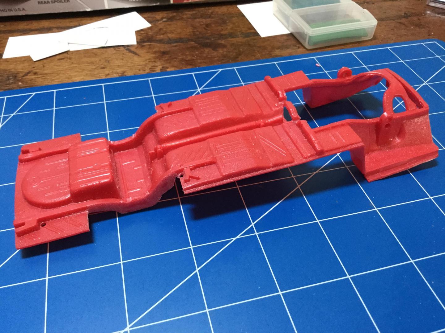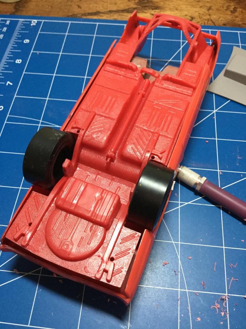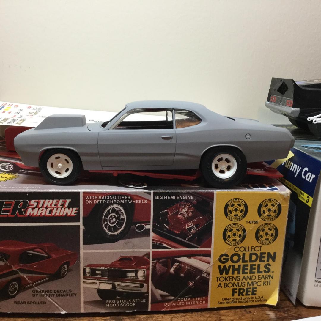 Quick update. I decided to keep as much of it the original MPC kit. I test fit both the AMT Duster and the Revell Dart chassis’. Both seemed more work than it was worth, at one point it seemed easier to swap the tail light panel from the California Flash kit to the AMT Duster, but that would totally defeat my purpose. I removed the rear wheel openings and chiseled the drive shaft off. I sanded the details off the front aprons. Some brushable primer surfacer, now a little drying time while I work on subframe connectors.