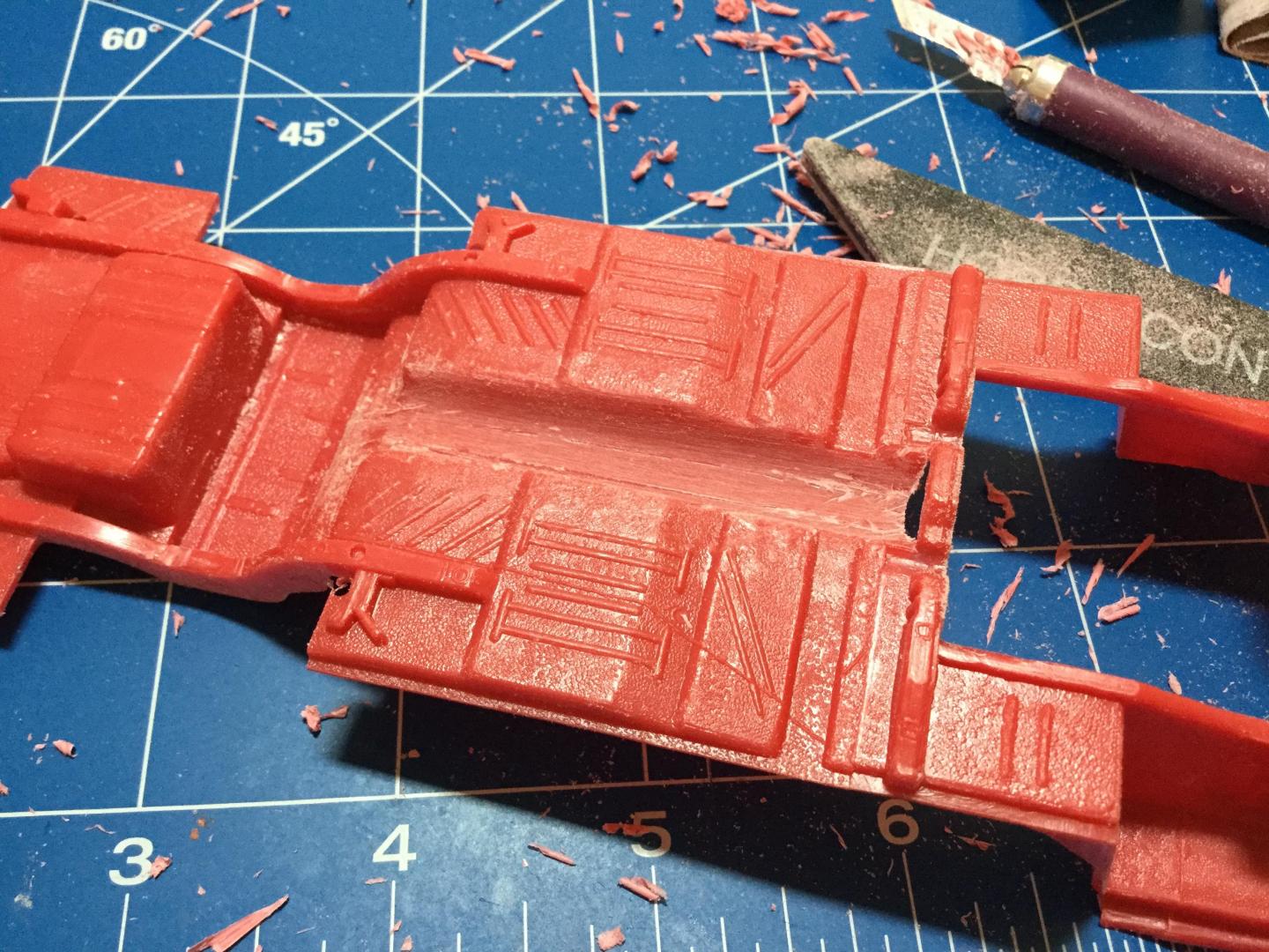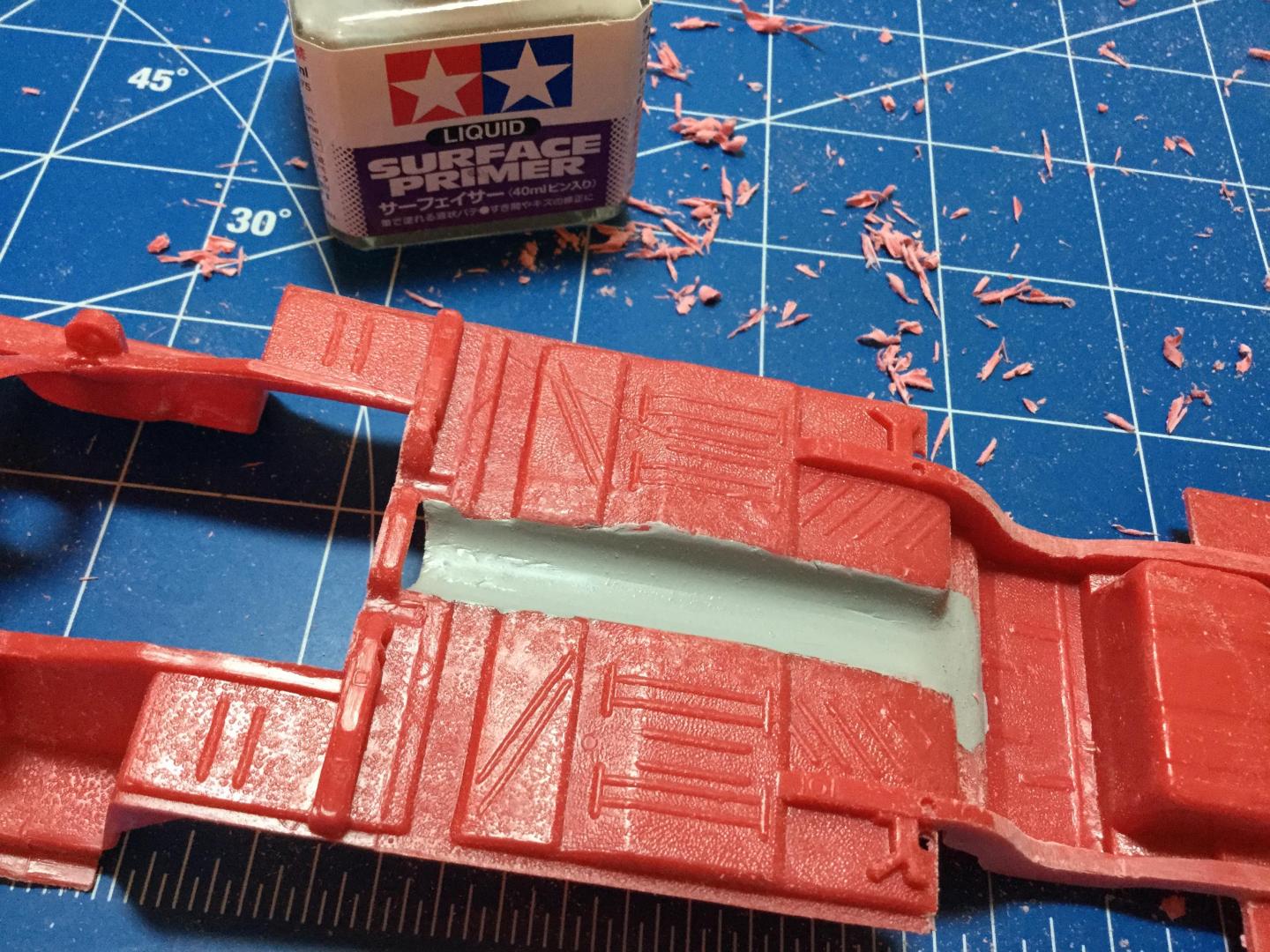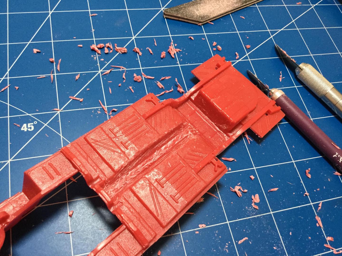 Quick update. I decided to keep as much of it the original MPC kit. I test fit both the AMT Duster and the Revell Dart chassis’. Both seemed more work than it was worth, at one point it seemed easier to swap the tail light panel from the California Flash kit to the AMT Duster, but that would totally defeat my purpose. I removed the rear wheel openings and chiseled the drive shaft off. I sanded the details off the front aprons. Some brushable primer surfacer, now a little drying time while I work on subframe connectors.