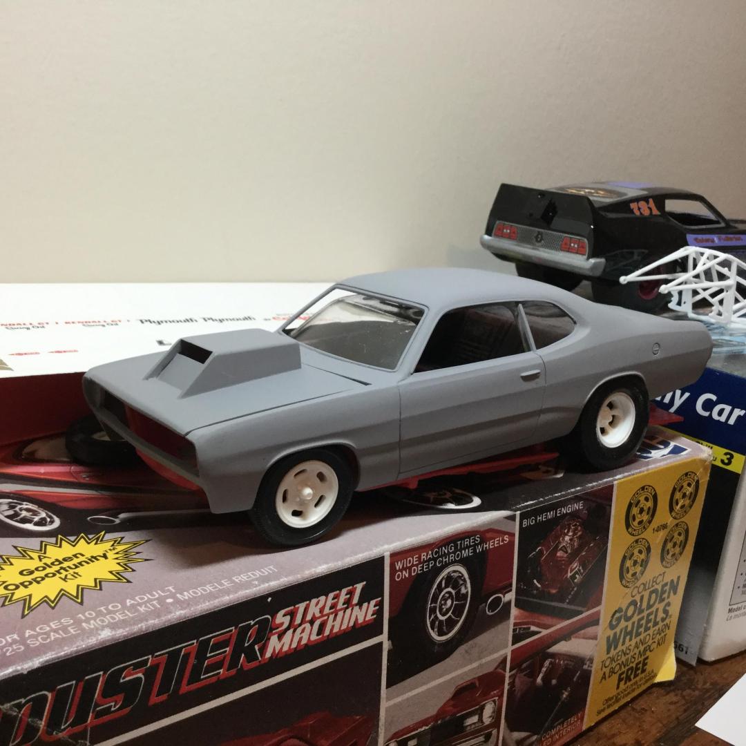 I cut the rear wheel wells out of the Sport chassis... still a snug fit for the slicks. Body cleaned up and the first coat of primer. Mocked up with the Sport chassis. I’m gonna look at the Duster chassis.
