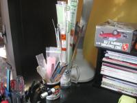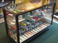 ]My wife is an Interior Decorator, and she likes our house to reflect this, its important for everything to have "THE LQQK". This is'nt a bad thing and most of the very cool things I have in my office/ model room have come from her. One of my display cases is my favorite. It came from a store in a small town here in Illinois. Its a true antique with original top, front and side glass all very wavy. The glass shelves were missing as was the rear sliding doors. I'm no carpenter but I did Manage to hobbel out two new sliding door made of beadboard and MDF. I purchased new glass shelves from a local glass shop. Being an antique it has no provision for lighting,so I positioned the display case under two can light in the ceiling. I dont hardly have $200.00 in the whole thing and it houses my collection of 1320 Diecast, and 28 plastc builds, as well as old AMT and Revell parts packs. I also display vintage AMT Kandy Kolor spray cans as well as an assortment of Glue tubes in various stages of emptyness, lastly, strewn about is race track ticket stubs from drag races I"ve attended over the years .
