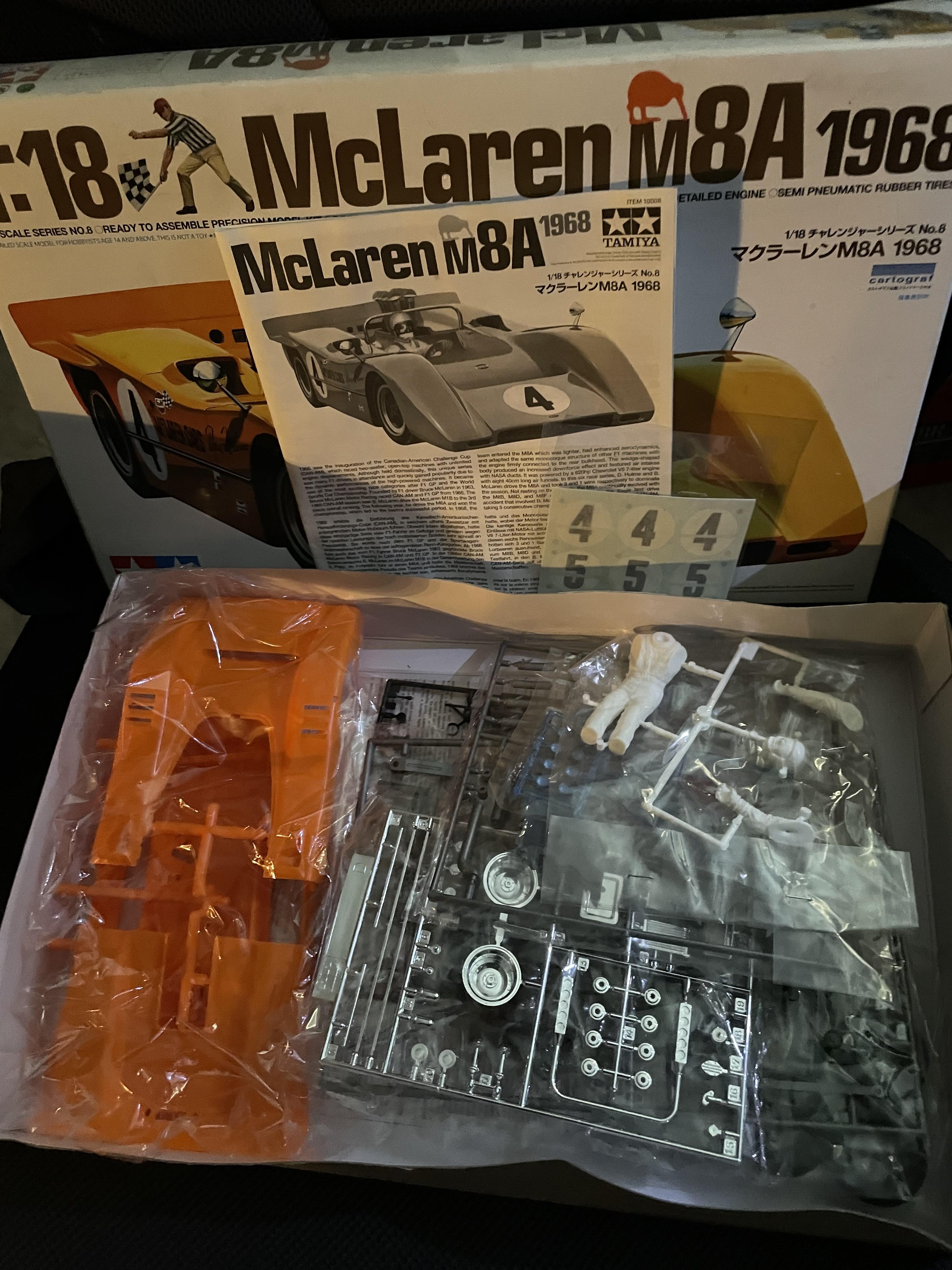 A McLaren m8a tamiya kit. The orange parts are out of bags but the rest is bagged. All parts are there. Looking for Fujimi Ferrari street cars. Fujimi cobras. Same value or close. I have all Ferrari f1 kits, so no f1.