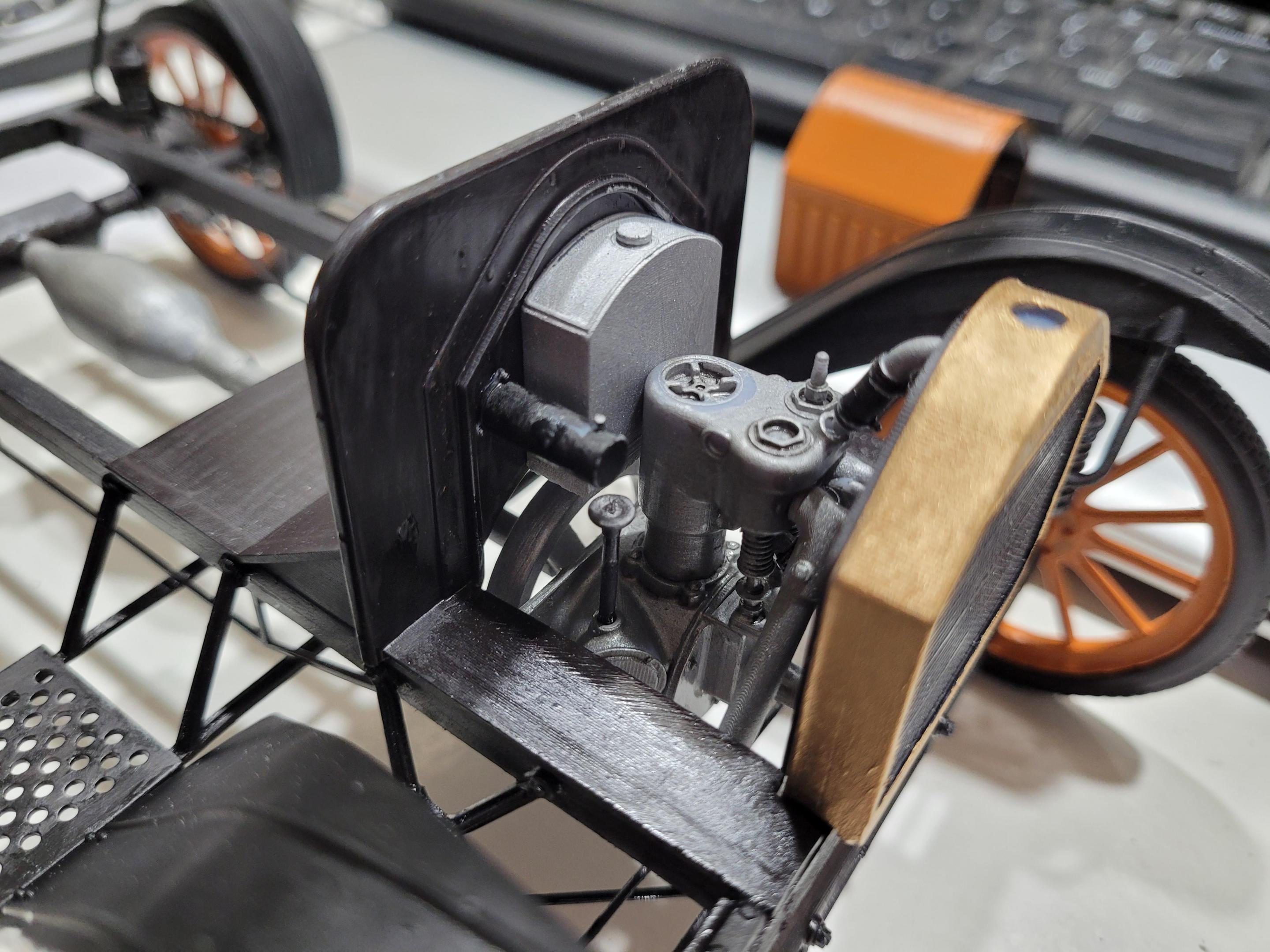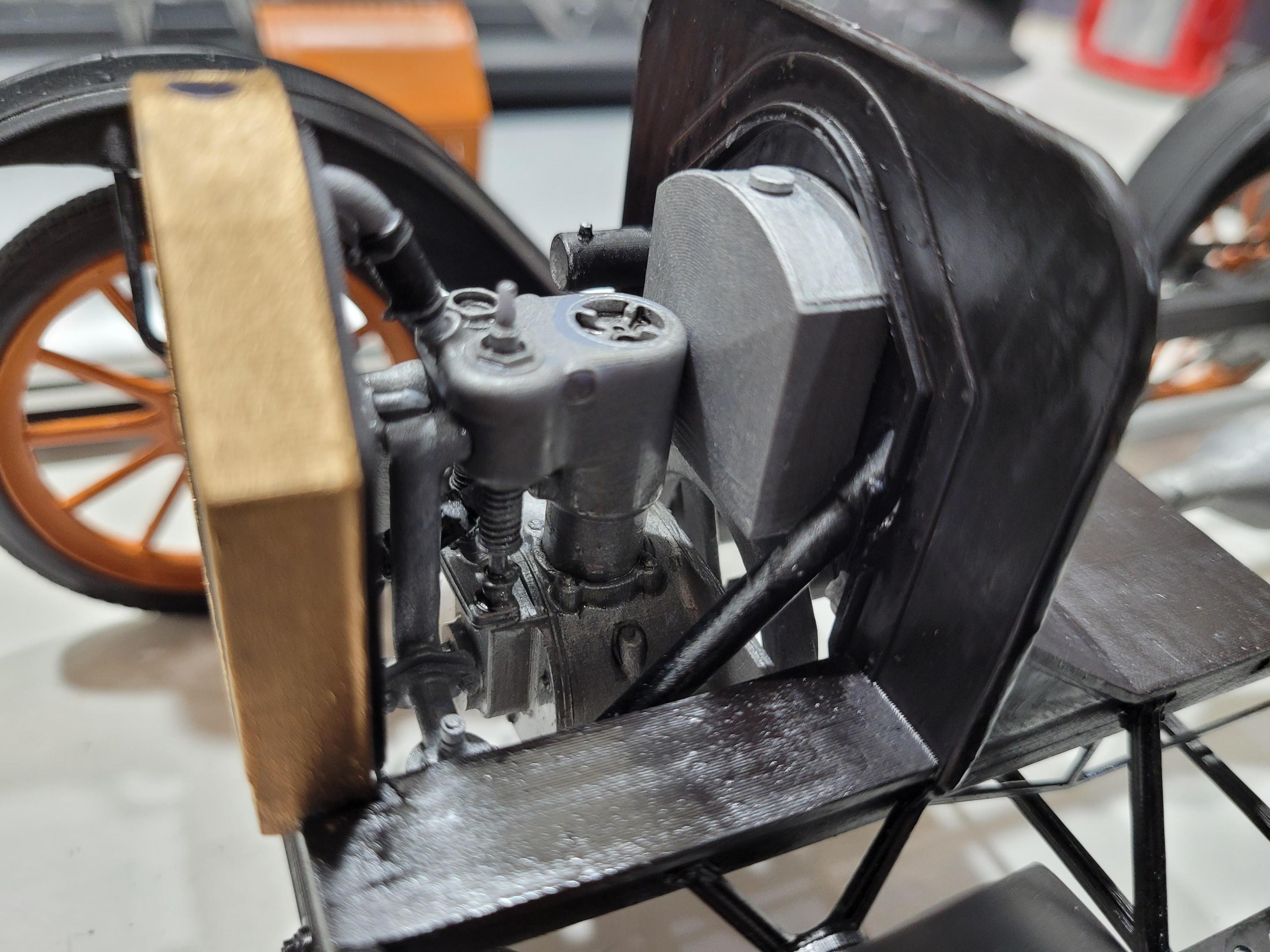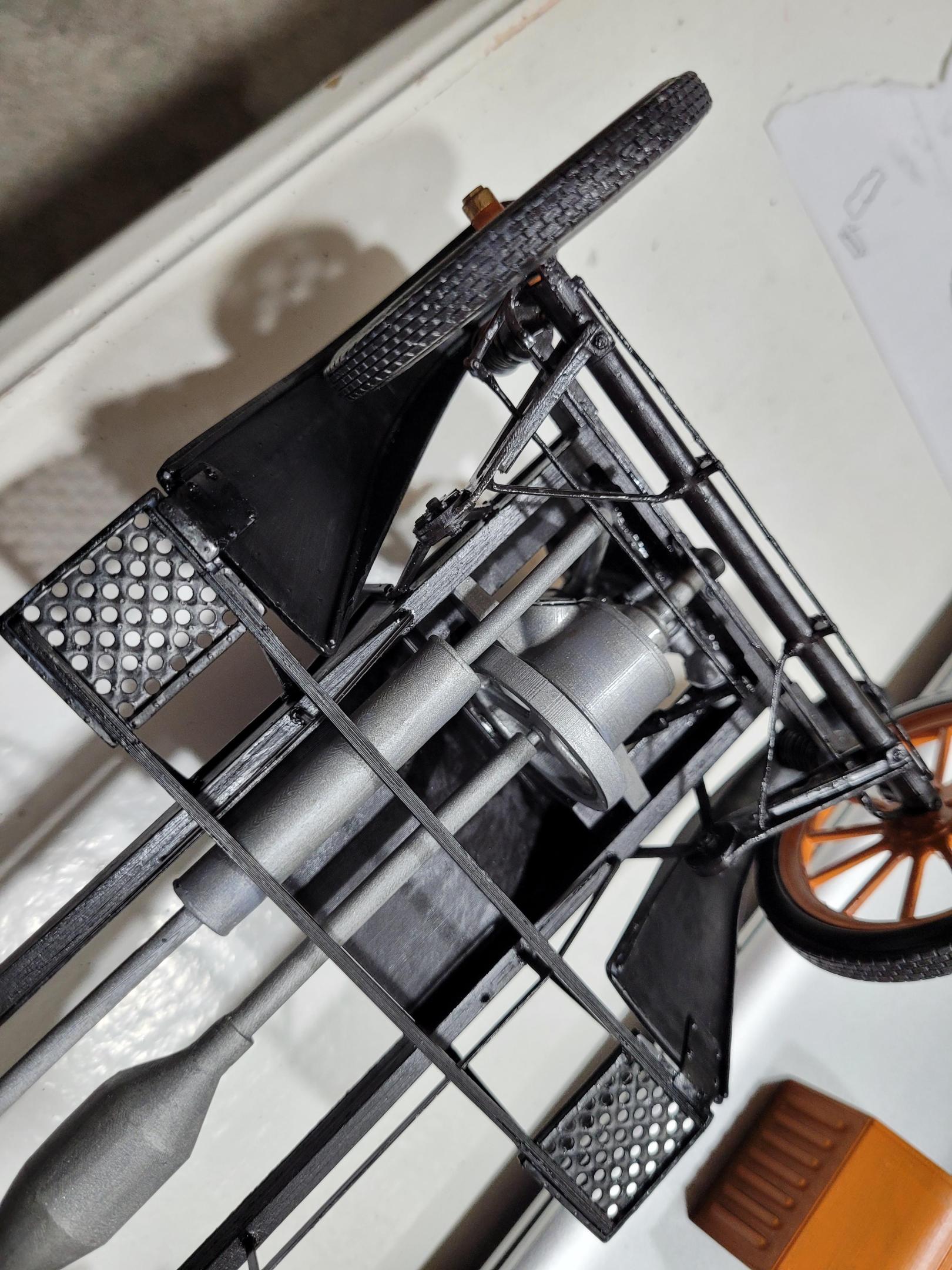The engine sitting in its place. Also looks like the weight and flats on the bottom of the tires are enough to keep the loose parts on the front suspension stable and straight.