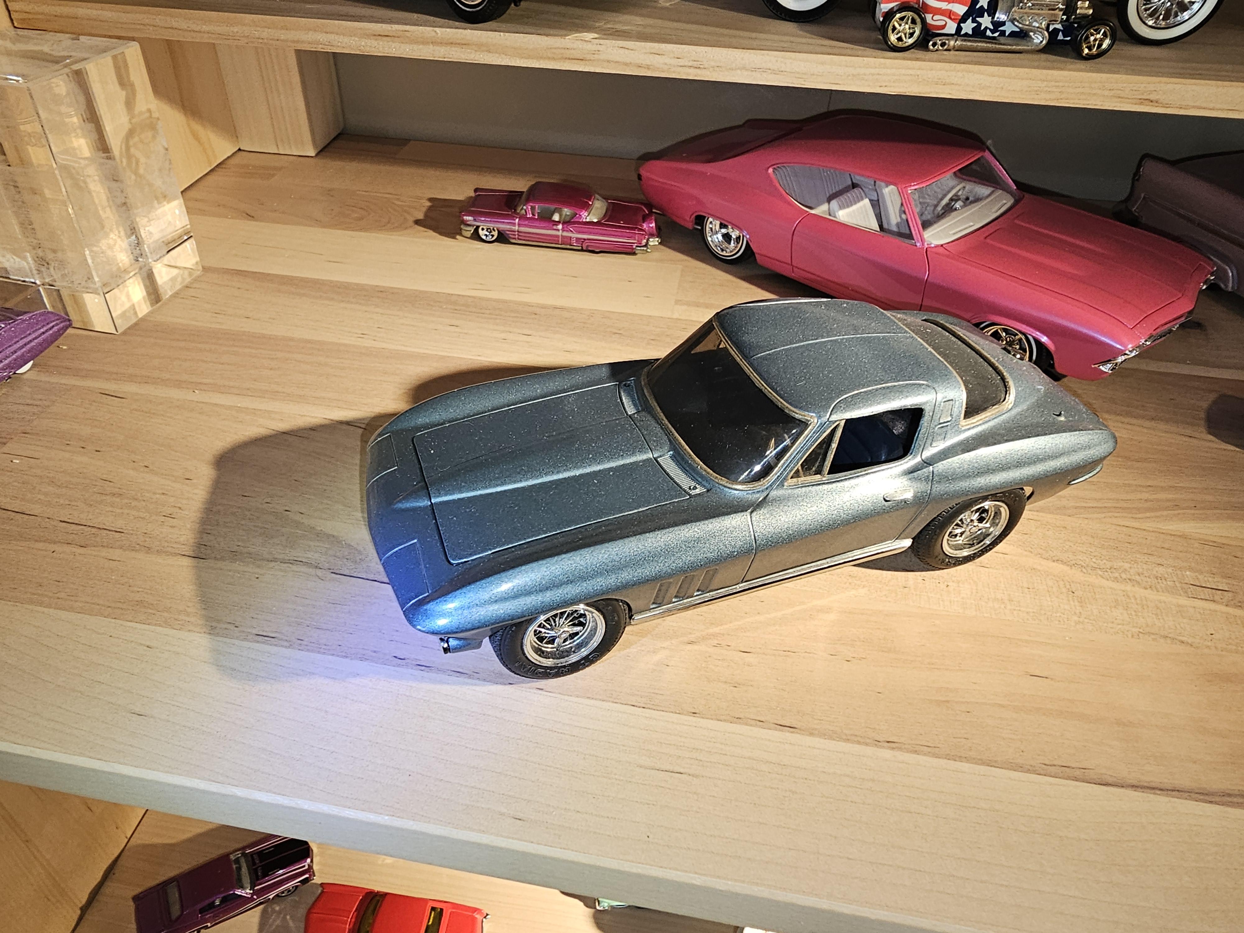 Monogram 'Vette Street Machine from 1986. It's painted with Testors Model Masters spray (my last paint job before I bought an airbrush), AMT 65 Riviera wire wheels, & a small block engine swap. The chrome bumpers turned black, a few bunch of years ago, so I took them off.