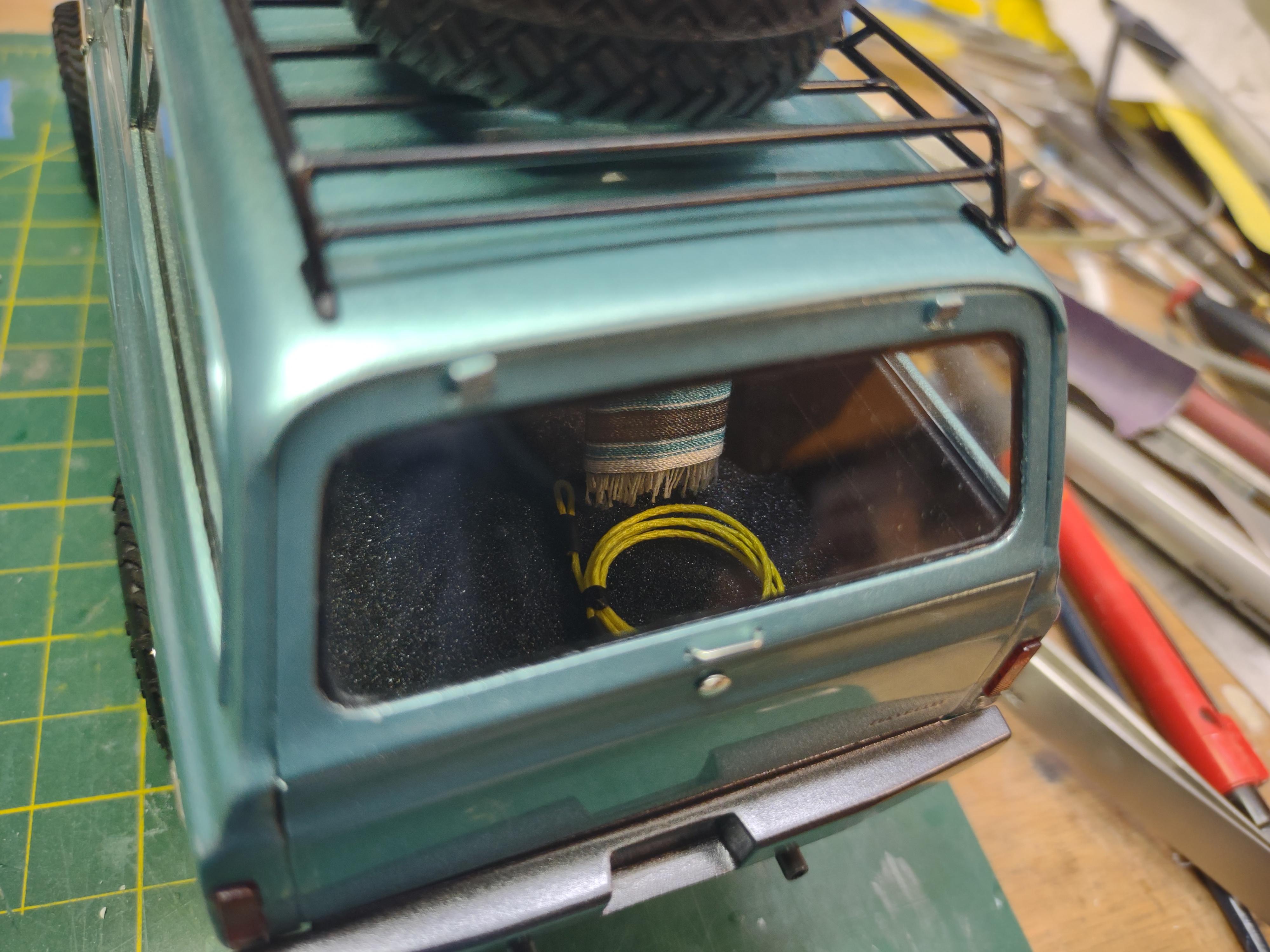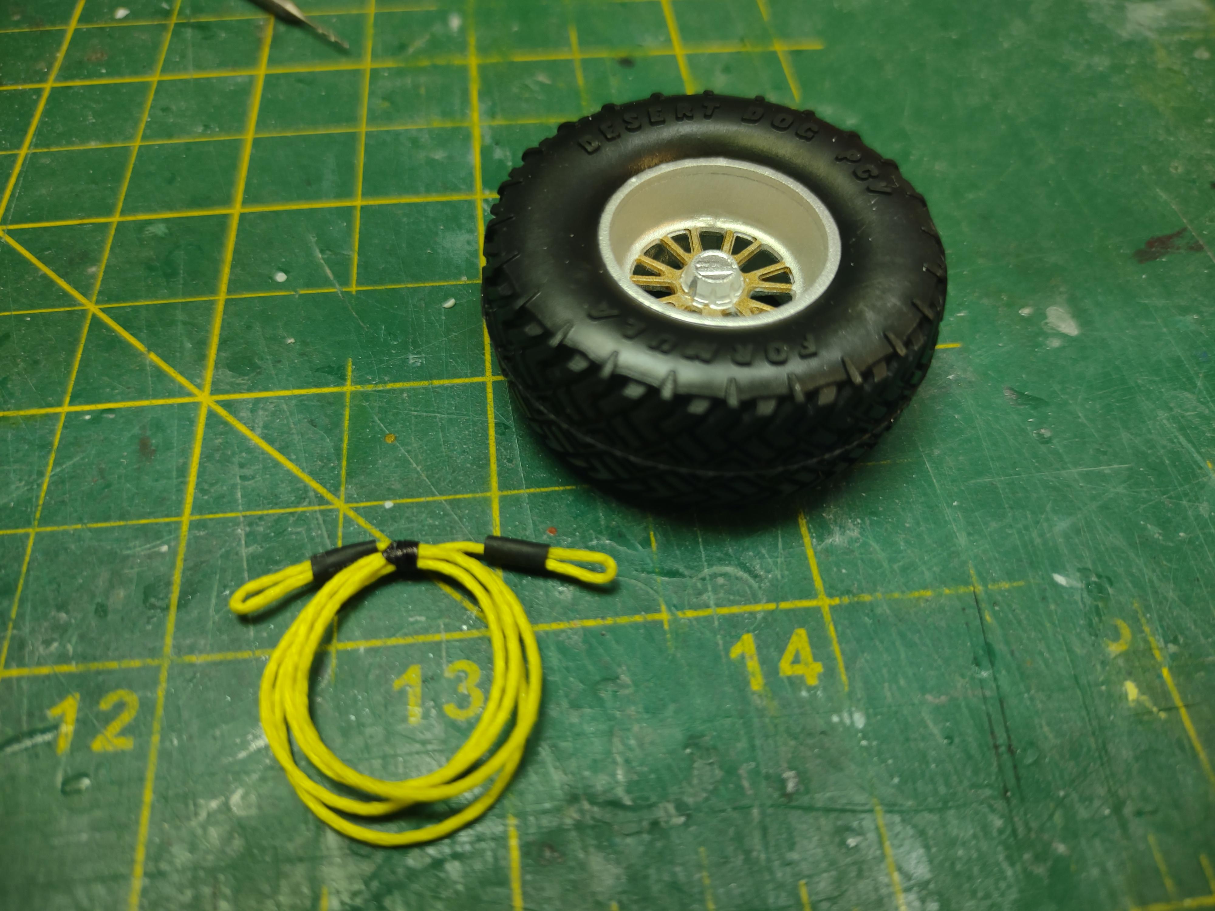 So I borrowed a tire from a set I had, now I have a spare! Also made a kinetic recovery rope for interior detail. I have a few more additions for the roof rack coming. And I finally dared to glue the rack to the roof... -