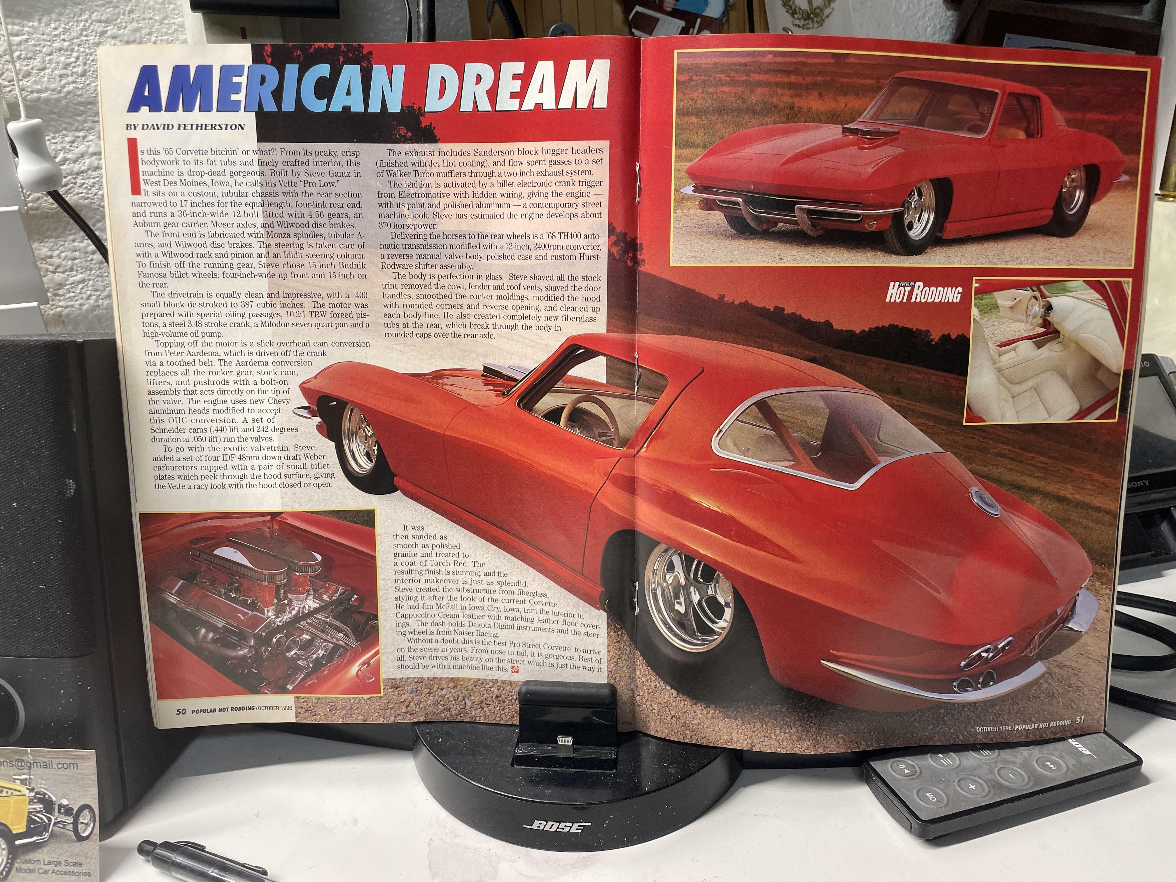 Hello from San Diego California!! This is my 1:1 1/12th scale replica of my friends Vette built back in the early 90โs when low Rod land street rods were hitting hard on the streets. Had a chance to finally get in contact and meet Steve Gantz from a email that was given to me off a post on instagram from someone posting the Vette! He had the email and passed it on to me and I got a phone call from Steve in a few short minutes from my email. When it hit the street and was in the magazine I had found out on EBay the Vette was up for sale on auction and I bid on it! My dad and I are big fans of the Vette and wanted to buy it so we could Cruz it here in San Diego. $140k was my last bid and 5 seconds away from owning my dream car and got sniped out by a $145k bid and the last two seconds was the last I seen as I was out bid! ๐ก๐ก๐ก๐ก long story short it was sold again to Dan Patron and is now called โSERIOโ Steve has been helping me with any and all information on the build he did on the Vette and gave me a hand full of magazines texted me pictures and videos so I can build it exactly 1:1 ๐ so here is what I have so far in 1/12th scale replica that will grace his home as a gift from Me โSoCalInc and Pual Mendoza along with Lindsey Tuft of Design Machine โ