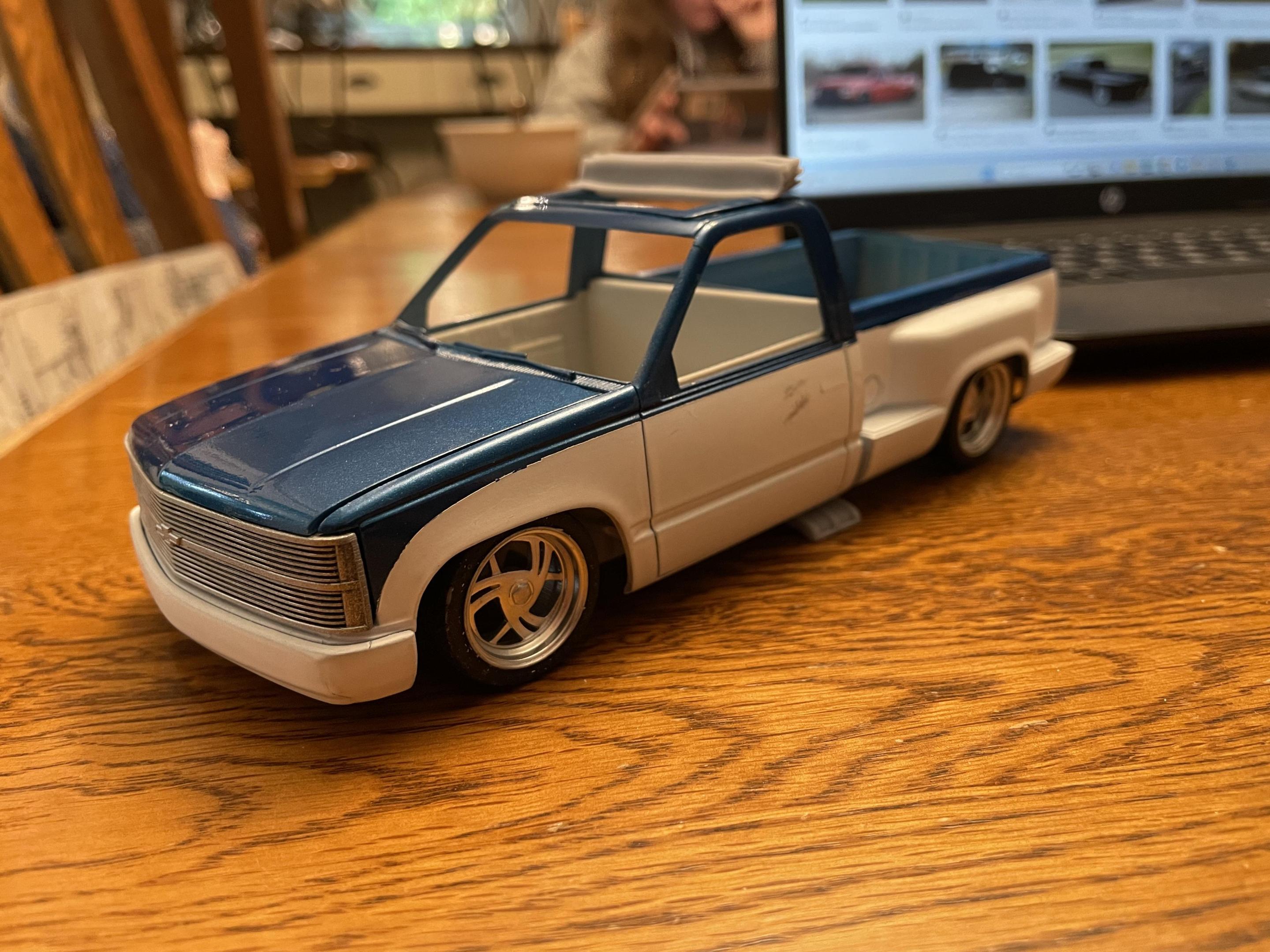 Hey there, I printed this kit as soon as it became available. I used the salt method to weather it, and printed the frame (bagged) wheels, and custom interior. The engine is out of the Foose F100 with a custom finned aircleaner on it. Turned out pretty cool I think.