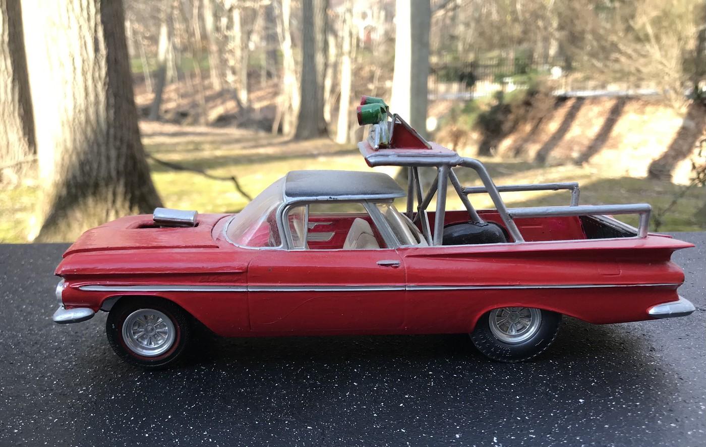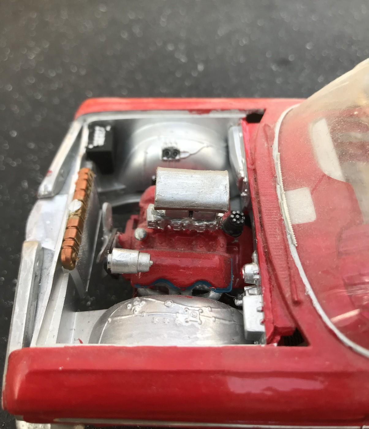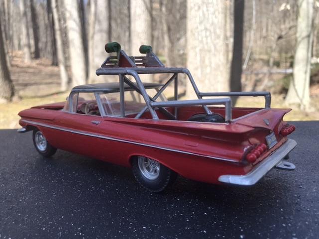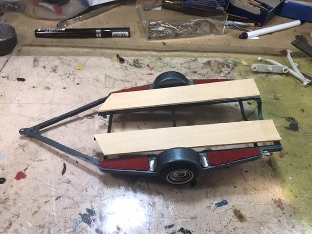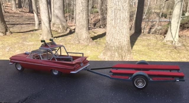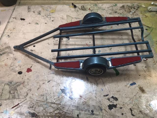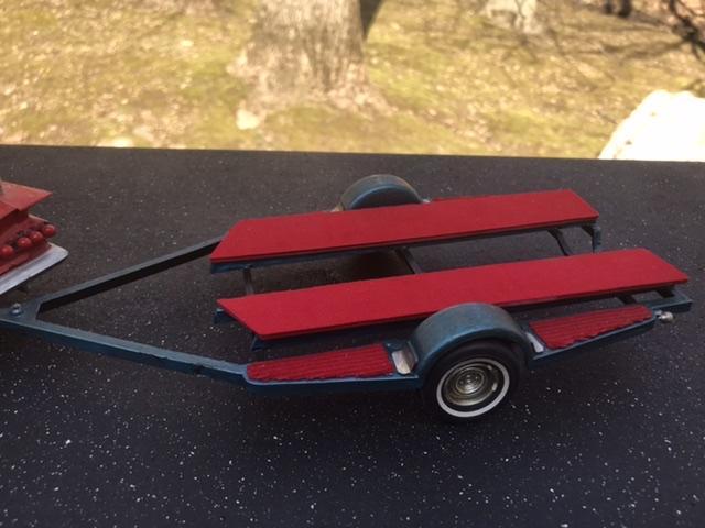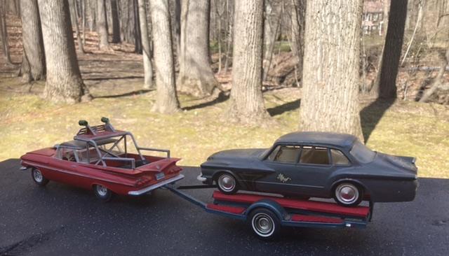 Many of you know I collect old custom builds. I consider them the folk art of our youth. I have a pretty good collection of old customs that might have been built by teens in The early 1960s for their local hobby store contest. If only these oldies could tell their story! I’ve owned this old ElCamino many years. I bought it for $5 from a dealer I knew who said he felt good it went to me because anyone else would smash it open for parts. This does appear to be an original issue, a car any 12 year old would be proud of! Brush paint job with Testors paints, and an interesting rack made from sprue takes it above an ordinary build. And of course it needed a blower! Many cars of this era have unpainted chassis, but our youngster continued his creativity here. He didn’t appear to have taillights so he detail painted them in. And then I saw the trailer hitch! I try not to go overboard in improving these.. I replace missing parts like mirrors or spotlights, but those missing tail lights bothered me. I didn’t have a spare set of stock ones so I went for period custom with parts that would have been available at that time. So I used large pin heads for lights. A bit of red paint and we are ready to rock n roll! New taillights in place look like they belong there! And like all my cars in the collection, it got a vintage AutoWorld license plate. Now for that hitch.. I owned this old trailer which someone included when I purchased an old custom. It’s an AMT boat trailer. The builder added some velvet and chrome to make it special! This got my wheels turning.. yes! My Olde Kustom Kollection needed a shop truck! Since I’d be transporting cars, it needed a deck. Sticking with materials available in that era, I went with balsa wood. And I followed Jim King’s advice and bought a 12x12 sheet of velvet paper at Michael’s for $2 and covered the deck. That would’ve gotten lotsa wows in 1966. And our team is ready for its first mission. And we’ve picked up a Vintage custom Valiant. Headed back to the shop! Hey, I have some fun between more serious builds!