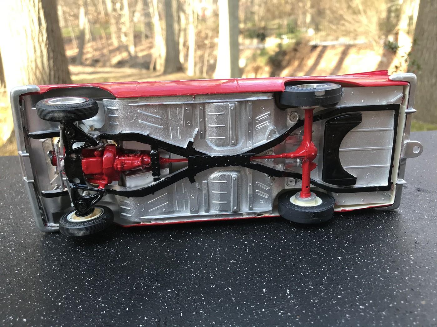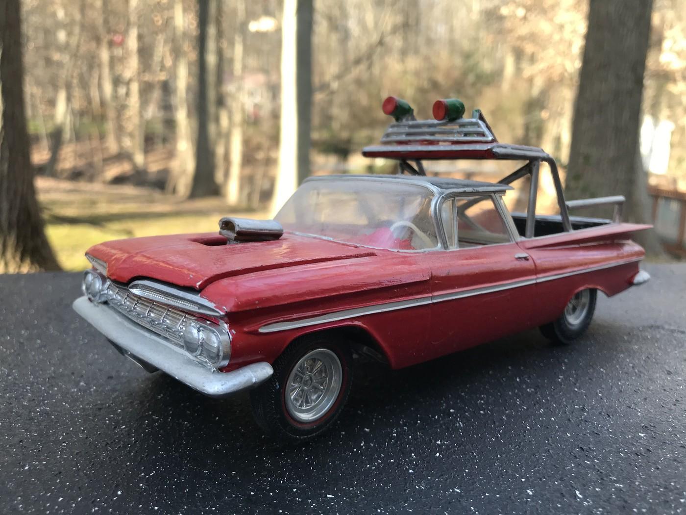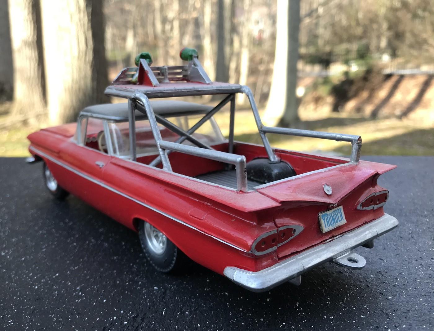 Many of you know I collect old custom builds. I consider them the folk art of our youth. I have a pretty good collection of old customs that might have been built by teens in The early 1960s for their local hobby store contest. If only these oldies could tell their story! I’ve owned this old ElCamino many years. I bought it for $5 from a dealer I knew who said he felt good it went to me because anyone else would smash it open for parts. This does appear to be an original issue, a car any 12 year old would be proud of! Brush paint job with Testors paints, and an interesting rack made from sprue takes it above an ordinary build. And of course it needed a blower! Many cars of this era have unpainted chassis, but our youngster continued his creativity here. He didn’t appear to have taillights so he detail painted them in. And then I saw the trailer hitch! I try not to go overboard in improving these.. I replace missing parts like mirrors or spotlights, but those missing tail lights bothered me. I didn’t have a spare set of stock ones so I went for period custom with parts that would have been available at that time. So I used large pin heads for lights. A bit of red paint and we are ready to rock n roll! New taillights in place look like they belong there! And like all my cars in the collection, it got a vintage AutoWorld license plate. Now for that hitch.. I owned this old trailer which someone included when I purchased an old custom. It’s an AMT boat trailer. The builder added some velvet and chrome to make it special! This got my wheels turning.. yes! My Olde Kustom Kollection needed a shop truck! Since I’d be transporting cars, it needed a deck. Sticking with materials available in that era, I went with balsa wood. And I followed Jim King’s advice and bought a 12x12 sheet of velvet paper at Michael’s for $2 and covered the deck. That would’ve gotten lotsa wows in 1966. And our team is ready for its first mission. And we’ve picked up a Vintage custom Valiant. Headed back to the shop! Hey, I have some fun between more serious builds!