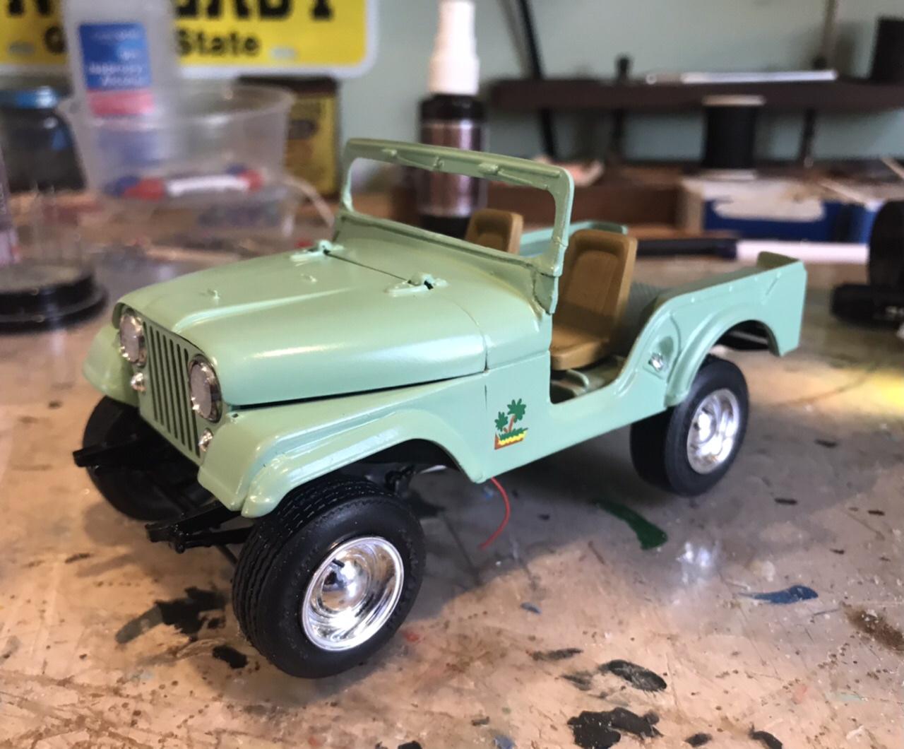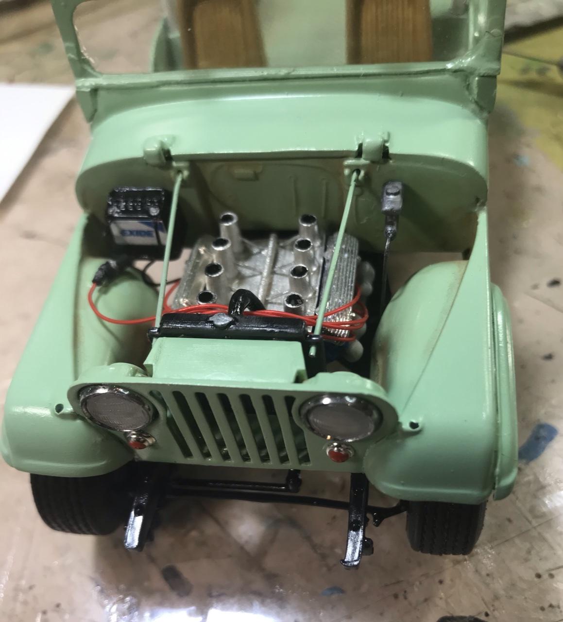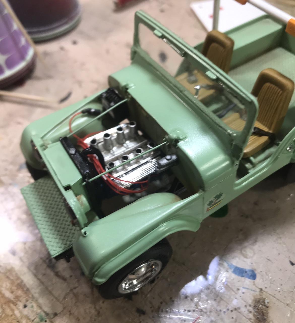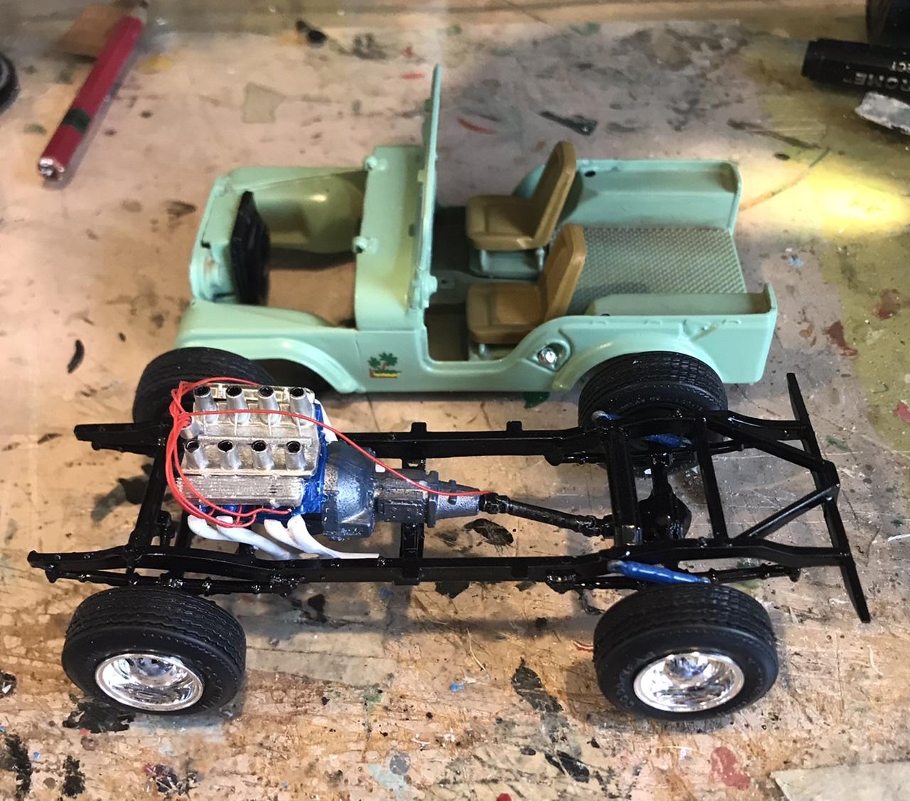 Earlier this week... here is the completed chassis. V8 is from the Falcon Modified Stocker with intake from the V8 in early Jeepster kits and valve covers from the parts box. Just sitting for the pose on Friday This weekend I mated body and chassis. All under hood plumbing and accessories are complete. Interior is complete except for Round 3 of fiddling with the steering wheel. Early MPC chrome was just coming off the bumpers upon touch, so they got stripped in Mr Clean tonight and are ready for finishing. Not sure if they’ll be white or chrome. We should be under glass this week! -