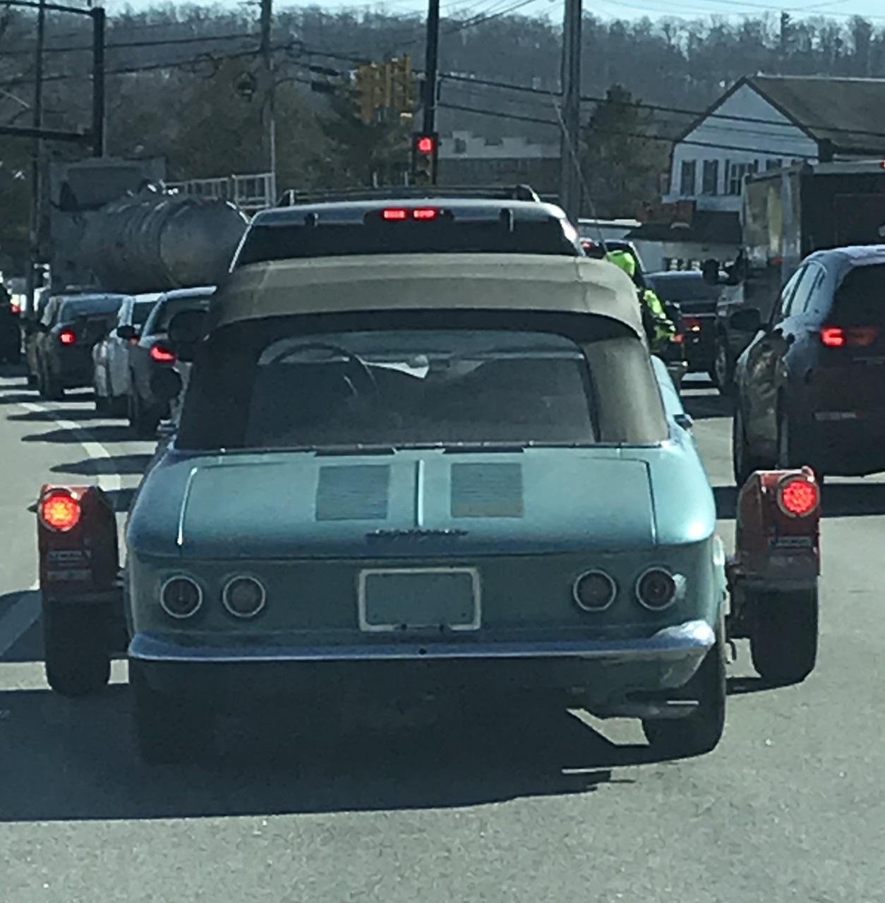 During my brief escape from capacity today (I went to beer store) I saw this early Corvair convertible on a tow dolly. Looked nice. -