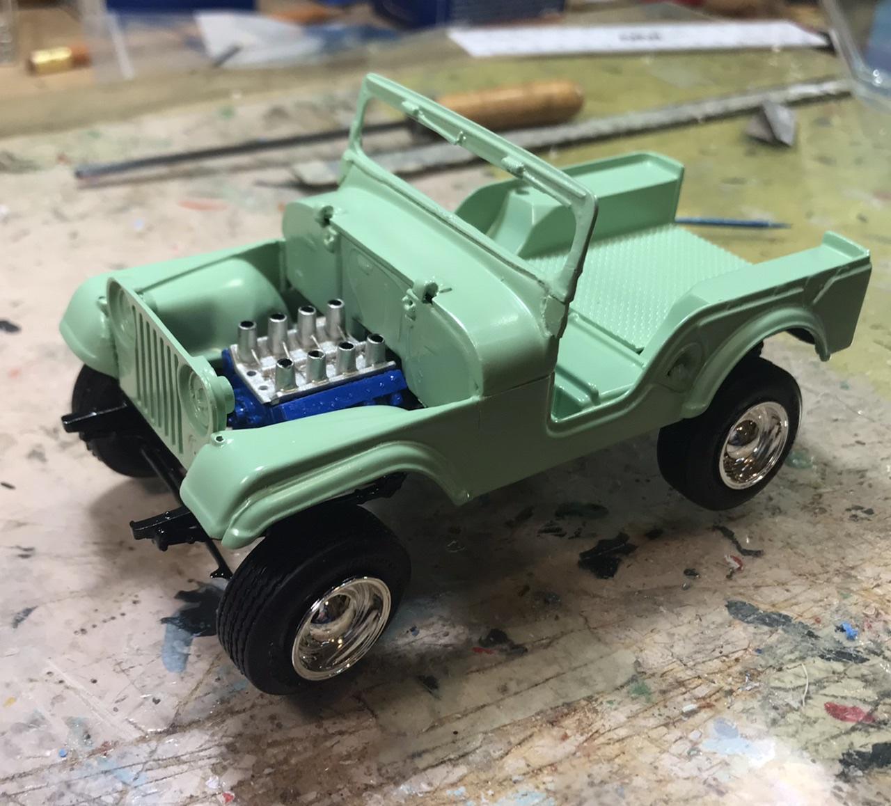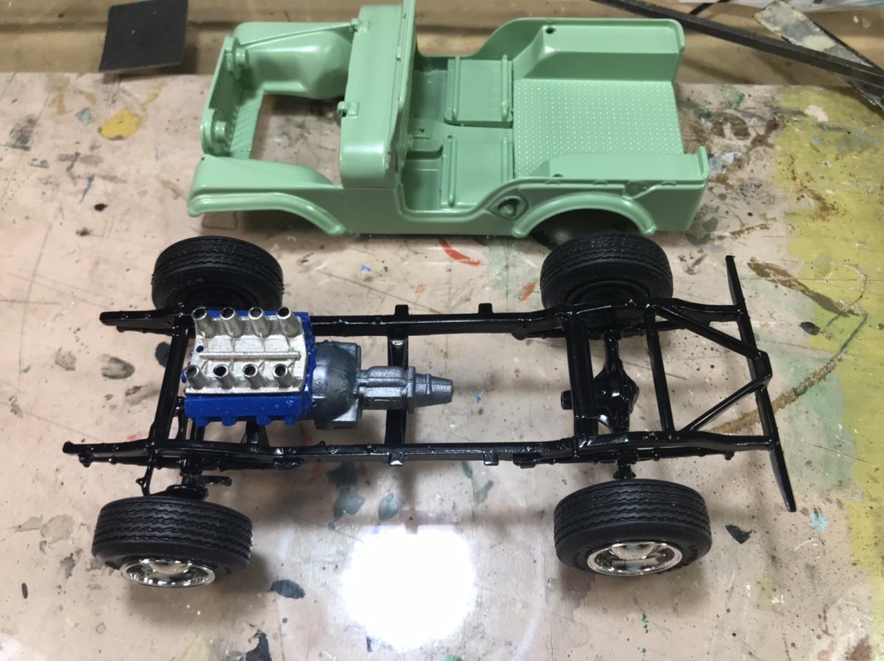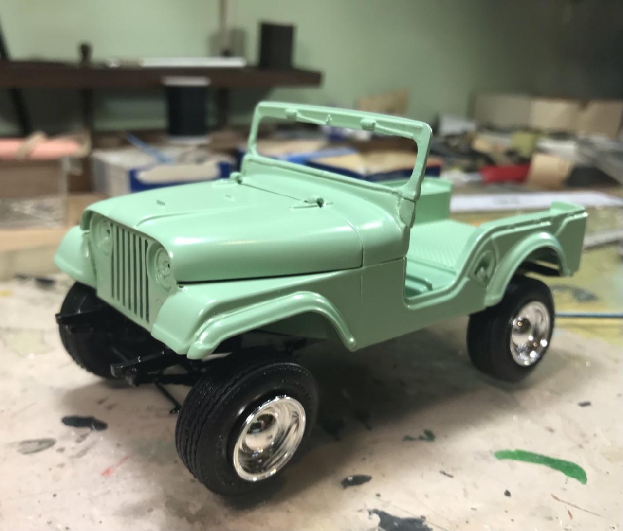 Don’t even ask why! I dug into that big box of Jeep parts one more time. This is just for fun, without a lot of detail just to see what I can build from scraps.. Again I pulled the worst body out of the box, another major glue bomb. I had to pry a backseat out of the bed. I had a chassis but no suspension. I stole the springs from a Revell 1950 Ford pickup. I had a rear from a Jeepster. It became 2wd with a straight front axle. The axles are below the springs per the 50 Ford arrangement. Wheels are from AMT 1953 Ford pickup kit. Body cleaned up fairly well and sits in white primer here. Bed was too gluey, so I added some diamond plate. Painted with Krylon Colormaster Satin Pistachio that I got at Ollies for a buck just because I thought it was an interesting color. Windshield frame was broken already so I chopped 5 inches out of it and since it had no mounting parts I just glued it in place. Engine came from AMT Falcon Modified Stocker and intake was for the V8 in an early Jeepster kit. It had a big open void in the center so I made a little fuel log. So far so good! Odd color and all!