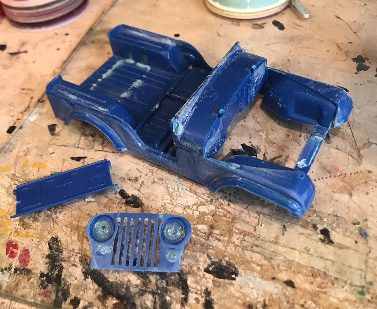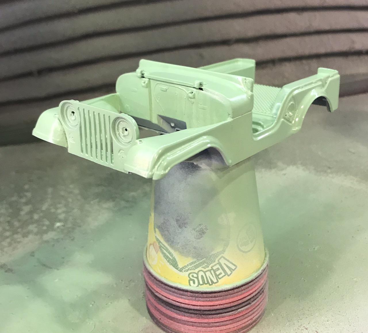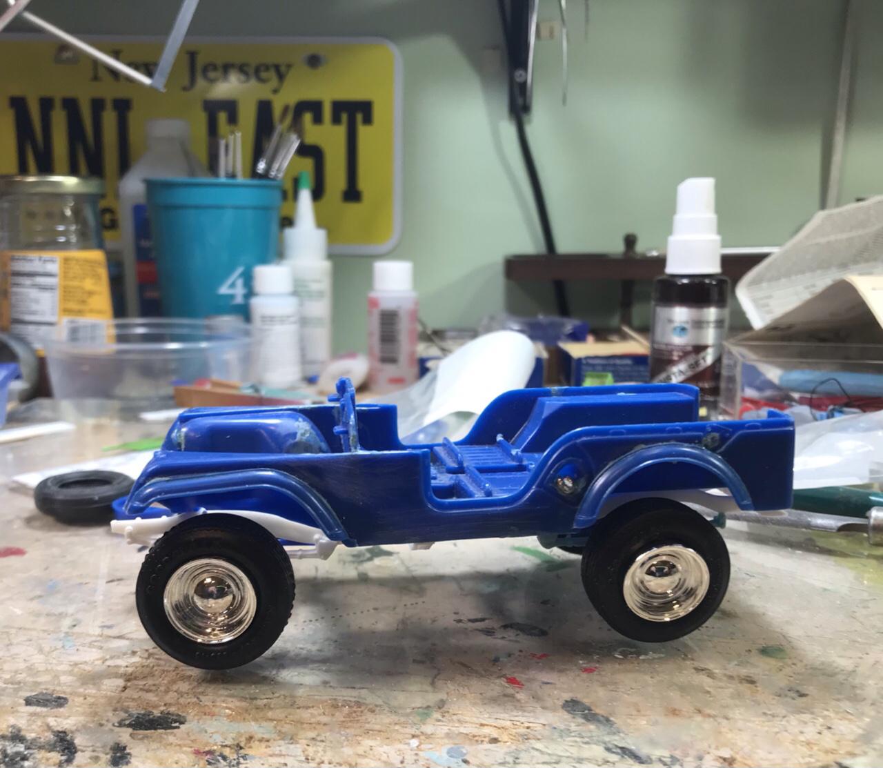 Don’t even ask why! I dug into that big box of Jeep parts one more time. This is just for fun, without a lot of detail just to see what I can build from scraps.. Again I pulled the worst body out of the box, another major glue bomb. I had to pry a backseat out of the bed. I had a chassis but no suspension. I stole the springs from a Revell 1950 Ford pickup. I had a rear from a Jeepster. It became 2wd with a straight front axle. The axles are below the springs per the 50 Ford arrangement. Wheels are from AMT 1953 Ford pickup kit. Body cleaned up fairly well and sits in white primer here. Bed was too gluey, so I added some diamond plate. Painted with Krylon Colormaster Satin Pistachio that I got at Ollies for a buck just because I thought it was an interesting color. Windshield frame was broken already so I chopped 5 inches out of it and since it had no mounting parts I just glued it in place. Engine came from AMT Falcon Modified Stocker and intake was for the V8 in an early Jeepster kit. It had a big open void in the center so I made a little fuel log. So far so good! Odd color and all!