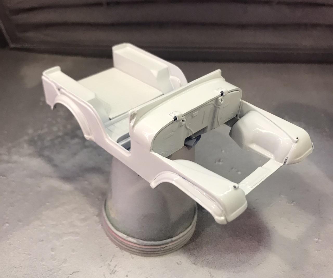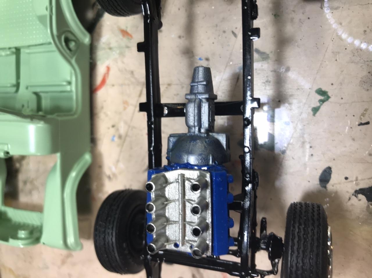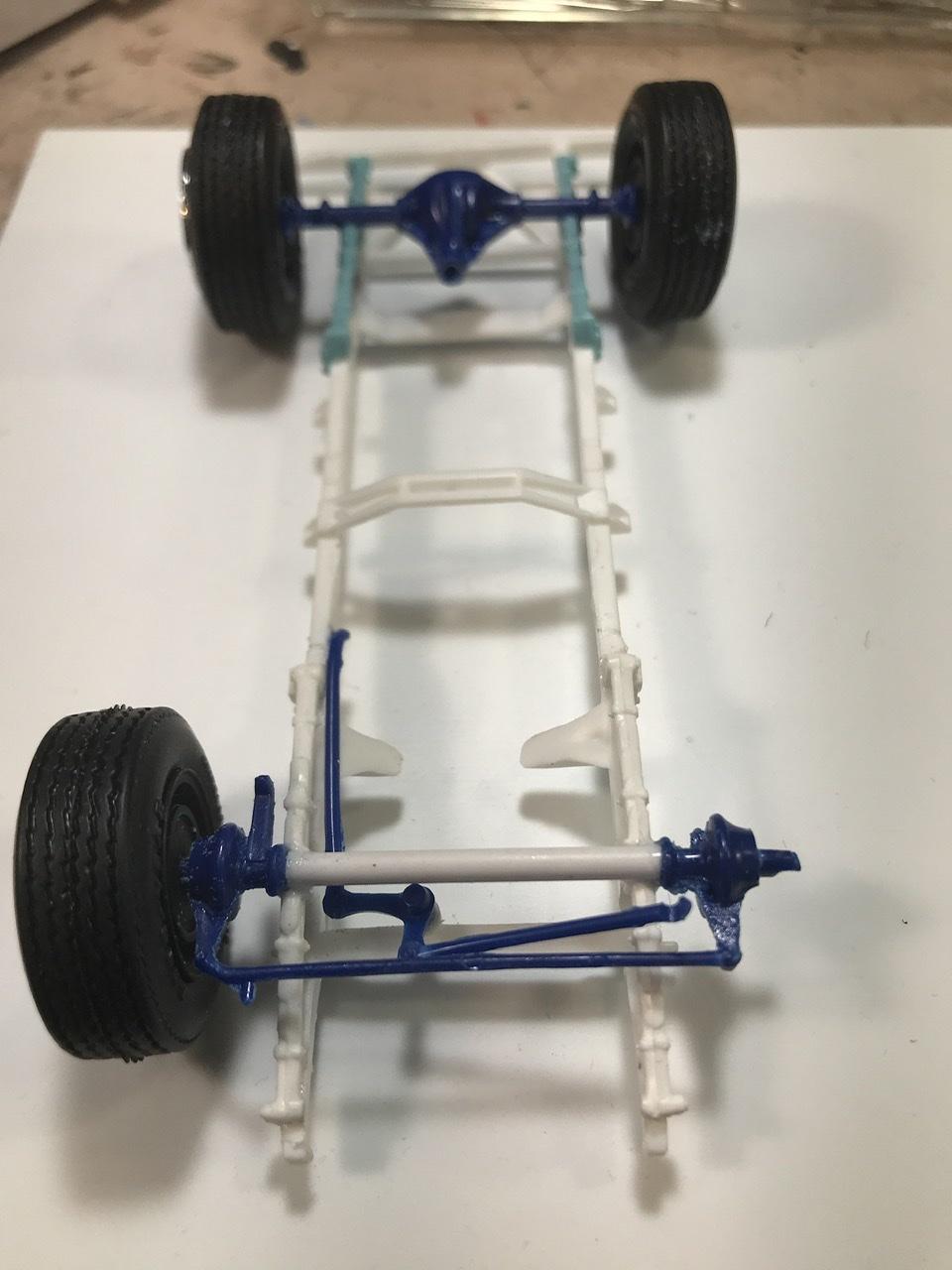 Playing in the junk box again.. What a mess! Some kid let loose with a full tube of glue! The back seat was near welded in there. I do have two much cleaner bodies, but took this as a challenge. I had a chassis but no suspension. The four leaf springs are from 50 Ford pick up kit. I made a rear from a broken one, used the center pumpkin and made the axles from Evergreen tube. Front is a straight axle.. 2 WD truck. Primed and near ready for some paint. I dealt with the glue in the bed by sanding as flat as possible and adding diamond plate. I had a piece in my scrap box just the right size.