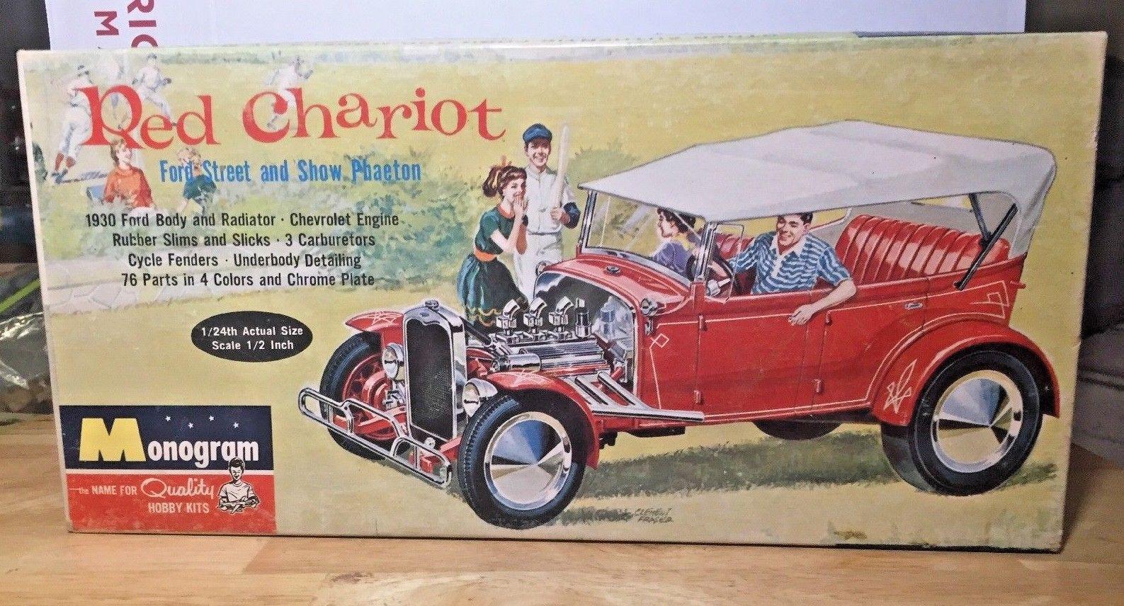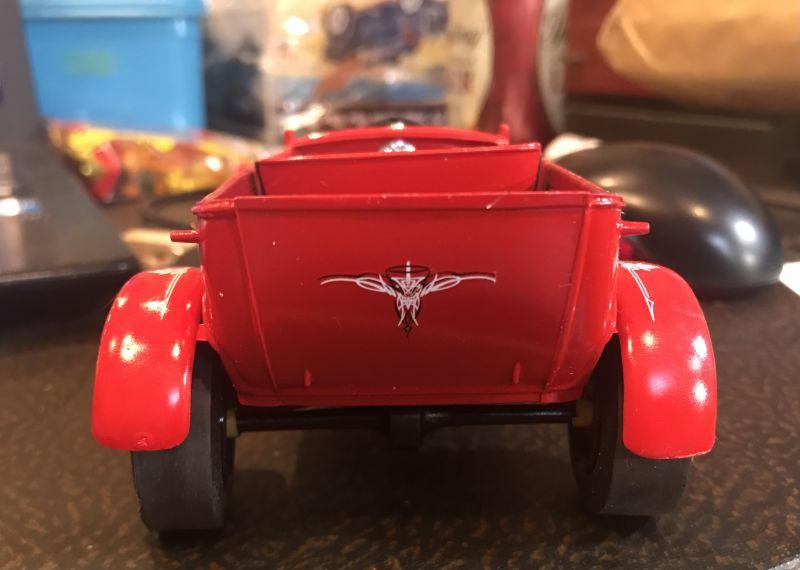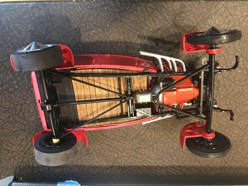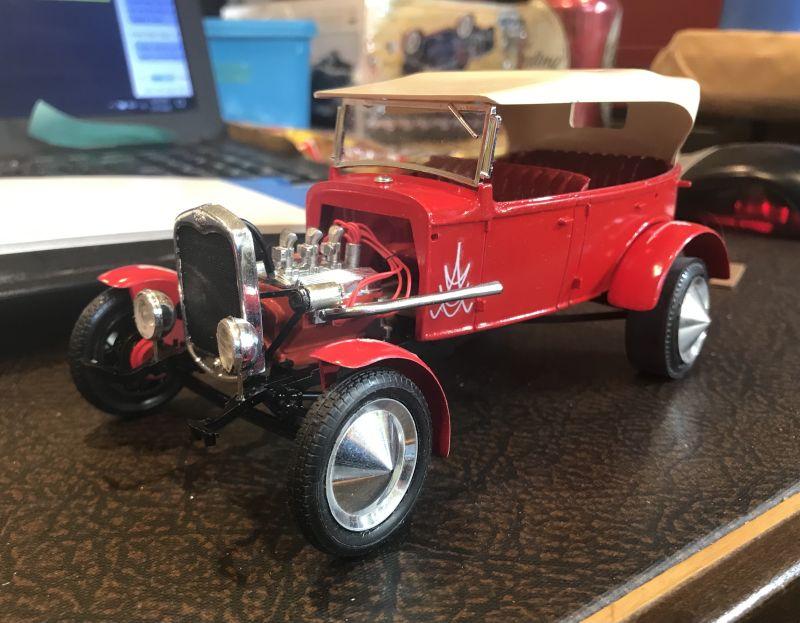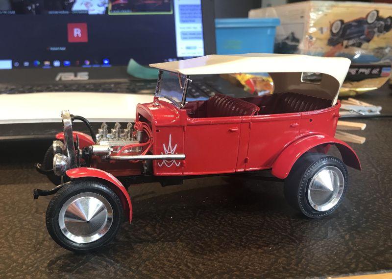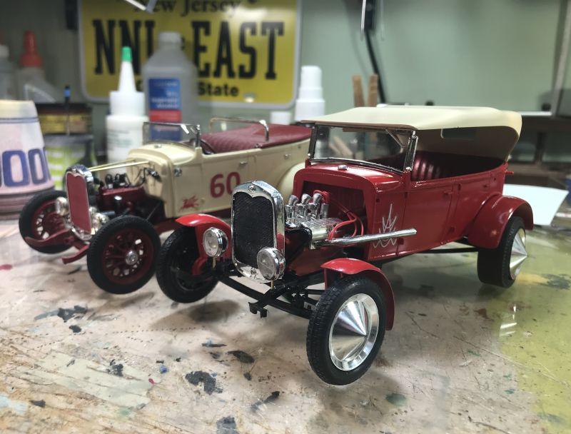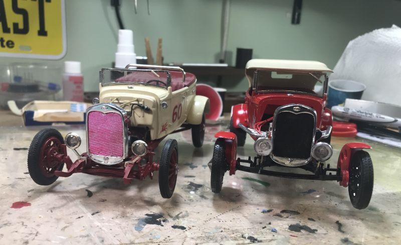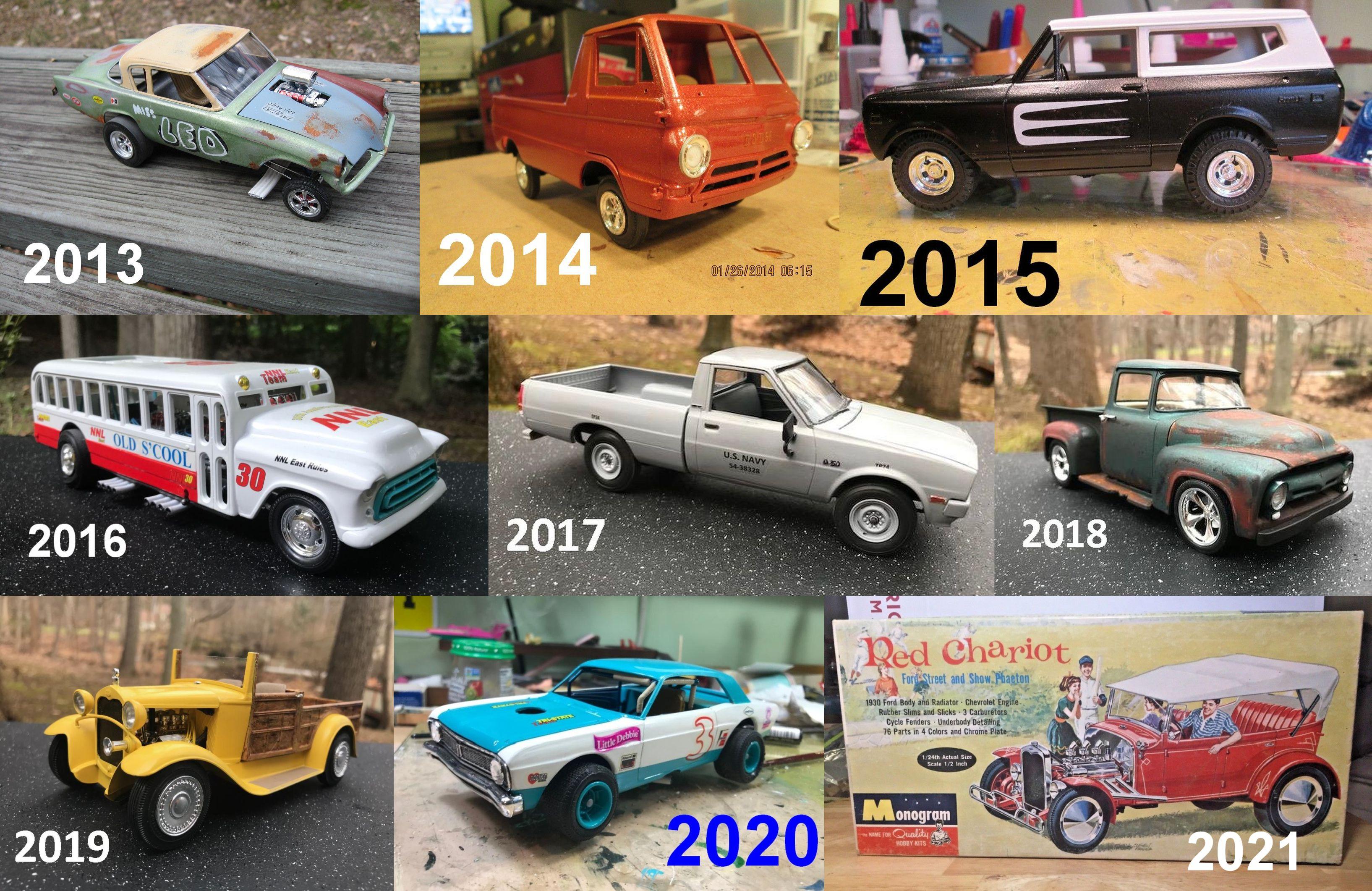 This weekend was the 15th Annual 24 Hour Build on Facebook. Gary Kulchock and his team from West Virginia have been the masterminds behind this event which grows every year. This year over 200 people registered models. Terry Sumner kept track of the people and models, and for the first time, this year Peter Hays introduced a Zoom chat room during the event. I decided to add to my row of Monogram Model As and had wanted to build a Red Chariot for some time, which will sit next to my Blue Beetle. Monogram updated most of the Model A kits over the years, so the original custom parts are no longer available. And some things changed,like axle width to accommodate wider tires. The originals of kits like the box I show above are expensive when they can be found. Still we want to build replicas of the originals. Starting with the most recent version of the 1930 Phaeton, I set out to build my Red Chariot. The parts that are obsolete that I needed and saved for this build include the front bumper, the very cool wheel covers, the rear slicks, tail lights, four cycle fenders and the engine, especially the intake setup and exhaust. Also the non-fender mounted headlights have a bracket to glue them to the chassis. I had much of this in my hoard, but I improvised on a few items. First, I mounted a pair of standard headlights onto brass rod and drilled the corresponding holes in the frame. I actually like this better than the heavy appearing plastic ones. I'm always learning new stuff about these kits, and on this build I learned that the early front axle has slots to hold the front cycle fenders. I had to improvise and create a mount for these during my precious 24 hours! The slicks shown here are from my parts box and are hand hollowed out to barely allow for the large wheel cover. I really need a pair of original slicks! This is how far I got in my 24 Hours. Essentially up on wheels and done, minus a lot of little details. I have the cowl lights ready to attach, plus the original era firewall and front bumper. I also need to install the steering column, shifter and hand brake in the interior. I wasn't happy with the way the opening is exposed on the front seat side, so I didn't glue it in place so that I can address it later. I didn't have the original Red Chariot decals and saw that people have improvised these over the years. Sources I picked on where a recent Revell 29 Ford roadster, RM Blue Bandito and the last version of the Green Hornet. Paint is Tamiya Italian Red that went down very nice over Duplicolor white primer. Due to time restrictions, there is no clear or polishing. I would like to find a set of the original tail lights that install over those little bumps at the bottom of the back panel. My one indulgence against efficiency was to make the basswood floor. I usually instruct people to keep things simple and not to do any scratch building. But in my defense, I had followed my advice to build a kit you are familiar with. I had done the wood floor on my TROG phaeton, and even had the cardstock template from that effort. So it wasn't a huge undertaking. And it just makes the model ! And new stable mates together. The TROG Phaeton was on my bench during this build for reference. Over the next few days I will finish up the little details and adjust things I'm not happy with. And as soon as that's done (and it stops snowing!) I'll take some family photos outside. All in all, the 24 Hour Build is a lot of fun. There's a ton of camaraderie from builders around the world. I spent the time in the Zoom chat room with folks from across the USA, Europe and Canada. It was fun to have company as we built and it added a whole new dimension to the event. I've been doing this since 2013 and will continue to do so! People are already planning out their projects for 2022! Here's all of my projects since 2013...