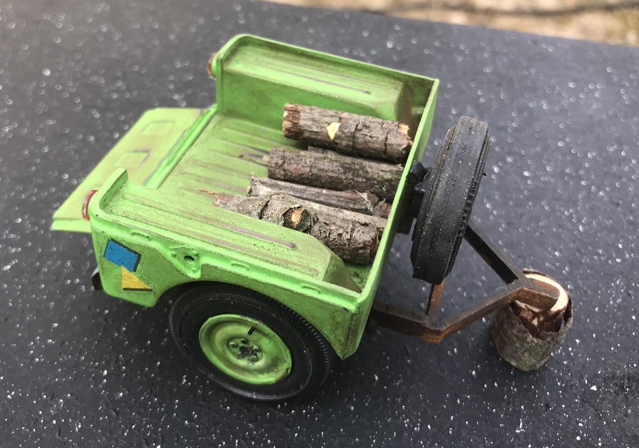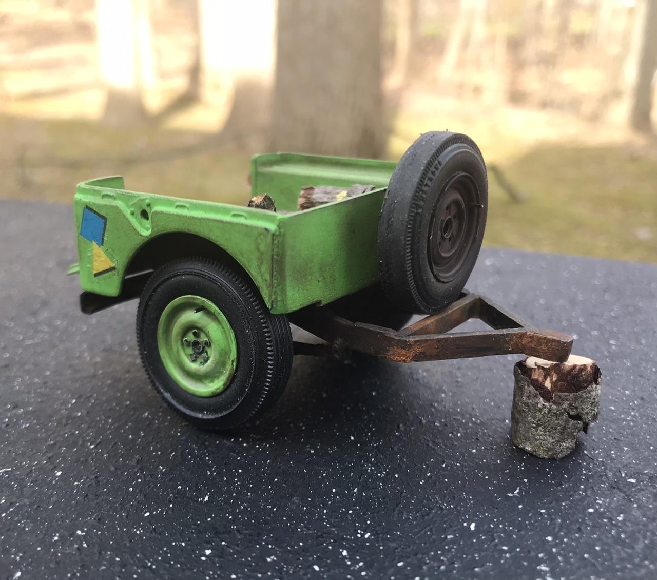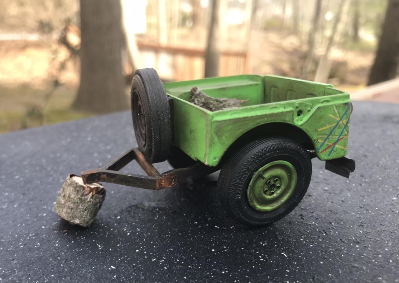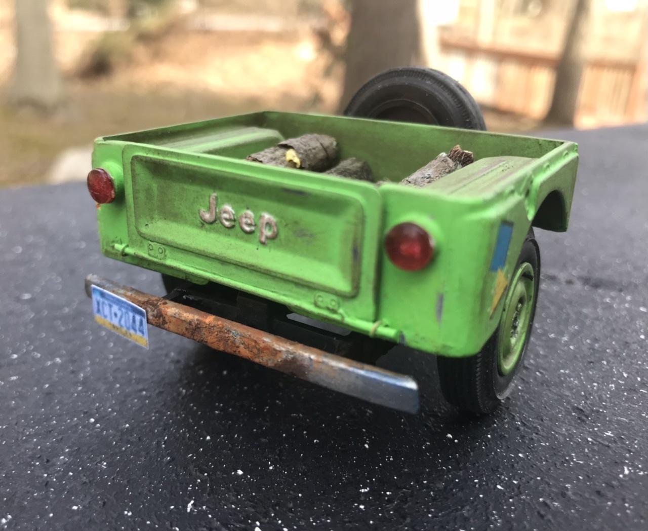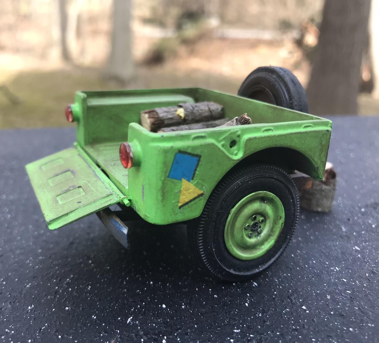 This one went quickly so there is no build thread. It was a side project while building my St John’s Jeep... Digging in my junk box during pauses in my Jeep project, and just playing with odd parts has given me another trailer. Tail lights are short lengths of Evergreen tube with scrap clear lenses I colored red (in the inside) with a Sharpie. Bumper was from the kit but was a gluey mess. I went with that and added rust colors to the glue texture. Plate is two digits off from my car trailer. Since Acme plate generator doesn’t have trailer plates, this started as a plate for sale on eBay, photo resized. Then I just moved a digit on the photo to get a different plate. The wheels came from parts bin, I only had two, perfect for this project. I think they were early 60s Revell Mopar since they weren’t that detailed, but look like cheap trailer wheels. Wood is just that.. wood! Sticks from my backyard cut to short lengths. I did want a bright color, so I used Tamiya bright green, enough left in can from my Chevette build for this but not a full model so I went with it. Decals are from Dodge D50 pickup. On the hook behind my Jeepster. And I’ll share the build details.. Since the St John’s Jeep only used the front end of this old Jeep junker body, I had the back end to play with. At first I dismissed it, thinking it was too short, but the voices kept taunting me! Chassis is simple, as a home built trailer would be just that. It’s the rear portion from a Jeep chassis I had already hacked up for the transmission mount that’s under my Jeepster. Front pieces are just Evergreen rod bits from my scrap box. I believe the springs are from 1950 Ford pickup. Axle is simply a length of Evergreen rod. And here’s a mock-up... front panel is Evergreen sheet scrap from the Jeep project. Spare tire is there not only because we need one, but also to visually fill up space.. and because the trailer was rear heavy! Now left to its own, it settled on the tongue. That’s the tire carrier from the Jeep kit. Tailgate was in my junk box but may have come from a 1:20 scale Jeep as it was too large. I liked that it said Jeep on it, which the Daisy’s Jeep kit doesn’t. I cut and sanded it to size and hinged it with a bit of Evergreen rod and two little brass eyelets made for ship modelers. This whole thing pretty much came from my junk bins. Waste not, want not! -