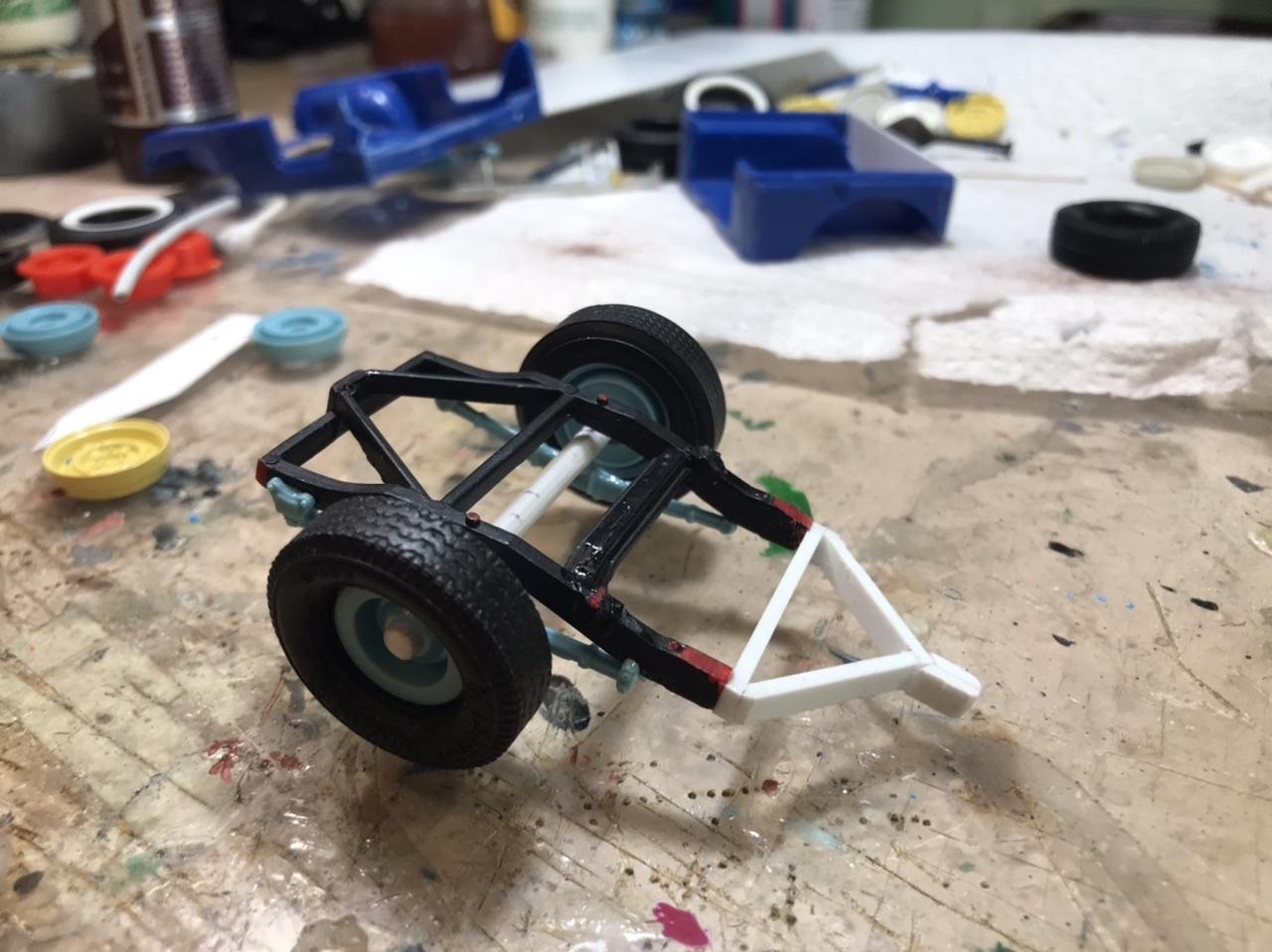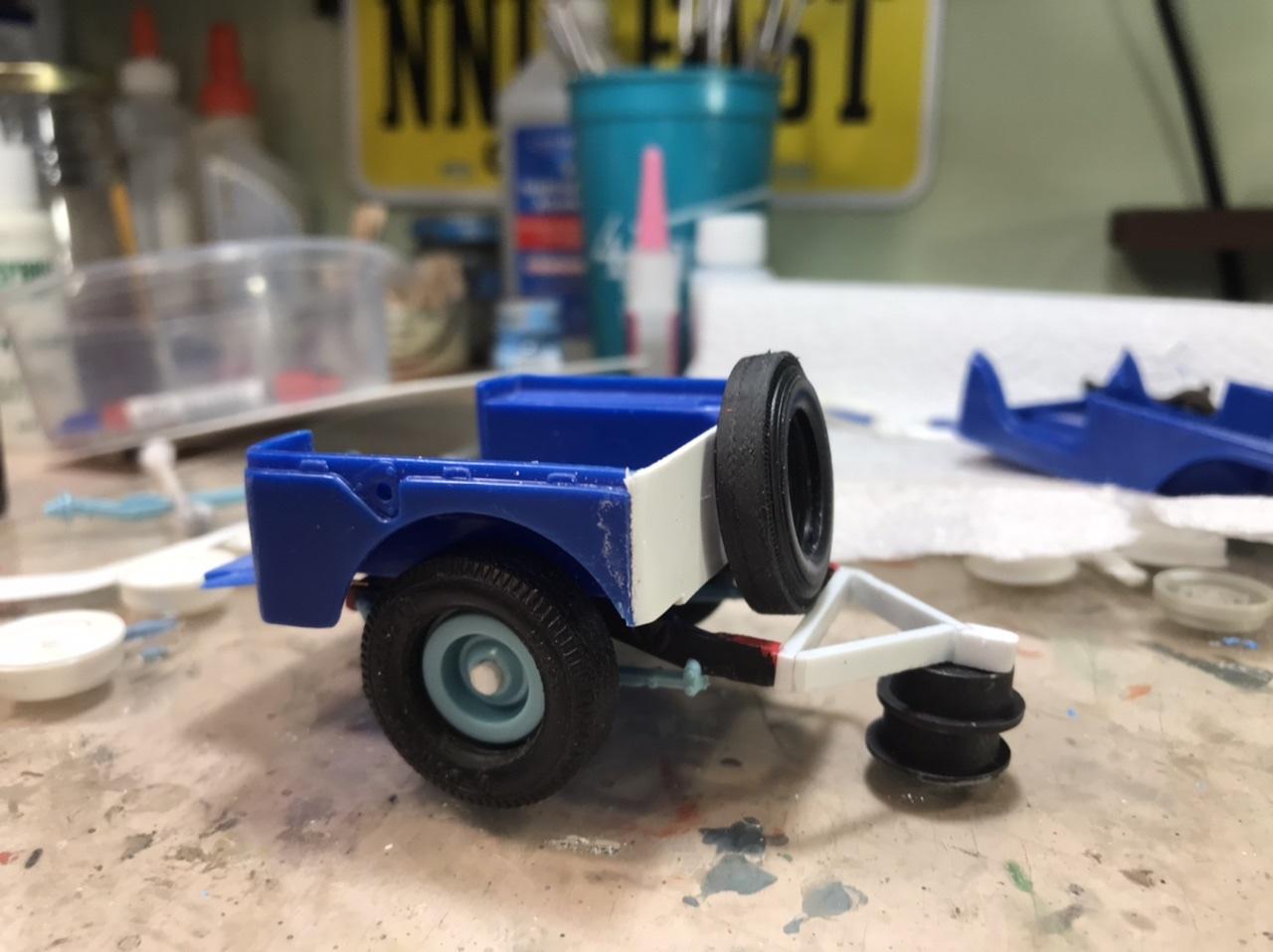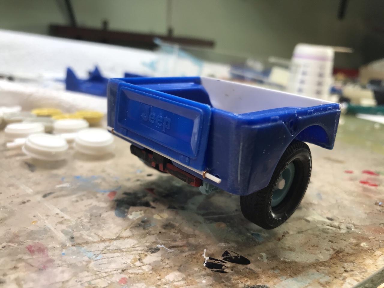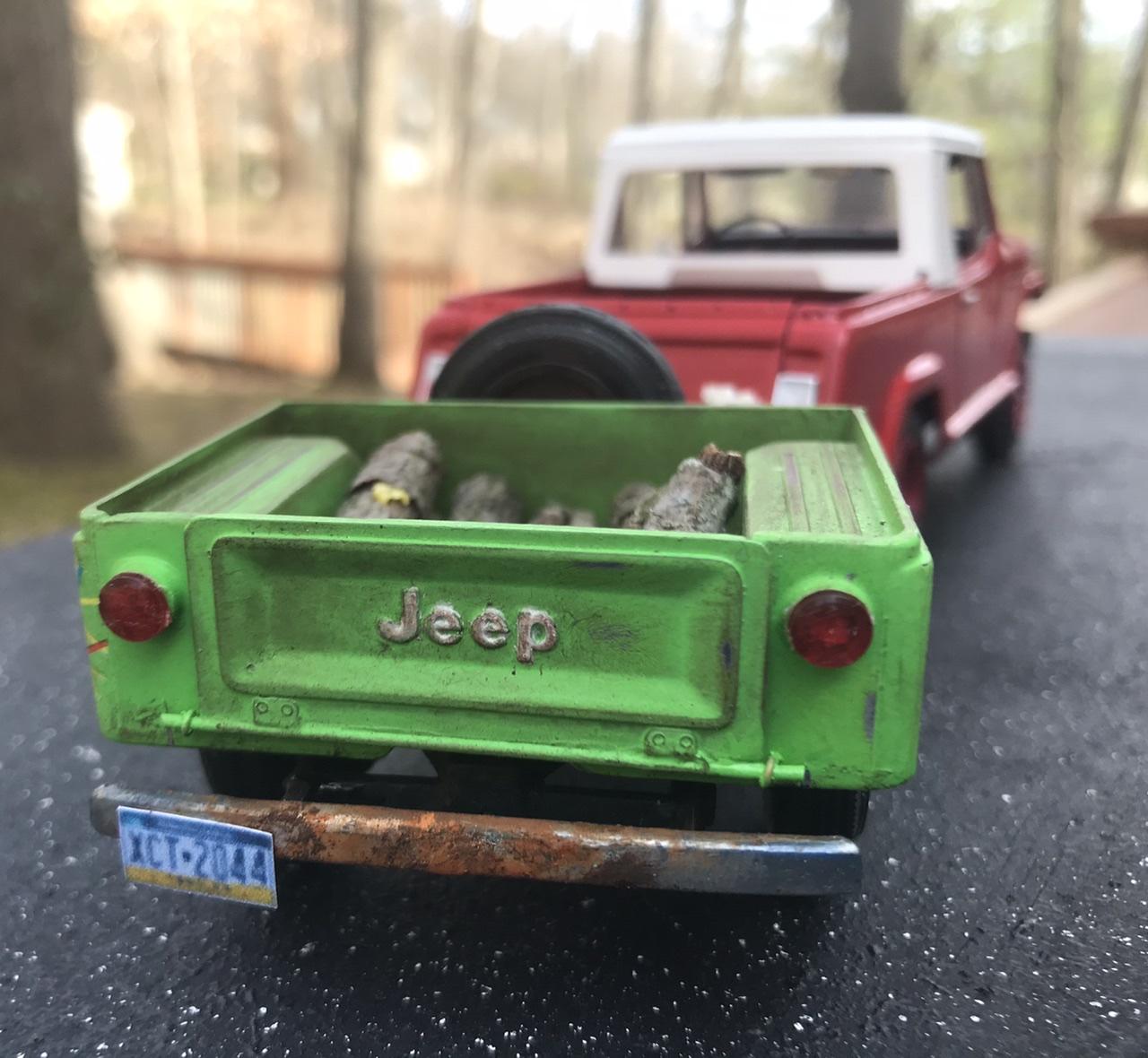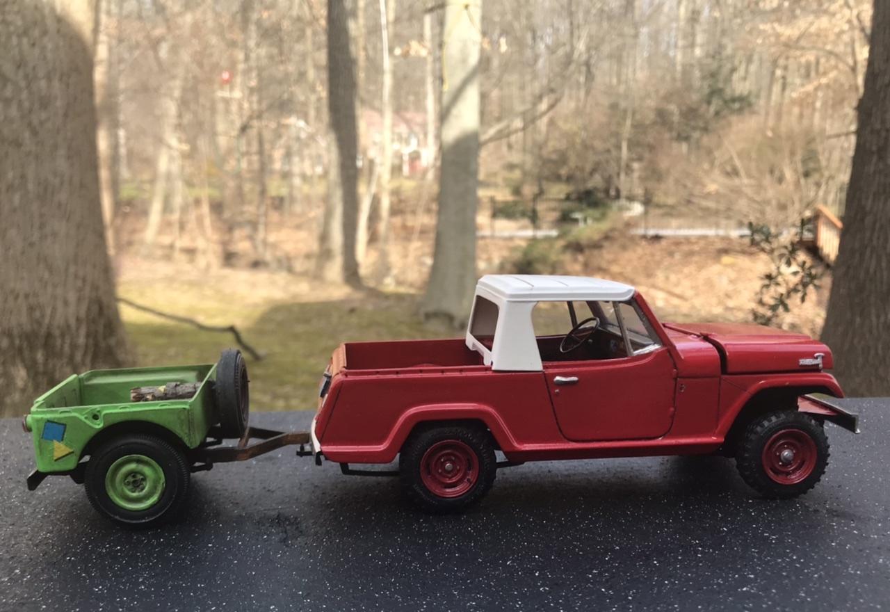 This one went quickly so there is no build thread. It was a side project while building my St John’s Jeep... Digging in my junk box during pauses in my Jeep project, and just playing with odd parts has given me another trailer. Tail lights are short lengths of Evergreen tube with scrap clear lenses I colored red (in the inside) with a Sharpie. Bumper was from the kit but was a gluey mess. I went with that and added rust colors to the glue texture. Plate is two digits off from my car trailer. Since Acme plate generator doesn’t have trailer plates, this started as a plate for sale on eBay, photo resized. Then I just moved a digit on the photo to get a different plate. The wheels came from parts bin, I only had two, perfect for this project. I think they were early 60s Revell Mopar since they weren’t that detailed, but look like cheap trailer wheels. Wood is just that.. wood! Sticks from my backyard cut to short lengths. I did want a bright color, so I used Tamiya bright green, enough left in can from my Chevette build for this but not a full model so I went with it. Decals are from Dodge D50 pickup. On the hook behind my Jeepster. And I’ll share the build details.. Since the St John’s Jeep only used the front end of this old Jeep junker body, I had the back end to play with. At first I dismissed it, thinking it was too short, but the voices kept taunting me! Chassis is simple, as a home built trailer would be just that. It’s the rear portion from a Jeep chassis I had already hacked up for the transmission mount that’s under my Jeepster. Front pieces are just Evergreen rod bits from my scrap box. I believe the springs are from 1950 Ford pickup. Axle is simply a length of Evergreen rod. And here’s a mock-up... front panel is Evergreen sheet scrap from the Jeep project. Spare tire is there not only because we need one, but also to visually fill up space.. and because the trailer was rear heavy! Now left to its own, it settled on the tongue. That’s the tire carrier from the Jeep kit. Tailgate was in my junk box but may have come from a 1:20 scale Jeep as it was too large. I liked that it said Jeep on it, which the Daisy’s Jeep kit doesn’t. I cut and sanded it to size and hinged it with a bit of Evergreen rod and two little brass eyelets made for ship modelers. This whole thing pretty much came from my junk bins. Waste not, want not! -