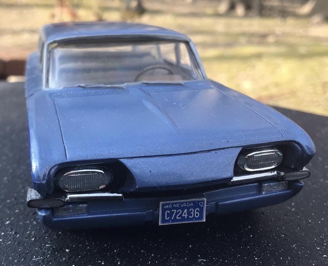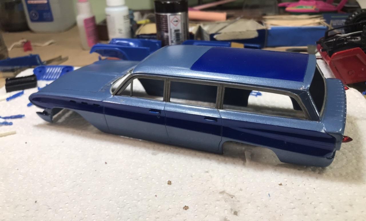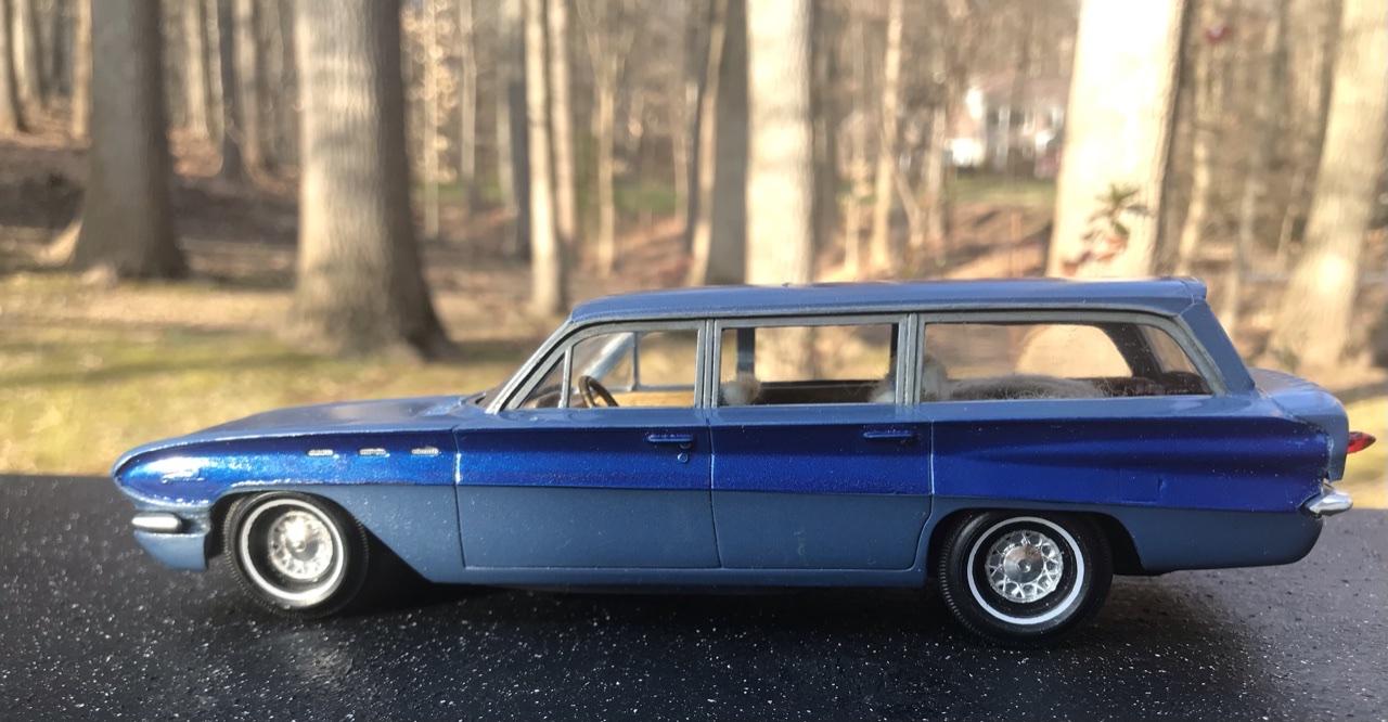 Folks who know me are aware that I have strong feelings for ancient old custom built models. I’ve saved quite a few, as I feel they are the folk art of our youth. I’ve had this old Buick wagon forever. It was built by some kid using the kit’s custom parts. It was never painted. Our young builder used his imagination and ingenuity to create the yarn interior. That was the factor that made it unique to me! Here she is finished! This poor Buick has been hanging out undone for a long time. I had painted it the lighter blue and did the chrome in Testors silver paint as that was what would have been used back in the day. It was sitting because I lost the rear bumper. Nothing is lost forever in the model room. I opened an old box and there it was! I knew what it was immediately. So I pulled out the Buick! I was fooling around one day and masked off the roof. I shot the darker blue left over from my Blue Beetle project. It looked good so I did the sides as well. One set of headlights were missing so I used the custom headrests from the Fireball 500 kit. All my old customs get ancient Autoworld license plates. The glue on my old sheet has long ago dried up so I glue them on with white glue. The tires and wheels were on the car when I got it. I have a number of these wagons and I don’t think I ever saw one with the kit’s stock tail lights. These were missing so I substituted in period ones from my parts stash. And here’s that one off custom interior. Quite spiffy and I’m sure the young builder was quite proud of it! So our 60 year old custom rides again. It is now sitting proudly amongst its peers in my Old Custom Collection showcase!