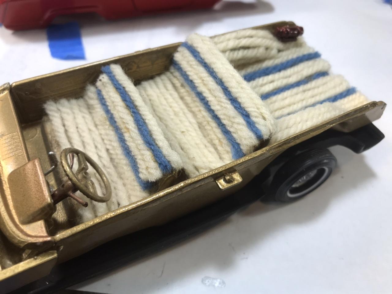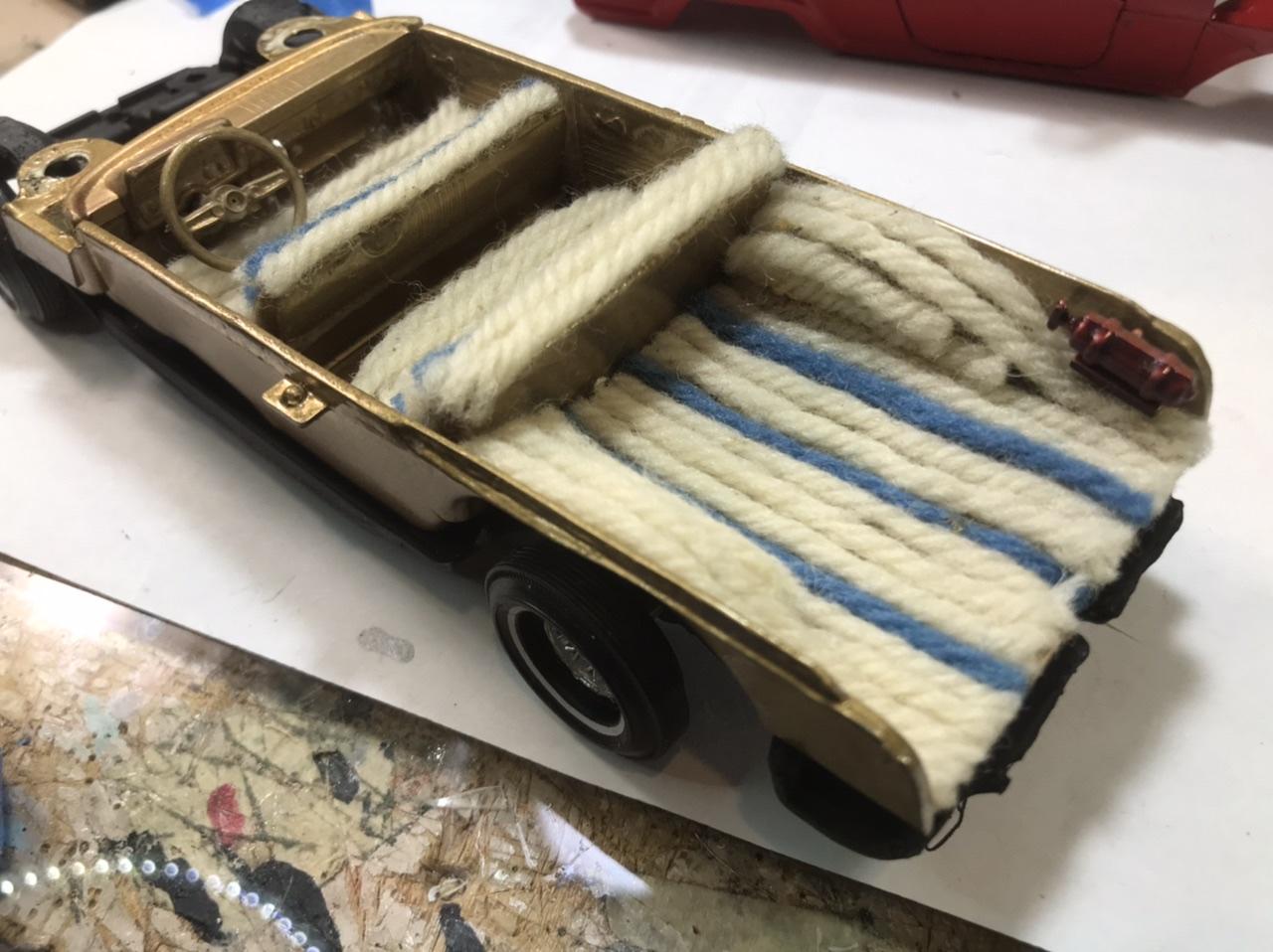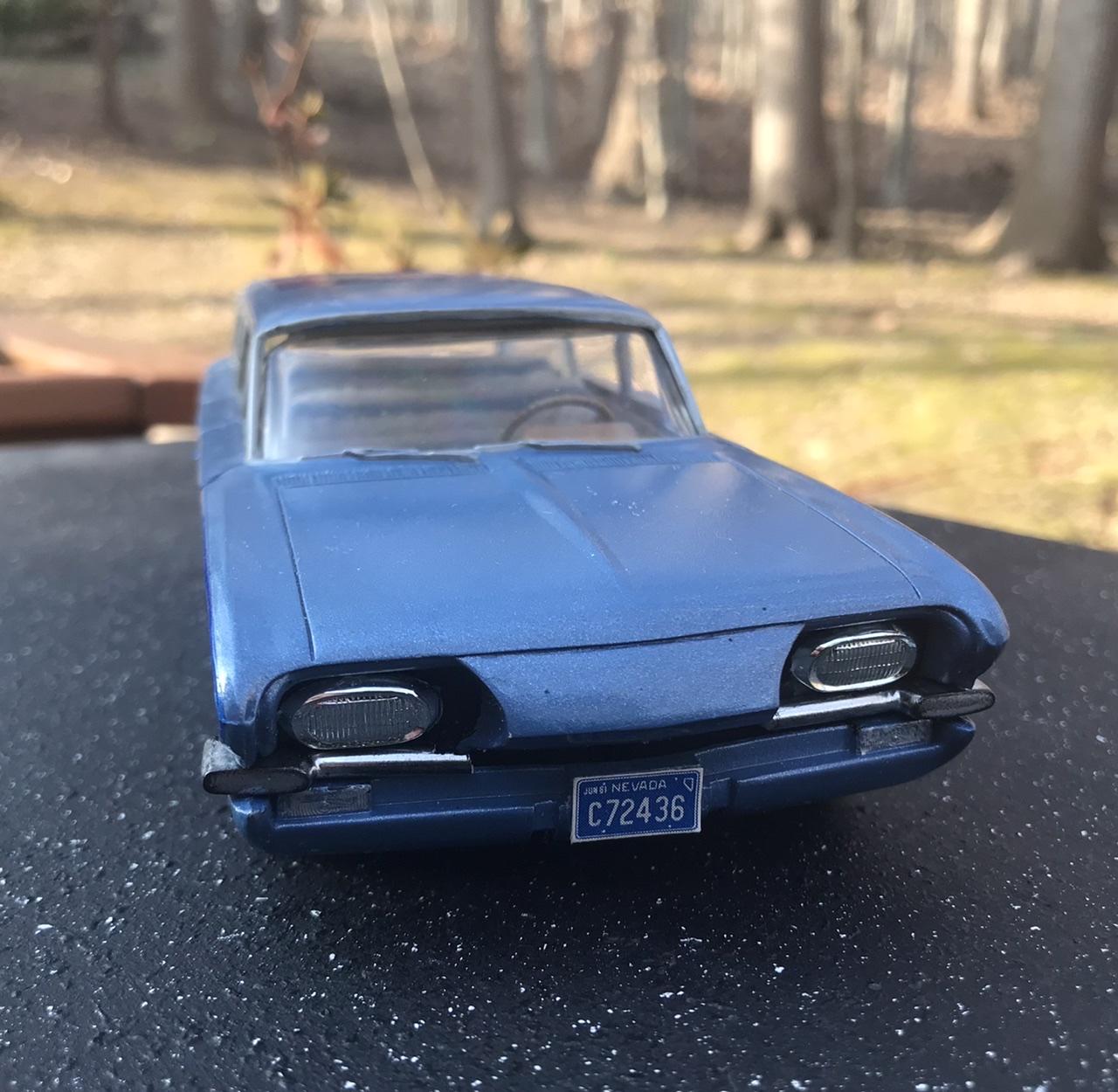 Folks who know me are aware that I have strong feelings for ancient old custom built models. I’ve saved quite a few, as I feel they are the folk art of our youth. I’ve had this old Buick wagon forever. It was built by some kid using the kit’s custom parts. It was never painted. Our young builder used his imagination and ingenuity to create the yarn interior. That was the factor that made it unique to me! Here she is finished! This poor Buick has been hanging out undone for a long time. I had painted it the lighter blue and did the chrome in Testors silver paint as that was what would have been used back in the day. It was sitting because I lost the rear bumper. Nothing is lost forever in the model room. I opened an old box and there it was! I knew what it was immediately. So I pulled out the Buick! I was fooling around one day and masked off the roof. I shot the darker blue left over from my Blue Beetle project. It looked good so I did the sides as well. One set of headlights were missing so I used the custom headrests from the Fireball 500 kit. All my old customs get ancient Autoworld license plates. The glue on my old sheet has long ago dried up so I glue them on with white glue. The tires and wheels were on the car when I got it. I have a number of these wagons and I don’t think I ever saw one with the kit’s stock tail lights. These were missing so I substituted in period ones from my parts stash. And here’s that one off custom interior. Quite spiffy and I’m sure the young builder was quite proud of it! So our 60 year old custom rides again. It is now sitting proudly amongst its peers in my Old Custom Collection showcase!
