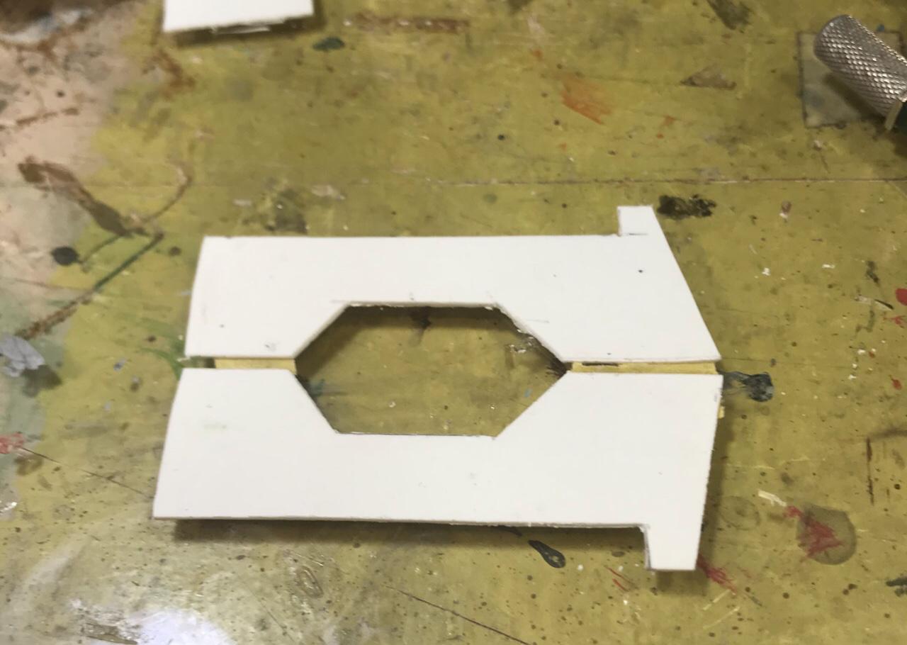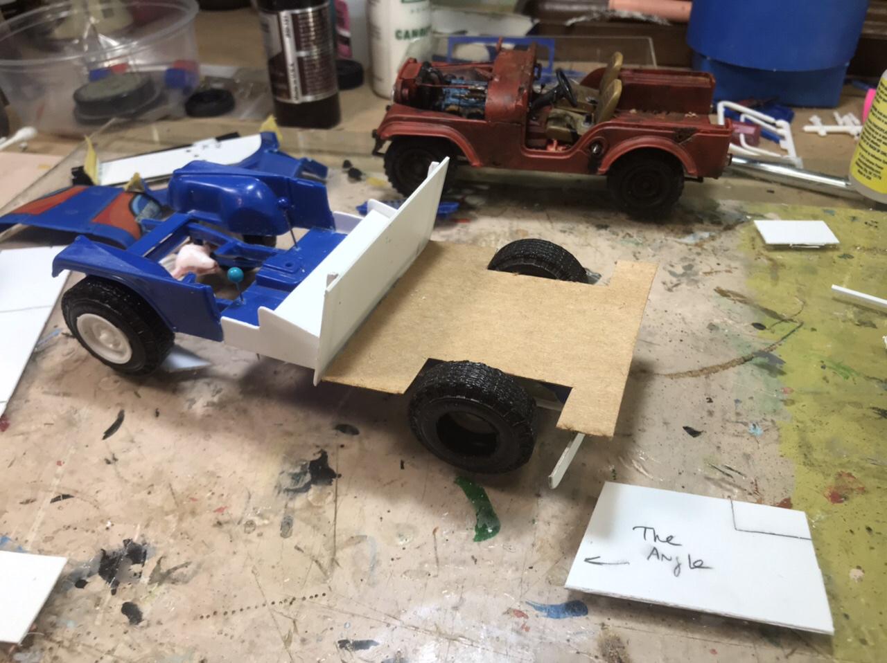 Next installment, Saturday’s progress... First I cut out the sides per the dimensions of my cardboard template. Note that they are taped together. Once I cut out two pieces that mirror each other, I tape them together and sand the edges together to assure they are the same size and shape. Next I fitted a cardboard template for the bed. It took two tries to get it the right size and wheel openings in correct place. Two things.. the white plastic out front is the template to match the sides with the angle of the seat back. I work on glass because it’s perfectly flat. I set the body on the glass, set a piece of scrap plastic next to it and traced off the angle. Once I cut the plastic I checked it against the body, and sanded the edge until they matched well. Now I can easily trace that angle anywhere I need. Second thing to note.. look in the front of the cab and you’ll see a couple of pins sticking up. I drilled out the pathetic match pins MPC provided and replaced with metal. This is important as I measure / cut / fit the body parts together, as this keeps the body true and square on the chassis. And where we are right now.. using my cardboard bed floor template, I committed it to plastic. I was pleased with it and it’s straight fit against the seat back / front wall of the bed piece. I wanted a bit more of a stronger joint than just the edge of the .040 sheet (which just happens to be one scale inch— .040” x 25= 1, which I figure into my calculations). I used Evergreen angle on that mating edge, hiding it under the bed.. once chassis is finished, it will appear the bed fabricator used some angle iron in this crude assembly! I just glued the mating edge right before I took the last photo. The tire is sitting on top of the piece to weigh it down until the glue dries. The bed floor is attached to the cab now, but not to the chassis. I will drill and pin this to the frame at the high point of the rear wheel arc. Very important to plan how it will all fit together and glue / mount now so I’m not stressing with I’ll fitting finished parts later! The next step will be to make the wheel wells prior to gluing the sides into the bed. I know the dimensions and will cut them out of the small pieces of scrap plastic we’ve generated. Once it all looks good, I will glue the bed sides and wheel wells at the same time.. I’m counting on the wheel wells to help hold the bed sides straight. Until next step! -