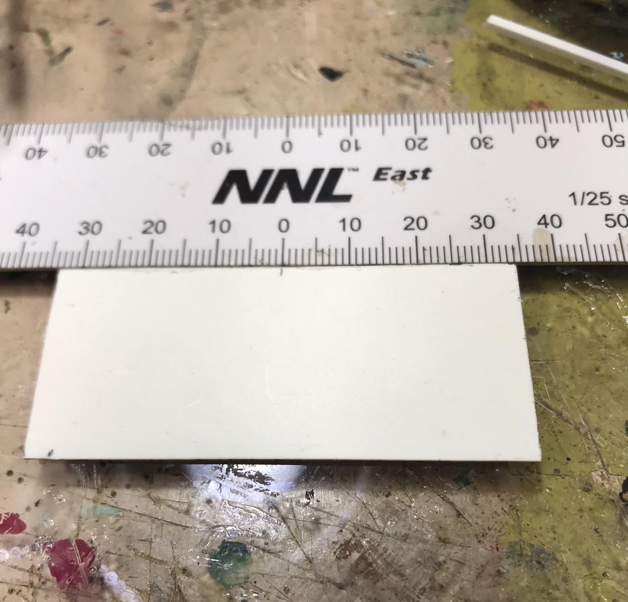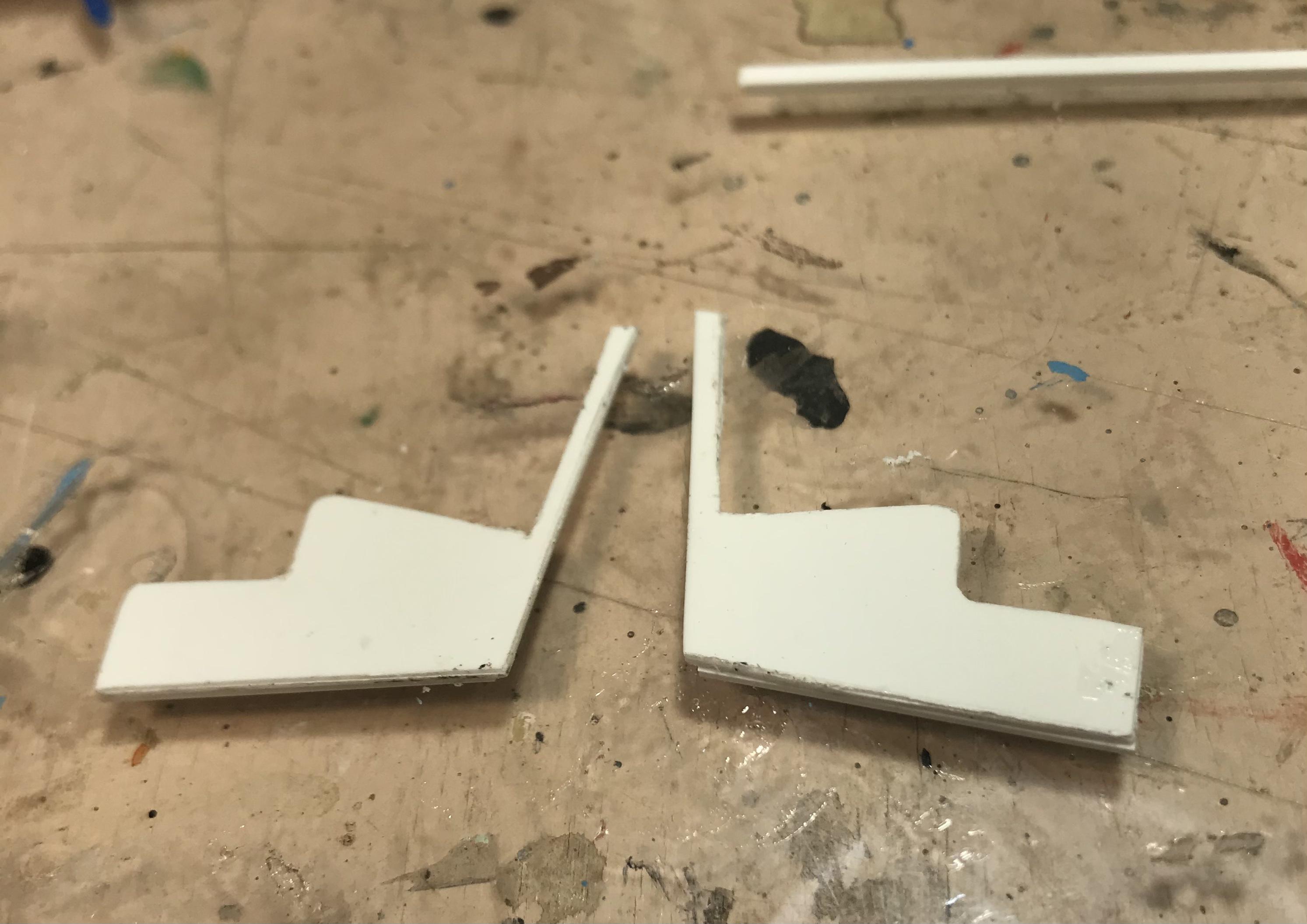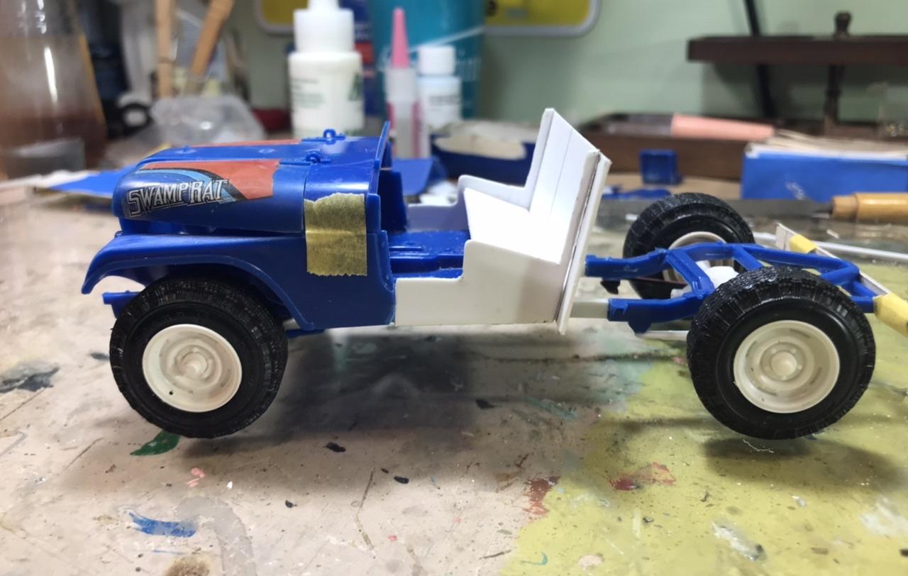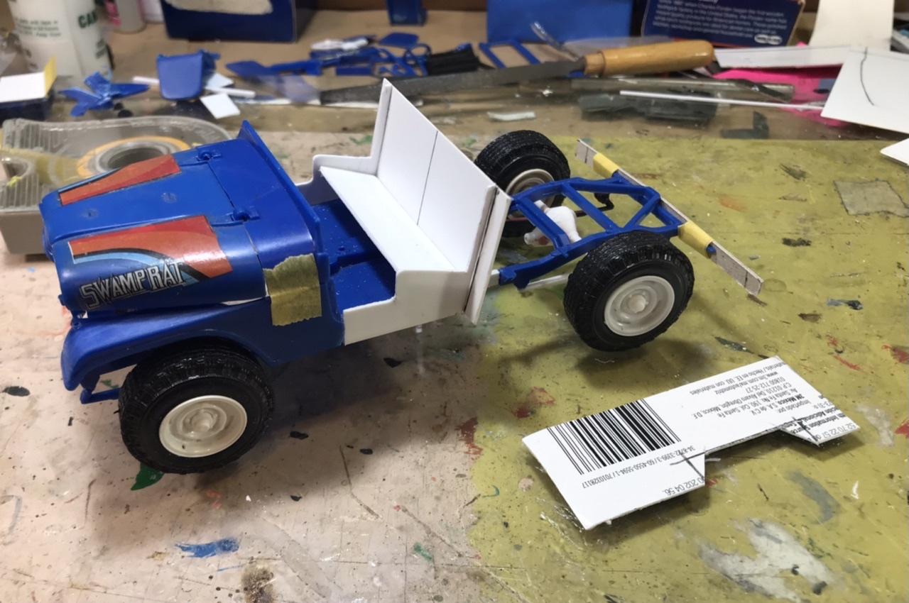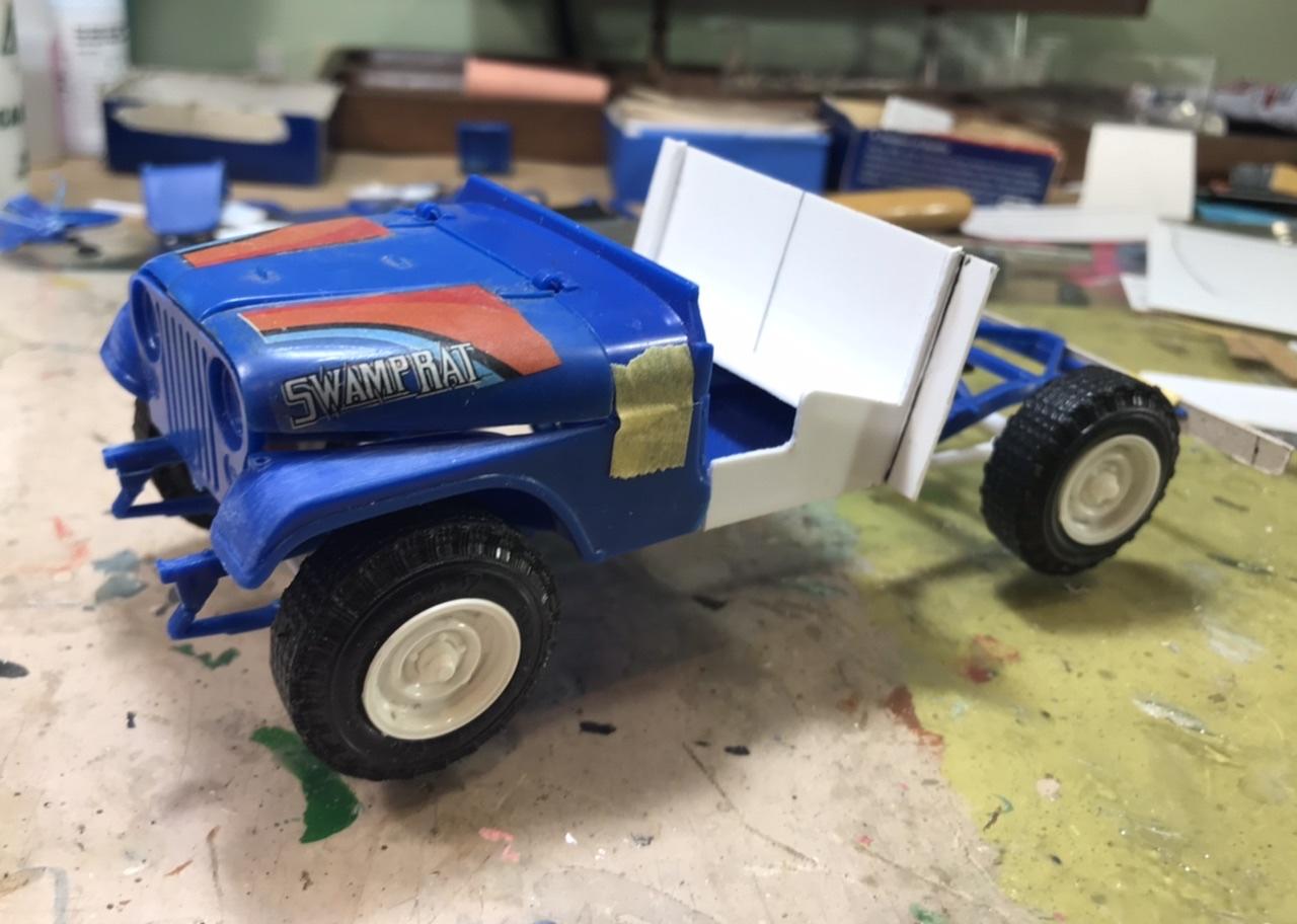 That would be great! I may go snoop around Google Maps some more! It would be an incredible score! Some more work today. I have the entire box worked out In cardboard and 1:1 dimensions. I prefer to work in real world dimensions from my years designing and building office space. I’ll go through this bit of progress in detail, hoping folks will find it useful. If not I’ll go away! You already saw my cab side panels so here’s the back panel. The main pieces are all .040” Evergreen sheet, their item 9040. There are two 6” x 12” sheets to a pack. Cost about $3.50 so not all that expensive, but still I work my patterns in cardboard before committing to plastic. I measured the new fabricated body width as 68” across. So in the above photo you see the panel was cut to 68 scale inches. I used my nifty centering ruler to mark off the center point. We will be working all of our dimensions off the center. Note that I had determined the height of this panel needed to be 30” as it is parallel to the windshield’s bottom glass edge. I measured the Jeep’s width at 58”, giving the rear box 5” wider on each side. Here we have measured that off. The cab side panels I cut off were a bit thicker than the .040” plastic so I added a bottom edge to them. Once that dried, I was able to center the back panel right in place per the measurements I drew on it. The metal bench seat was one of the things I found interesting on the truck! That was easy, since it fit between pieces. I just measured off what I needed and glued it in place. Next step will be making the rear bed box. I have the pieces all templated in cardboard, and I was waiting for that angle to be defined at the front of it. The parts may not be perfect, but I’m having fun! -
