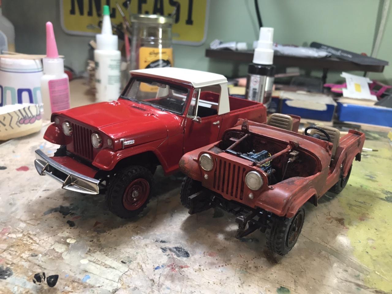 Both pickups look great! This year I built three green 1950 Chevy pickups! I get stuck on color too. For the Jeep I just finished I couldn’t picture it in any color so I left it to chance. I went to the store the other day and decided that I’d paint it to match the first Jeep I saw. As I waited at the stop sign to get out of my neighborhood, an orange Jeep drove by. And that’s what I did! -