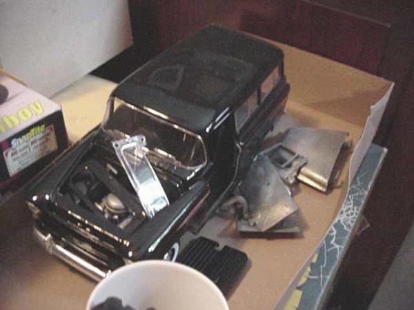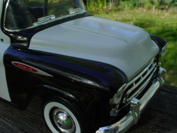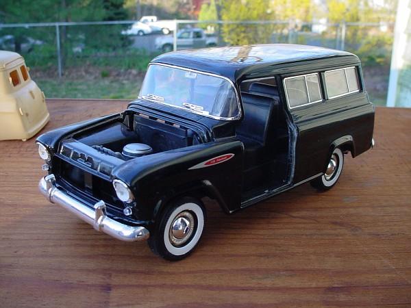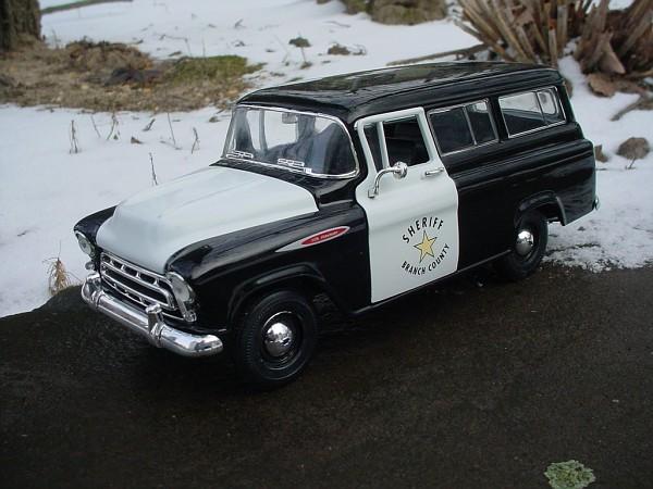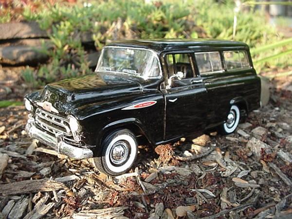 1. When I posted a few pictures to the diecast section I came across pix of this one. A pretty elementary modification, but took forever as usual. So here goes... A Jada diecast Chevy Suburban as I received it many years ago. As I looked at it I kept seeing a police vehicle.. So I did what any modeler would do.. I took it apart! I did have plans to detail out the rather simple interior with new seats and stuff, but as I sat forever, I decided simple would be better. The one thing that did bother me was the flat hood. The 57 truck had those wind splitter hood bumps like the passenger cars. I thought about simply swapping in the hood from the AMT 57 Pickup kit but the hoods were radically different. So I went about creating those ribs. If they look familiar, yes I whittled down a pair of tooth picks! And in the end, good enuf for a shelf diecast! I did strip and paint the hood, doors and rear gate. I decided the original black finish was again, good enuf! And this was how it sat for years. I did get rid of the whitewalls and full wheel covers. Decals from the Johan 59 Rambler wagon kit.