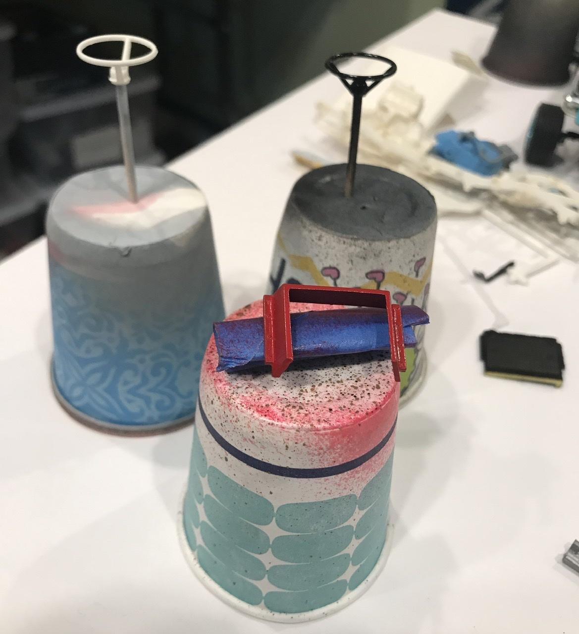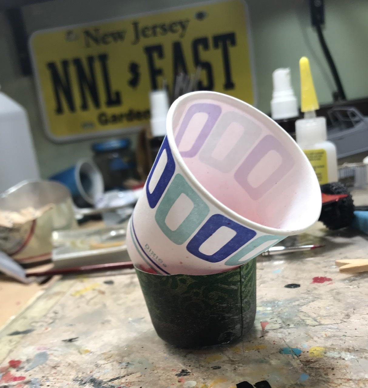 15. I've meant to do this post for awhile, and today I was reading a post regarding spraying a bit of spray paint to brush. Everyone recommended spraying a bit into the can cap. Here’s my alternative. I use these little Dixie brand paper cups extensively in the model room. As for spraying that bit of paint, I use a cup. I also have a previously used one cut down as a base so the paint pools down in the bottom edge. Here’s the cups, straight from the grocery store. I used to pinch a few from the bathroom but then splurged and bought the box of 200 for maybe $3 for the model room. Be sure to get these plain paper ones. The wax coated ones will melt wax into your paint and the plastic cups will melt with hobby paints. They also make great little paint stands. You can tape parts to them or poke holes in them for parts that are mounted in toothpicks or pins. If a part is heavy just stack cups into the base as ballast. Ive used cups to hold parts in place while drying. And to hold things while I’m working. And of course I keep small parts in cups to keep them from going astray. While this post is pretty much elementary, I’m sure someone will benefit. Nobody can say they can’t afford it!