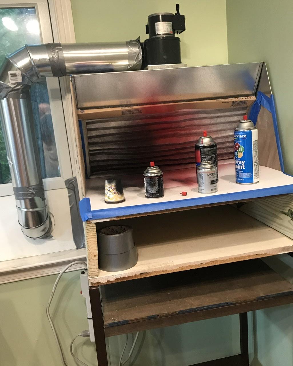 It’s alive! Finished it today. I decided with this booth I would do real venting through a permanent vent! I got tired of opening the window and tossing flex duct out. It’s fit tight enough that there weren’t any leaks, then I taped the joints anyway. I’m happy! And the view outside. With the booth running. That’s a plastic board I had set aside for this purpose. Now onward to finishing some models!