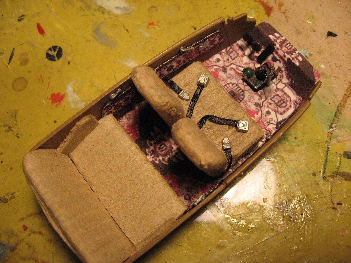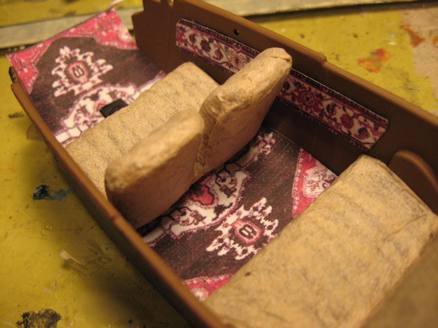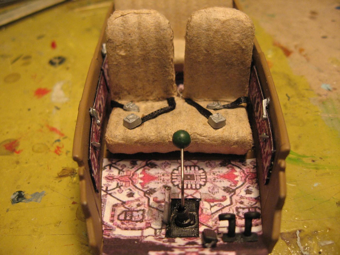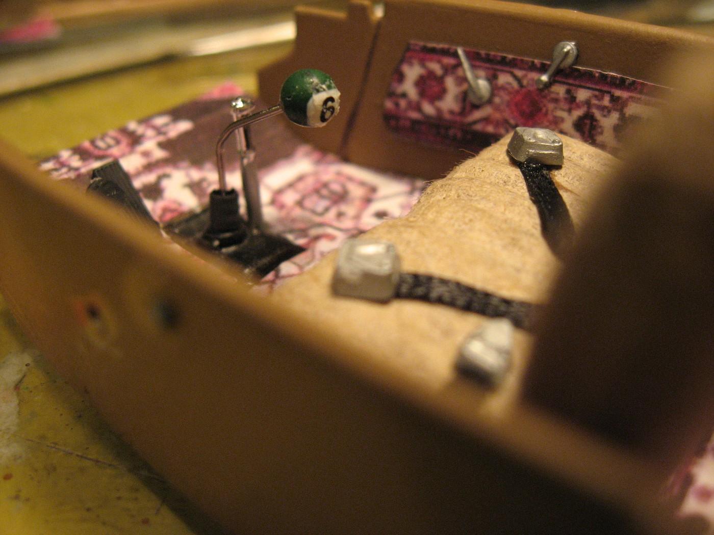 Engine is from 41 Plymouth. Carpet is a Victorian rug that I printed to 1/24 scale on a dollhouse miniatures site. It’s just printed on paper and white glued. The bench seat started as the kit’s buckets, I filled in the middle. The high back look is because the interior is sectioned to match the body. I made a six ball shifter instead of the typical eight ball since the car has a flathead six.