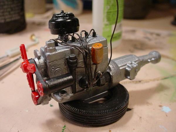 Thanks! That is the flathead six from 41 Plymouth kit. Tail lights are parts box big truck cab lights, I was thinking 61 Plymouth. Dash is 53 Stude. Seat covers were made from Taco Bell brown napkins to look like burlap. I made the front seat. Carpet is a doll house Victorian carpet I printed.
