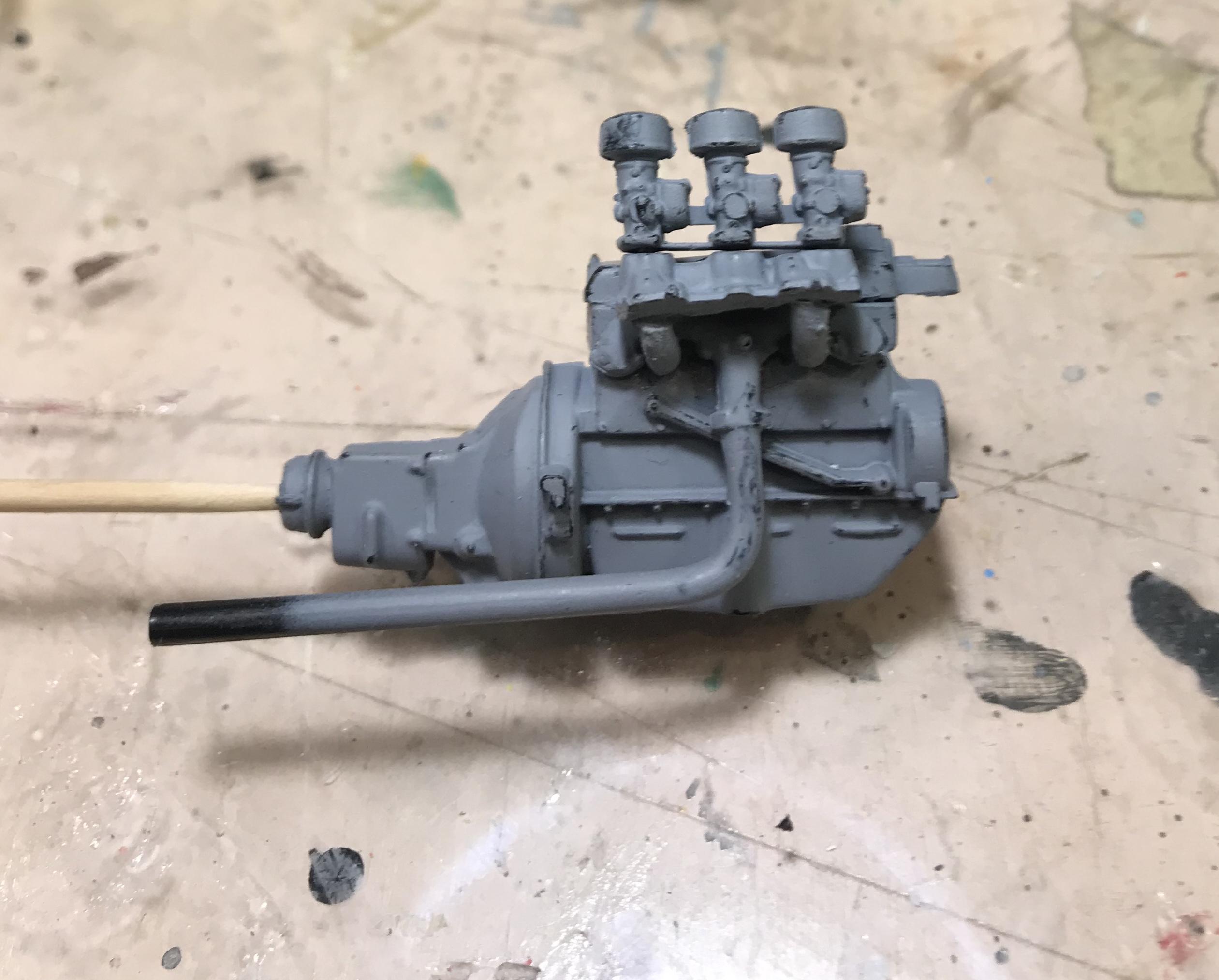 I wanted to use the Monogram kit’s four cylinder partly because the V8 in this series is too new to qualify for TROG. I also saw vintage speed equipment on the real cars so I had the bug to hop it up. I didn’t know of any kits, especially compatible with the 1/24 kit. Nor did I want to order and wait for anything aftermarket if even available. I saw this project surely heading down that road to over complicatous! I definitely wanted to lose the kit’s downdraft carburetor. I had a wild idea of multiple carburetors and thought two would be the max. Then I found pix on the Internet of a hopped up pickup with three carbs on it! I pulled out the triple carb unit and manifold that went to the V8 in this kit, and I found a better exhaust manifold. I spent some time with the photos, the mentioned parts, glue and putty and here’s where I wound up. Not sure how realistic it is, hoping convincing enough for a home welded hop up. It’s just mocked up and not glued in the pictures so it’s a little crooked