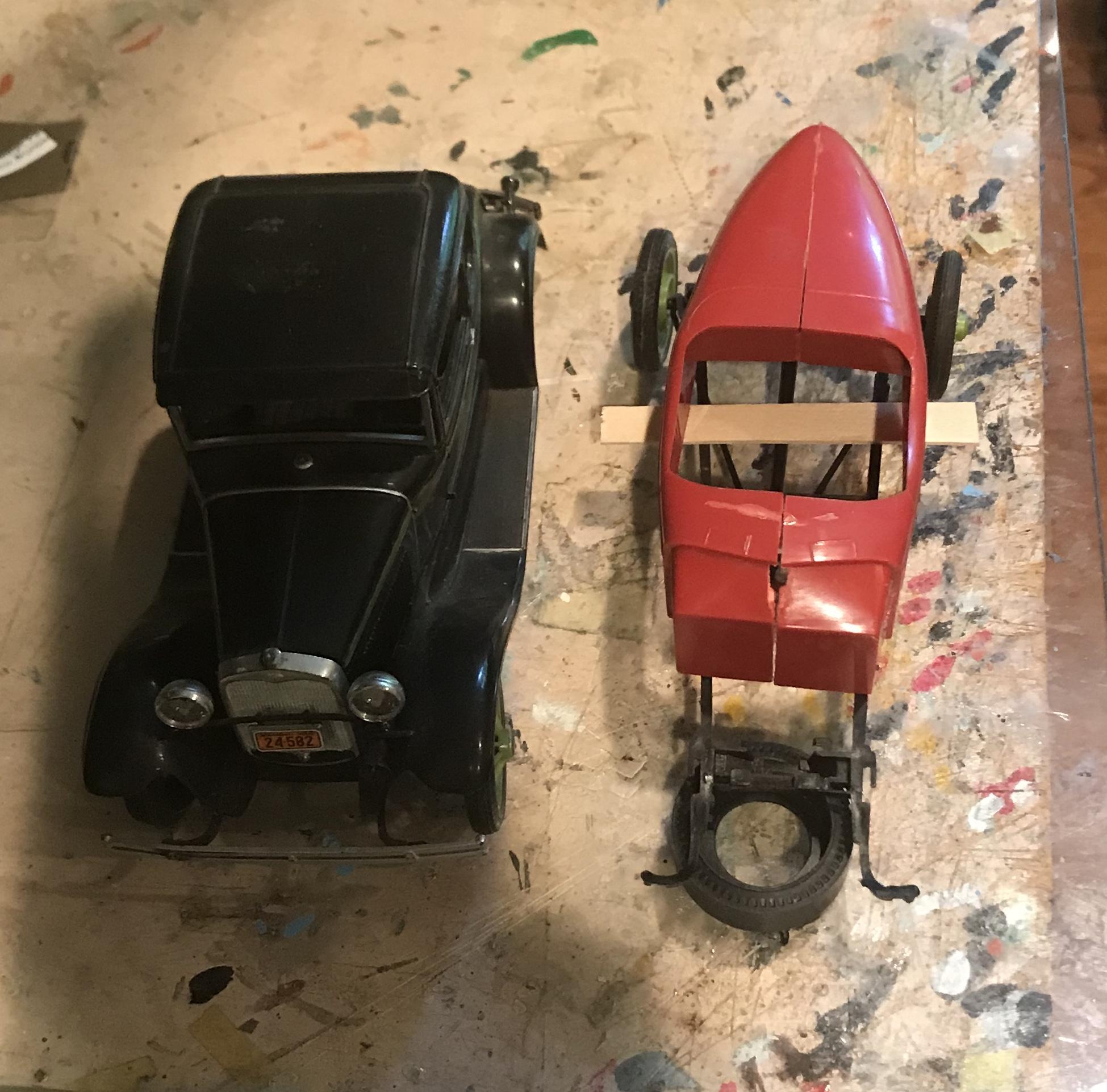 I had put aside thoughts of this project and fabricating an entire body around that 40 Ford hood. Then yesterday I came across an old built Auburn in my hoard. I forgot I had it in a box with a few 1930s junkers. This body should work well on a Monogram 1/24 Model A chassis. It will need to be widened slightly at the front to accept the Model A cowl.