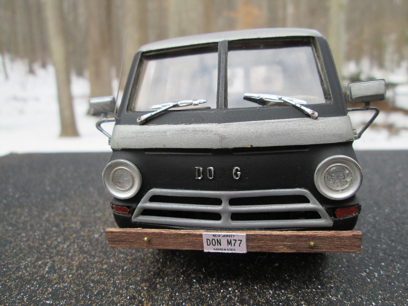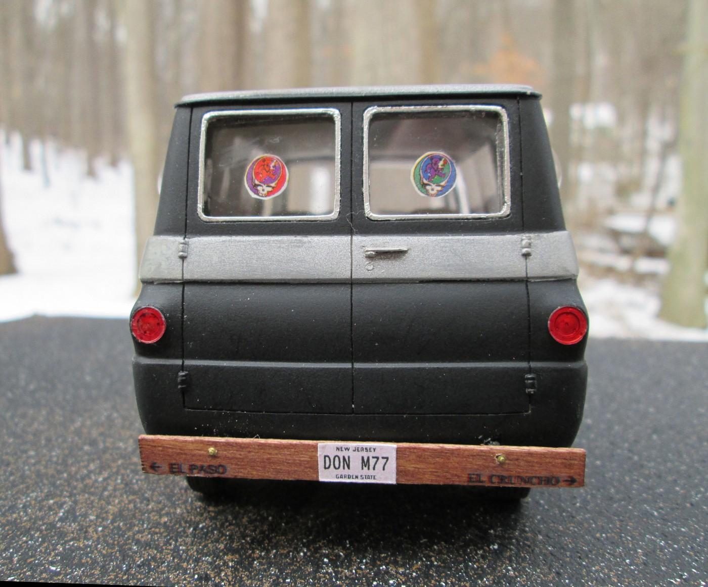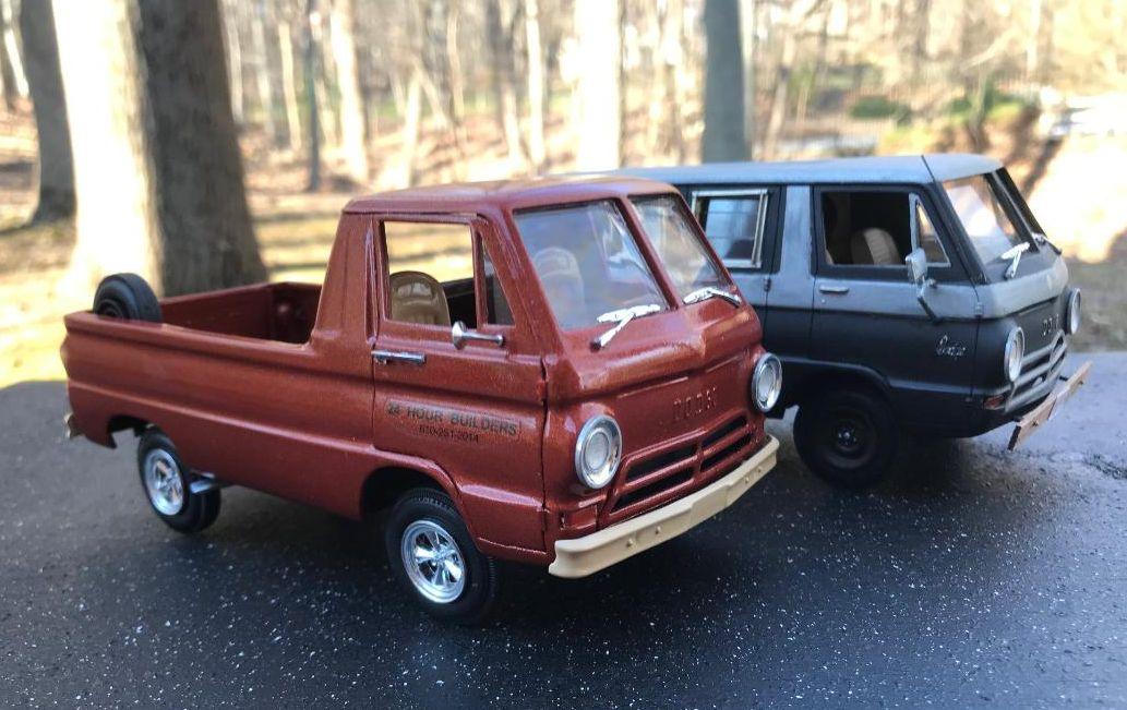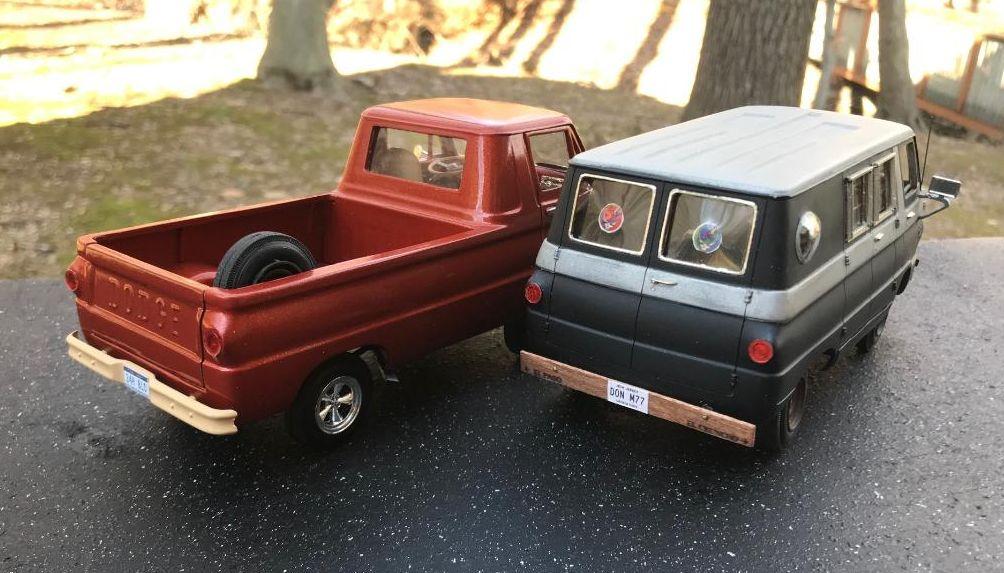 I built these a while ago and pulled up the pickup photos today for an orange theme in a Facebook model group. So I thought I’d share them as a pair here. Pickup was built as part of the 24 Hour Build a few years ago. No, I didn’t finish in time! I did make the 24 Hour Builders decals. The finicky fit and cleanup requirements of this kit took me quite a bit longer. I glued the doors shut and made appropriate size hinges to match the van. I also did a matching license plate. Once I was way beyond the time requirements I decided to have some fun and made this exhaust system. Used the kit 273 engine with zero detail since it’s buried up there. Once I glued the doors shut, I had to glue the interior engine cover in place. I did make bases for some custom buckets. I added my usual seat belts and glued down some paper with the pattern on it for carpet mats The van was done earlier and was a long languishing project. I finally finished it one year as a Christmas Amnesty Project. It is the Jimmy Flintstone resin body. It’s a replica of a van a friend drove back in 1977, as close as memory will allow. I posted it in my town’s Facebook group and people identified it! My buddy Don had the rearranged letters to spell DOG. The plate is a tribute to him. The van was brush painted over riveted rust repairs and I tried to capture that aura. Greatful Dead stickers were saved for years, came from my cd club newsletter before we had the option to size and print our own! The real van had a slant six so I included one. I only finished the bottom end of a scrap engine from an old built up. I made exhaust. Interior used a sheet of self adhesive doll house carpet. I hope you enjoyed seeing this pair!