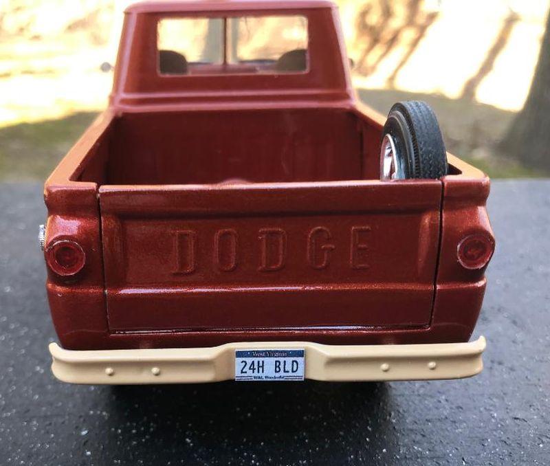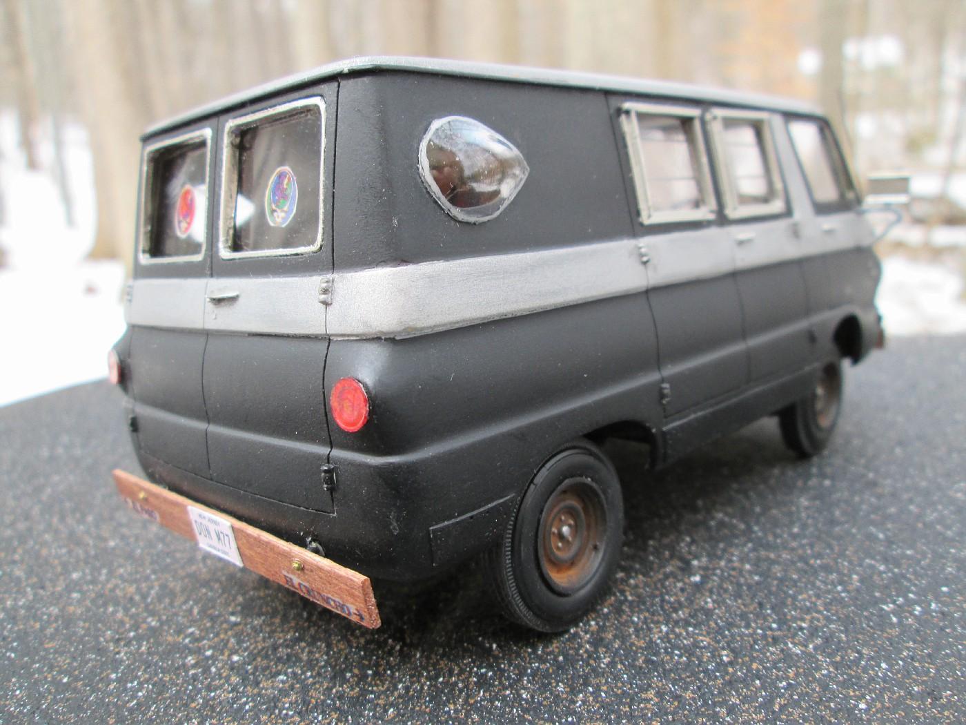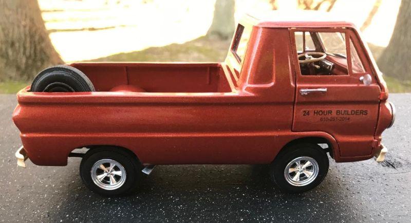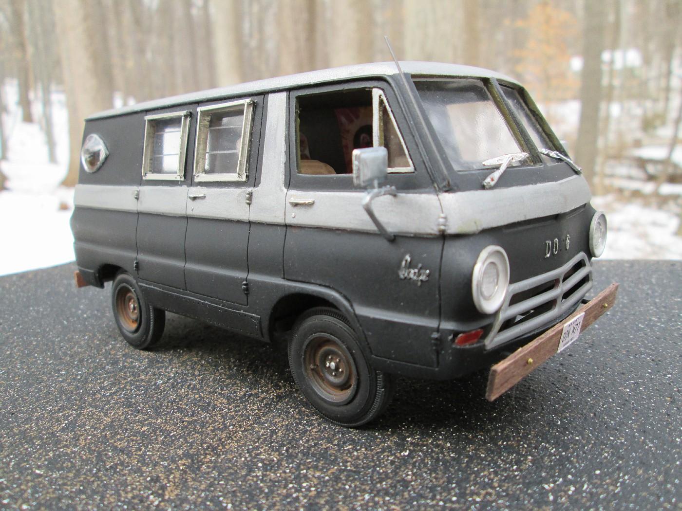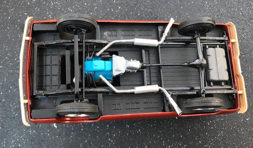 I built these a while ago and pulled up the pickup photos today for an orange theme in a Facebook model group. So I thought I’d share them as a pair here. Pickup was built as part of the 24 Hour Build a few years ago. No, I didn’t finish in time! I did make the 24 Hour Builders decals. The finicky fit and cleanup requirements of this kit took me quite a bit longer. I glued the doors shut and made appropriate size hinges to match the van. I also did a matching license plate. Once I was way beyond the time requirements I decided to have some fun and made this exhaust system. Used the kit 273 engine with zero detail since it’s buried up there. Once I glued the doors shut, I had to glue the interior engine cover in place. I did make bases for some custom buckets. I added my usual seat belts and glued down some paper with the pattern on it for carpet mats The van was done earlier and was a long languishing project. I finally finished it one year as a Christmas Amnesty Project. It is the Jimmy Flintstone resin body. It’s a replica of a van a friend drove back in 1977, as close as memory will allow. I posted it in my town’s Facebook group and people identified it! My buddy Don had the rearranged letters to spell DOG. The plate is a tribute to him. The van was brush painted over riveted rust repairs and I tried to capture that aura. Greatful Dead stickers were saved for years, came from my cd club newsletter before we had the option to size and print our own! The real van had a slant six so I included one. I only finished the bottom end of a scrap engine from an old built up. I made exhaust. Interior used a sheet of self adhesive doll house carpet. I hope you enjoyed seeing this pair!