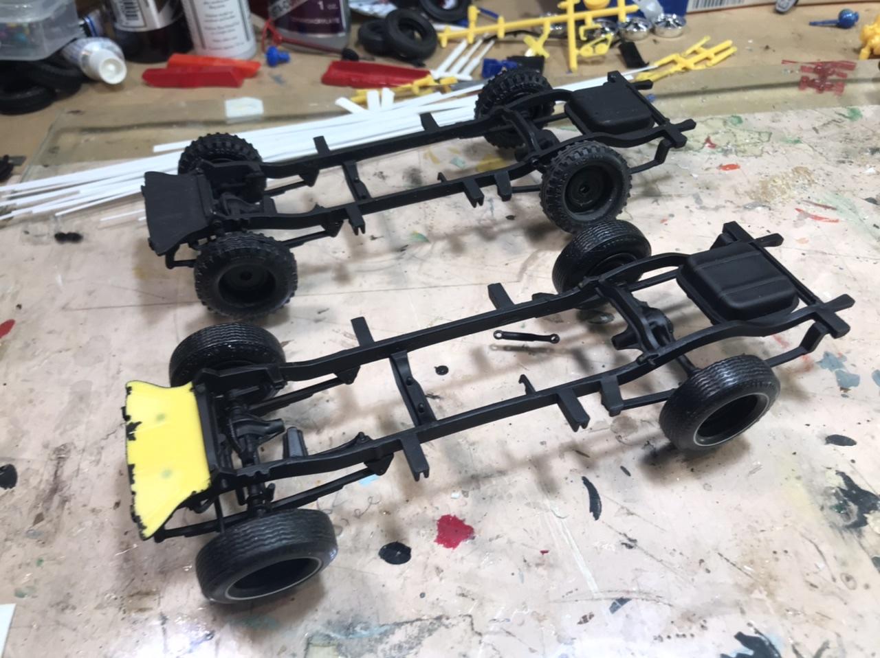 Two Jeepster chassis cleaned up, assembled and painted. I also have the engines assembled, drilled and in primer. Two bodies are also in primer. I had to sand off the two tone chrome trim on one of them.. lots of imperfections to fix on those old MPC bodies! Typical kit of that era.. bed was flat, pictures of 1:1 show ribbing so I added it with Evergreen strips.