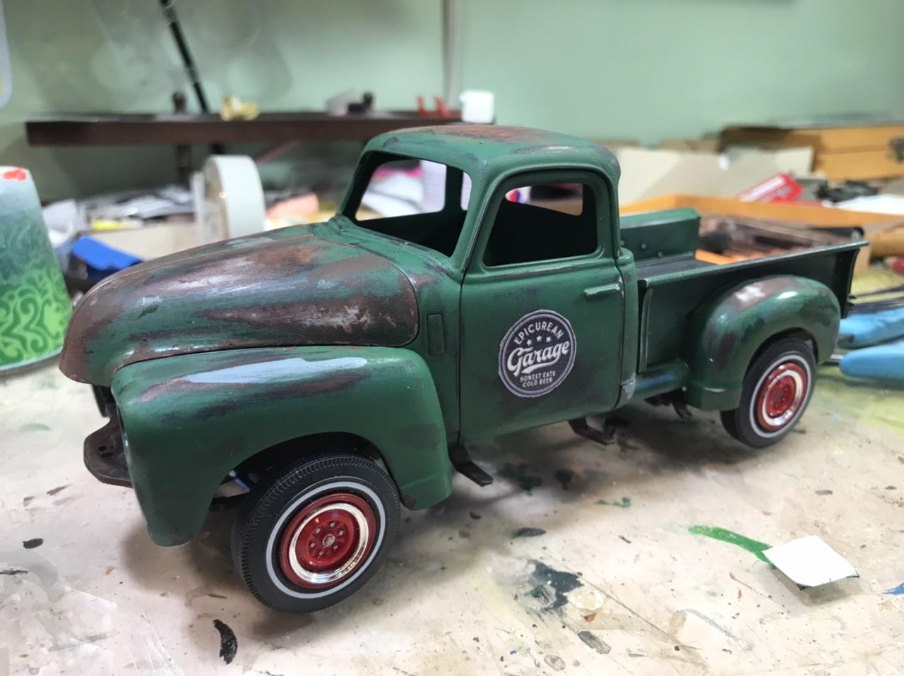 17. Cool 41! I may put mine in my queue! I’m working on my 50 Chevy pickup truck daily. Yesterday afternoon I weathered the chassis and hood. I put the decals on the doors, added setting solution and put the body aside overnight. I should be able to assemble chassis and weather the body and bed today.