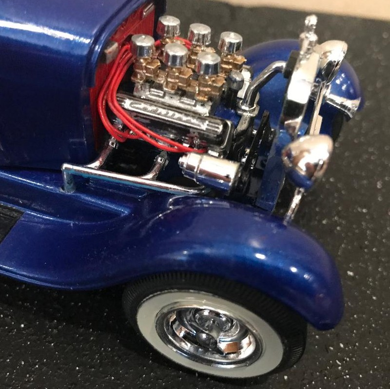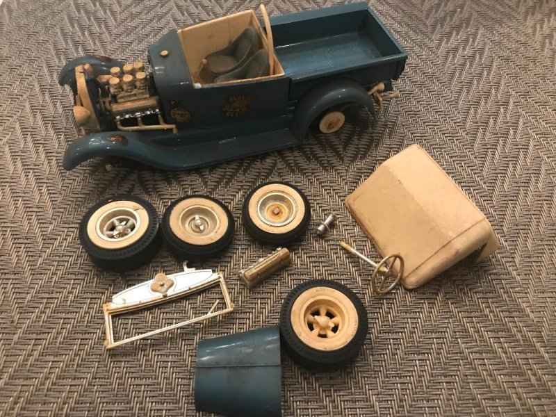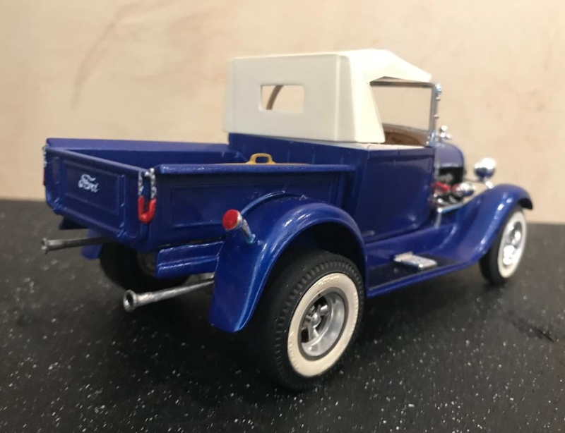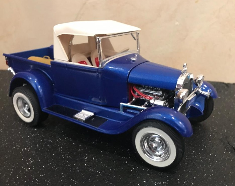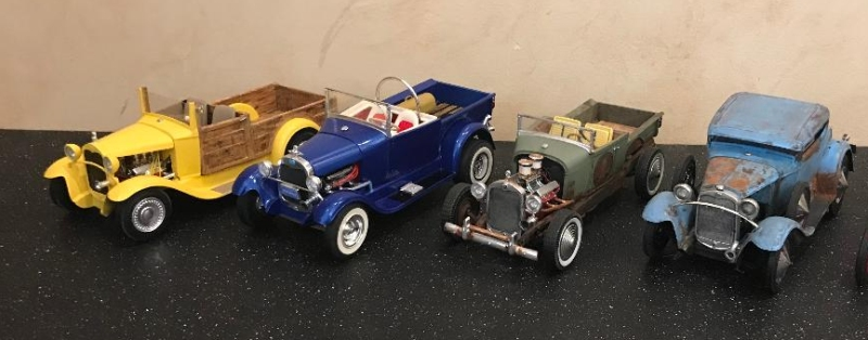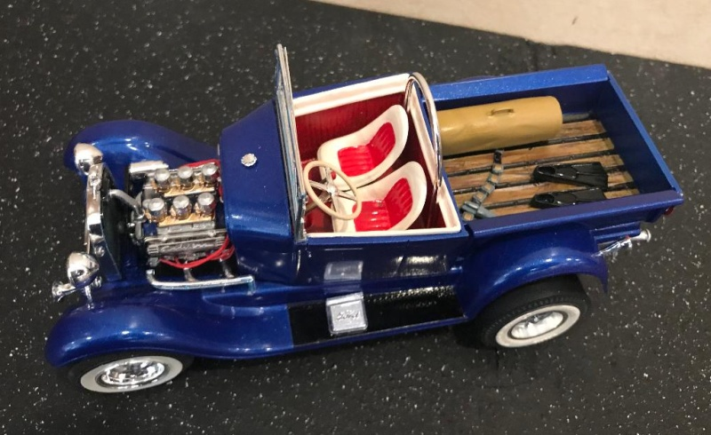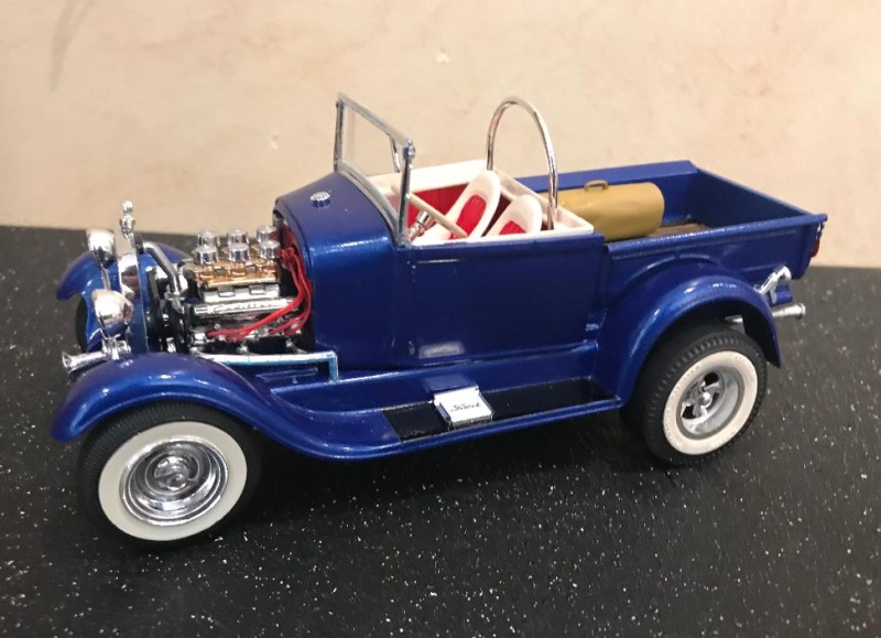 It started back in September when I found this old built up of the ancient Monogram Blue Beetle Model A pickup. I've been on a tear with this series of Model A's so I grabbed the bag o' mess for $10. And here we are today! Sorry for my dark indoor photos, it's snowing outside! And I promised people pictures last week and didn't get time to take proper ones! I reused as much of the original kit that I could restore. The main parts, like the frame, body, fender units, interior, pickup box and engine are all originals. That was supplemented with both old and new parts. I do have a recent Blue Bandido kit and stole the scuba gear, wheels, tire white walls, roll bar and a lot of small parts. I did find that the old and newly retooled parts did not play nice together. Another difficulty in restoring the original is that the chassis, fender unit and pickup box were solidly glued together. I had to clean them up and paint, restore etc it all as a unit. Fortunately the body and interior did come out and apart. The interior is an original and was tough to mask. The seats had multiple curves and no good separation line to scribe tape against. I did these a couple of times and they still aren't perfect. They are originals. The original bed had a bad tire burn in it and I managed to disguise it with strategic painting and placement of scuba parts. The engine is original and the Cadillac script isn't on any of the subsequent releases, including the Bandito. New parts include the radiator shell, alternator (or is it a generator?) and headers. The air cleaners and original valve covers were done in Alclad. I wired the engine with a prewired distributor. Roof is original and took a bunch of work to get ancient glue stains off of it. The body also had a lot of glue and mess on it. I did the best I could to clean it all up and it was primed a few times with Duplicolor gray. The final color is Testors Extreme Lacquer Star-Spangled Blue which really pops! The original tail pipes had flared ends, but were not usable. All of the newer ones I had did not, so I added the ends myself. And the group photo. My ROG phaeton is not in the photo. As I've worked on this Monogram series the past few years I've tried to make each one completely different, with different kit accessories and options. I've had fun with these.