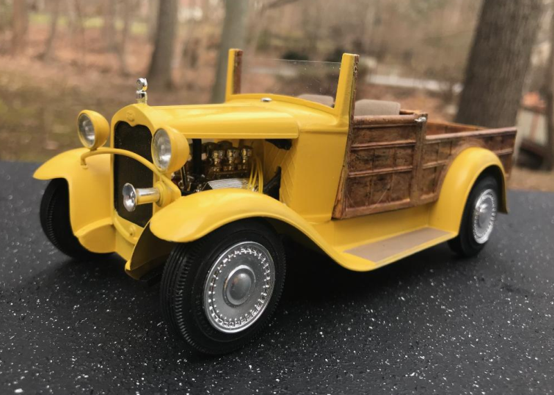 2. Here's mine from last year. I did finish on time. I started out with the Monogram Model A Woody Wagon. My modifications were planned ahead of time and executed in the first hour. I simply cut the roof off, and added half round for the bed sides. A tail gate from another kit made the back of the cab. I used a prewired distributor and added the custom wheel covers from the AMT '41 Plymouth. Bucket seats are the custom ones from the '49 Ford, I just knew they came from my parts box, someone told me later on! Paint is Duplicolor fast drying lacquer! Like Terry said, as long as you stick to your plan and don't go crazy with modifications, it is possible to build a decent model in 24 Hours!