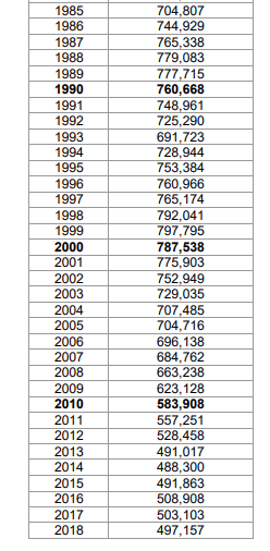 25. Thanks for the kudos Pete! I went back and read my comments in the previous thread. I stand by them and don't wish to retype it all here, so if you are interested in how it really works, go and read the thread Pete suggests! As I had said, more and more is being automated. Humans touch an extremely small amount of the mail. It's all sorted and coded by high speed equipment. And that equipment actually scans all your mail. You can go online and look at the mail you are going to receive before it hits your mailbox! And as they automate, they have been consolidating sorting centers and cutting headcounts, which is cost savings. Here's a chart showing the total number of USPS employees year by year: If you look at that high in year 2000 of 787,538 down to the 2018 total of 497,157 which is like 63% of the 2000 high working in the system today. That's impressive! Things do go wrong. The address readers can misread bad handwriting. A sender can put in an incorrect zip code. The mail moving automation routes mail by the bar code across the bottom of your envelope. That code has your address right down to route order and house number! And most mail shows up at the final post office already sorted in that order.