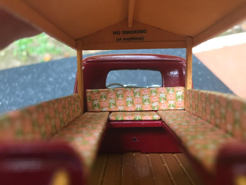 Ken, not to bomb your thread, I thought this could give you ideas. This one started out with Paddy Wagon sides too. I did make my own back panels from two 1950 Ford tail gates to get the Ford script on them. I made my own steps. For passenger seats, I found this was the best configuration. If you want to be able to access the cab in yours, just leave out the center seat. The seats are nothing more than Evergreen sheet cut to size. The cushions are two layers of basswood, covered with printed paper. Hope this helps! -