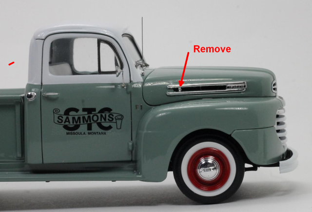 Alexander, your model is very nice. This 1950 Ford is one of my favorite kits so I really like your work. One small thing if I may help. That small bit of plastic is part of the mold, but not on the real truck. It should be cut away. Otherwise perfect! You also could use a license plate in your empty frame! In the USA, our 50 states all have different state issued license plates. You can make one here: www.acme.com/licensemaker Select the sate of Montana, and the year of 1949 (or you can choose a later plate if you'd like) Save the plate to your computer. You will need to reduce the size of it to match your model. I hope this helps! Your model is great! -