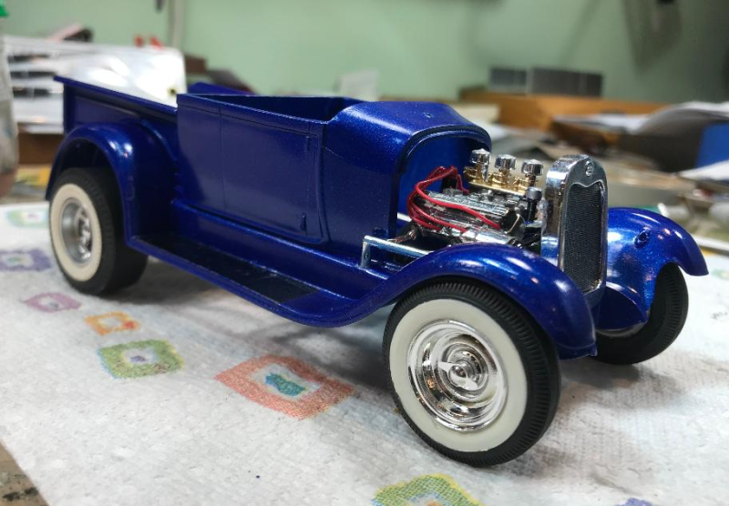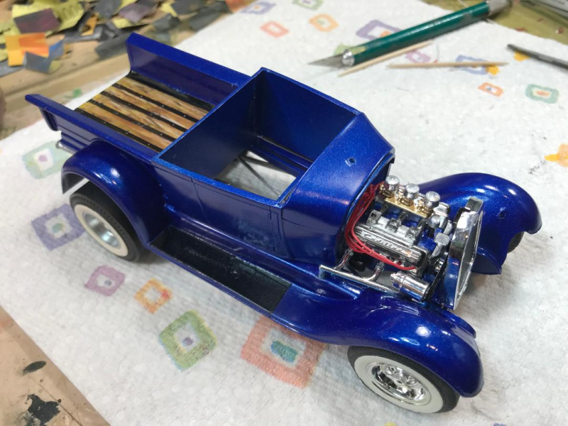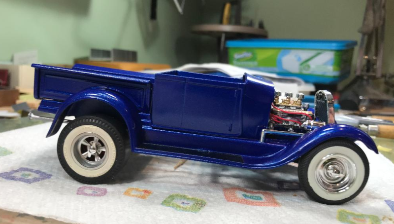 22. And we are up on wheels as of last evening! It sits well and I'm happy with it. The body and radiator shell are just sitting on it for the photo. I can tell you that the parts in the recent Blue Bandito kit were retooled because they don't play well with parts from the original issue kit. I had to use the new kit axles since my originals were destroyed, and the mount points on the old wheels are different. I do have the old wheels on the back, but gave up and used the new kit wheels on the front. The tires are old originals and I painted the white inserts since they were messy. One set of carbs still need to be put on. And I will start over with two pairs of seats, hoping to get two usable ones in the process. The seats are tiny and should be white and red two tone. The color separation lines are faint and very hard to mask, resulting in my current issues. Otherwise this one is ready to button up.