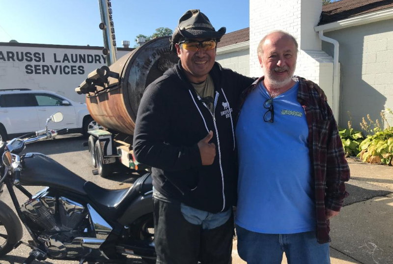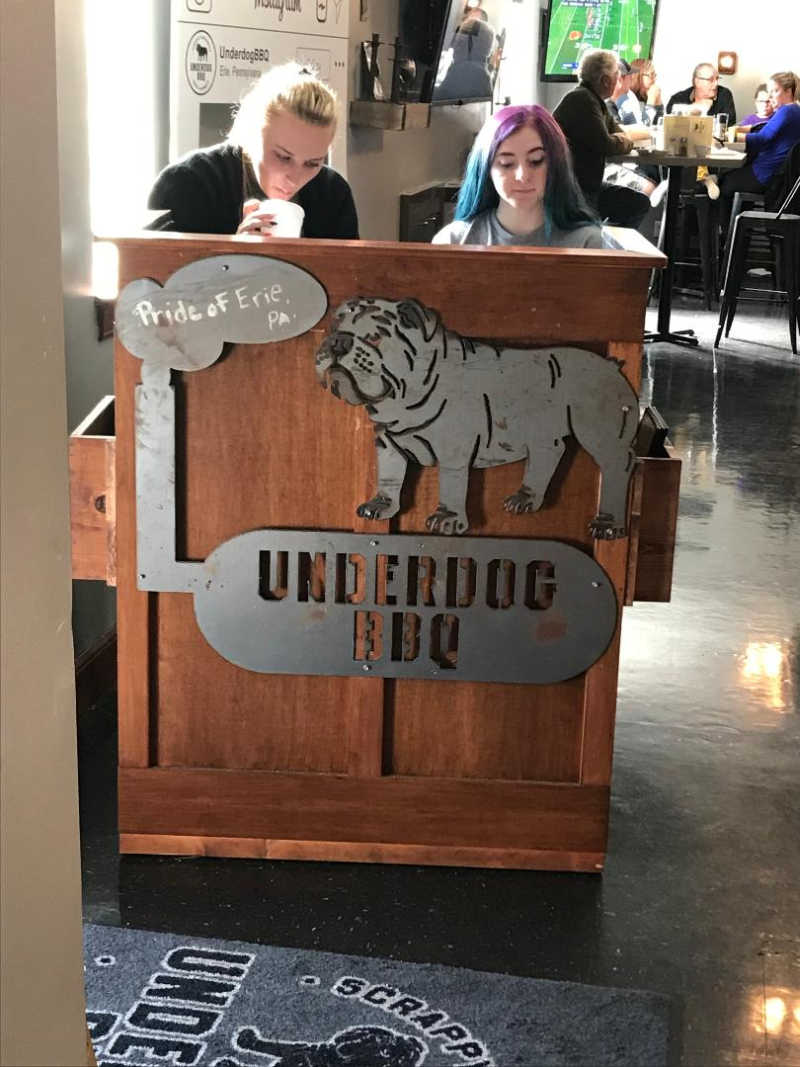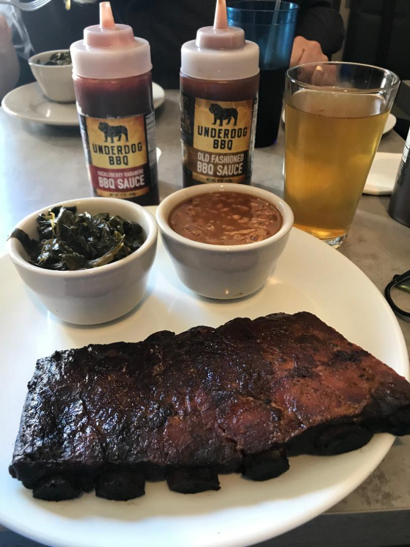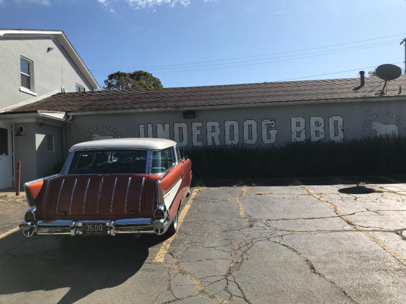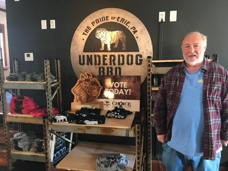 How many of you watched the "Undercover Billionaire" series on the Discovery Channel? It was an 8 part series, you need to watch the episodes in order, where a self made billionaire was dropped off in a city where he knew nobody, had no contacts, with $100 cash and an old pickup truck. His goal was to provide for himself and create a million dollar business in 90 days to prove the American Dream was still alive. It's well worth watching, and you no doubt can DVR or watch on demand. Anyway, after watching the series, I noticed that the locale of Erie Pennsylvania was only a half hour off my route home from Toledo on Sunday, after attending the last NNL Nationals. So Bill and I were up to trying the best ribs in Erie! And to see the restaurant that was created during this series. Here's the famous Underdog BBQ that won the Erie Rib Festival for both best rib and best sauce! And you can't find fault with the car parked outside! Where you are greeted The best ribs in Erie! Straight from the slow cooker with nice rub on it. There's two of their sauces, and their own Underdog lager beer! I only got half a rack because I had their smoked wings prior! Here's me with their swag. Yes, I did buy a t-shirt. How could you not? And here I am with Cowboy Mike, the pit master! He was a major player on the show and was there on Sunday. A truly nice guy who talked with everyone and thanked us profusely for coming! Behind us is the smoker they made for the Erie Rib Festival on the show. And that's Mike's Harley. He drove off right before we did, so we followed him until our first turn. and that's what I had for dinner on Sunday! -