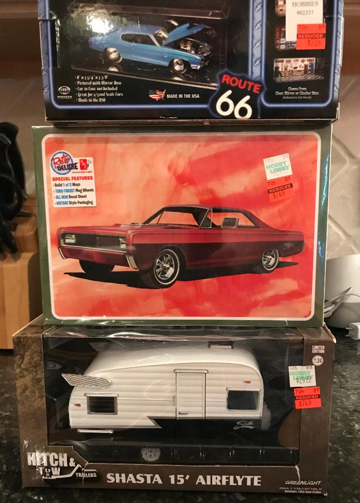 1. I stopped into my local store since I was passing it today. Nothing on sale in the kit aisle. Saw the same movement of more diecast onto the shelves that others had noticed at their stores. Went to the clearance corner and at first glance saw nothing, but once I moved a few boxes I found one '66 Mercury for $7.49, one of the show cases for $2.29 and interestingly enough one of the diecast Greenlight trailers for $7.49. I grabbed all of those! I did leave behind 3 of the cabin cruisers... no sale at any price!