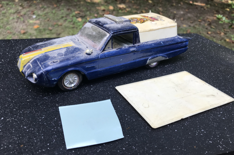 I screwed up the windshield on my 1950 Ford Jitney project so I went down in the model vault to see if I had an extra kit. I had already dumped a few copies of that kit into a bin that I've been working from, but no more windshields! I found an unsealed copy of the kit and headed upstairs with it. I was surprised when I opened the box to find stuff I know I've never seen before... hence, "What did I get today?" Aside from the kit, which I figured I bought as a parts kit from a guy at $5 each, and somehow never looked inside. There is a note inside the cover, "No Engine", but I was surprised to find all this additional stuff! A 1961 Ranchero custom, along with plenty of dust. I've never owned a copy of this cap before. It's not glued on, just placed on for the photos. That appears to be a '57 Ford hood and a full size pickup tonneau cover which I'll see if I can match up with an early 60s Ford or Chevy. Yea, I jumped for joy when I saw this one. Once I examined it, it's not the 1964 2 door wagon, but the later 1965 wagon with the door lines moved! Not a bad job but evident on the chrome trim. If you removed the body side molding it's pretty good. And of course it came with a ton of dust and cob webs. And assorted parts. Looks like a 1940 Ford grille and rear door from the sedan delivery. I have no idea where the red seat came from, 40 Ford sedan delivery is the first place I'll look.. a water ski and odd tire Two dashboards. Any ideas? Narrow dashboards, modern vents on them... Anyway, I'm pleased with today's findings!