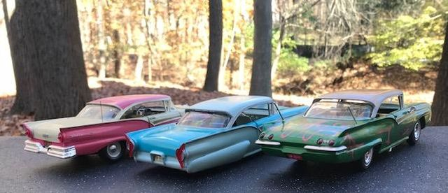 Everything you see were kit options offered sometime over the life of this kit. Note that it's been reissued over and over since the early 1960s. The green car is the earliest set of custom parts. I found this car in the bottom of a dealer's scrap box at a show. It had no roof or suspension. But it was so cool that i restored it. I also bought the blue car, and cleaned it up. It was missing the hood and I knew I wasn't going to match the paint, so I two toned it with the Tamiya Coral Blue. The tail lights on this one are the Edsel wagon ones that came in the kit too.