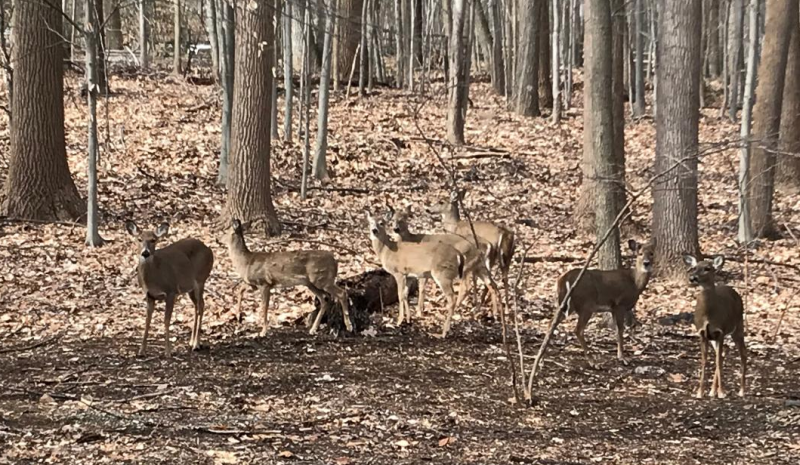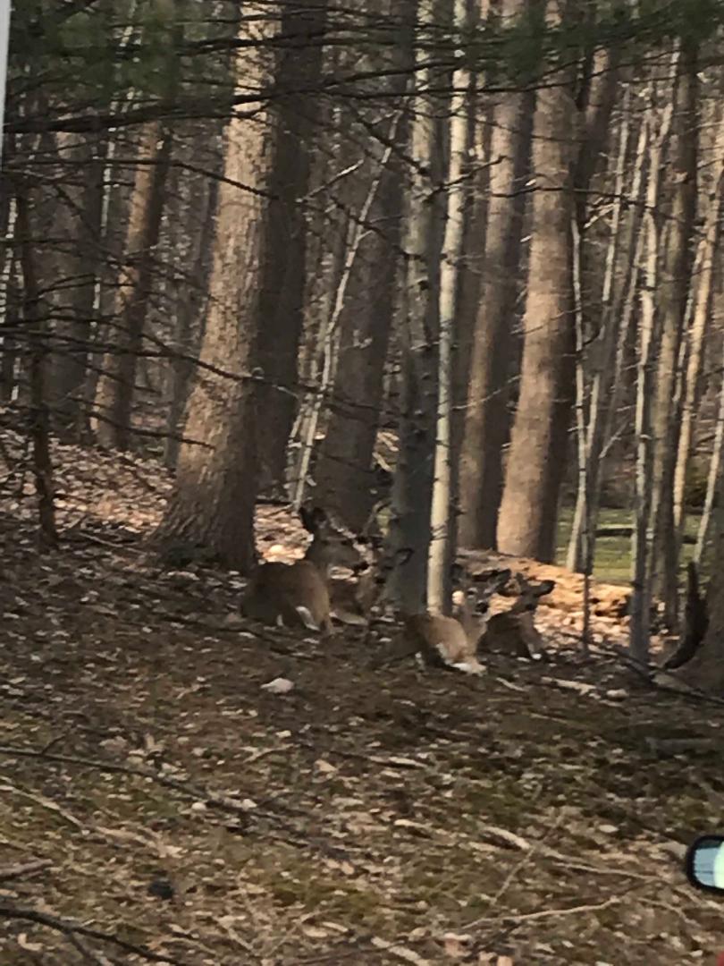 Don't go killing off the squirrel population on my account! I have a lot of squirrels here in Pennsylvania that stay outdoors! This guy I've named Howdy and he keeps his stash in this flower box that's on my deck. He's in and out of there all the time, and it's right outside the kitchen window where I work most days. So he's entertaining. A few years ago I was sweeping the driveway of acorns and realized I had nearly a bucket full. I was all set to put them either in the trash or back in the woods and I got an idea... I dumped them into Howdy's stash. He probably thought he hit the jackpot! And he will sit on this same branch and eat all the time. It's up high and parallel to my model room window on the second floor. I find it interesting that the squirrels in the region are brownish with touches of gray. In other regions I've seen pure black and pure white ones! And my little herd of deer for Rob... This is all seven of them. Some of which I watched grow from babies. We don't have any babies this season. But they are very tame and will stay there while we come and go. I got fairly close to get this shot and they all stayed there and mostly just watched me. And some of the girls just hanging out in the backyard. We walked right past them and the worst they reacted was curious stares.