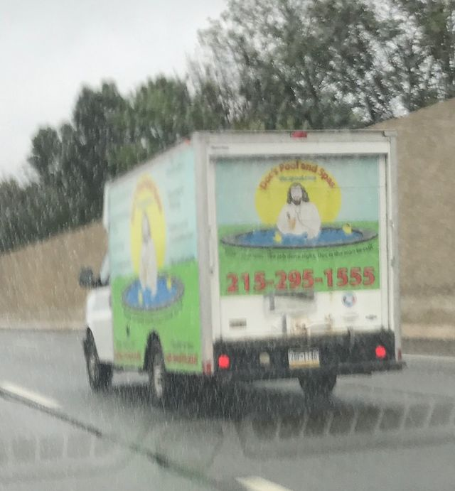 New Jersey Turnpike. I stopped for gas. I'm sitting at the pump and noticed this truck. My first thought when I saw the soft sides was that it was a car transporter. Soon enough someone opened a back panel showing off the apple green Porsche! I can only imagine what the rest of the cargo was! Pennsylvania Turnpike in the rain.. you had to see this one. Doc's Pool Service. The logo is Jesus sitting in a kiddie pool with rubber duckies! -