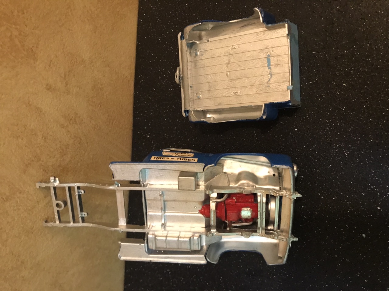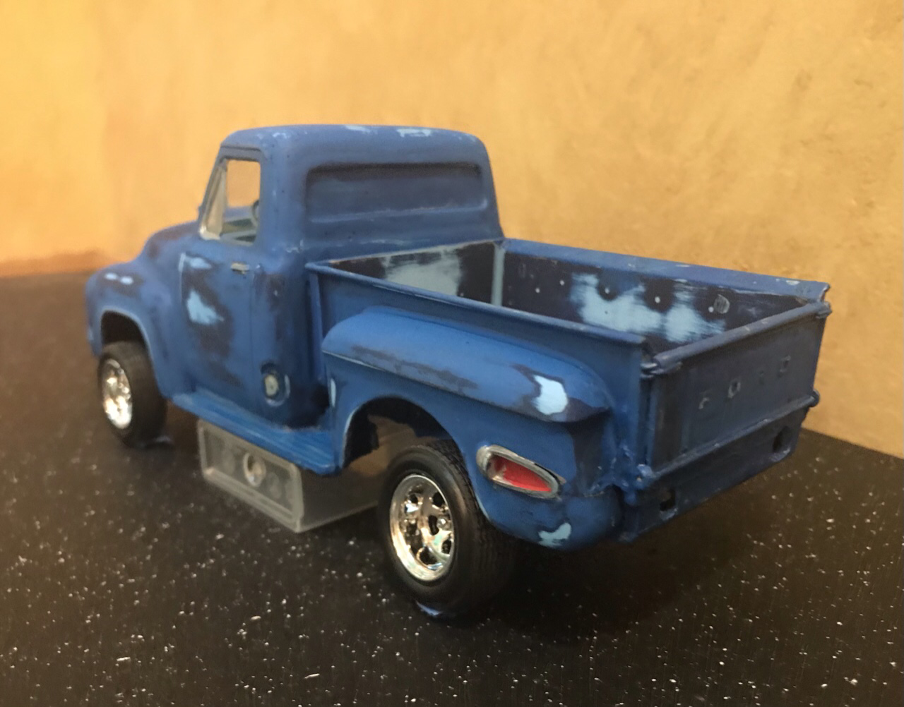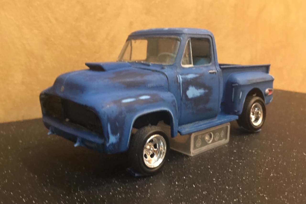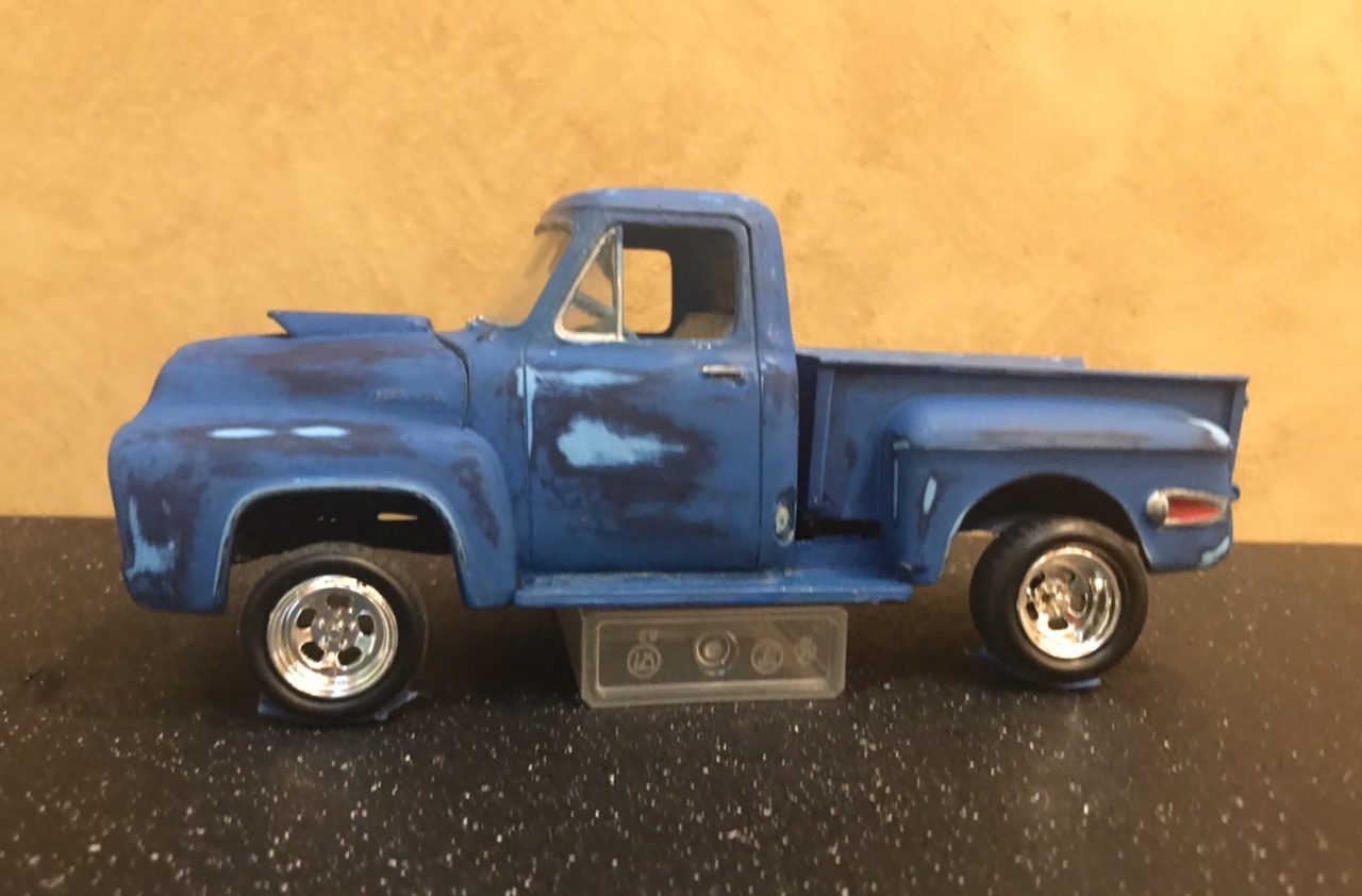 This old relic had been hiding in my 50s Ford Pickup junkyard box for a long time. I don’t even remember it’s origin. In model room maneuvers it wound up sitting on top of my TV where it sat and taunted me. So with the consensus of some Facebook friends I decided to bring her back over this rainy holiday weekend. Brish painted, chassis and all under hood panels painted silver... And some serious glue welding! There is no way to get it apart. That leaves me working around fixed glass and interior. It had no suspension at all. I did get the bed off and engine out. Some kid’s best work. So let’s see if we can make it smile... A bit of quality time at the sink and I wet sanded all the lumpy brush paint. I found an additional coat of dark blue underneath, which works fine for our intent. Added some more blue paint, and gave it all a coat of Testors Dullcote to see where we stand. I thought I’d leave a few of the signature bits.. kept the hood scoop and Chevy rear fenders with custom tail lights. It will retain the Desoto Hemi. My goal for today was to get it up on wheels. I went fishing in my parts box for new suspension parts and that’s when I found two issues.. our model’s chassis was broken on one side and it had no rear suspension mounts. So I fished out a new chassis and spliced the back half in. Note two things in the above photo.. I cut the chassis at two different points.. the break was the one closest to the cab, while the other was directly in front of the suspension mount. I wanted to eliminate a weak point on the frame from parallel cuts. I also drilled and pinned, then glued it all with gap filling thick CA. And all fixed! Splice is probably tougher than the rest of the frame. I will pop on the suspension in the morning.. I want to fiddle with ride height a bit! Just having fun...